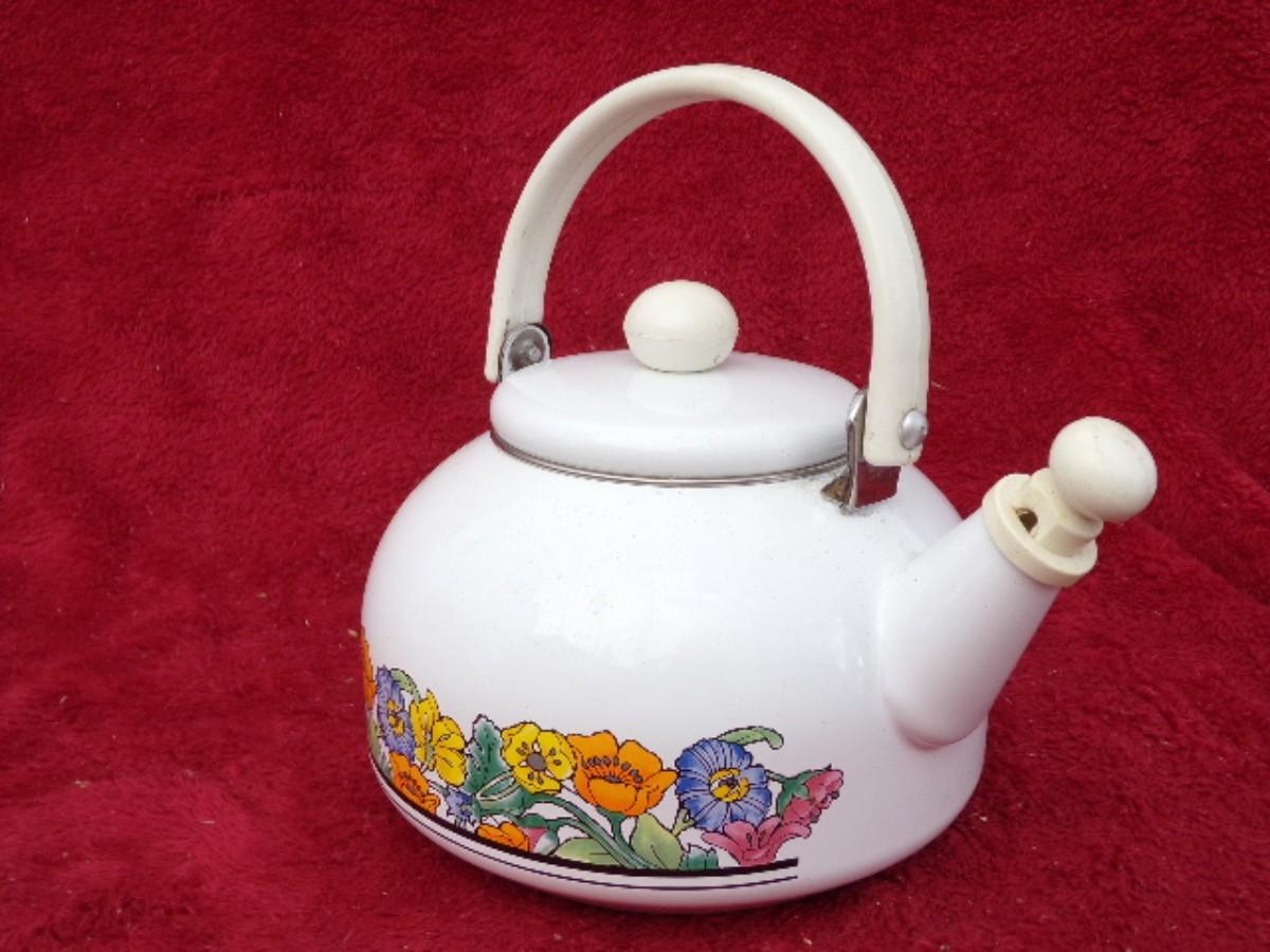 Classic decorative porcelain on steel tea kettle w/removable whistle and folding bail handle.