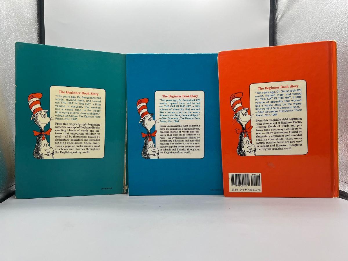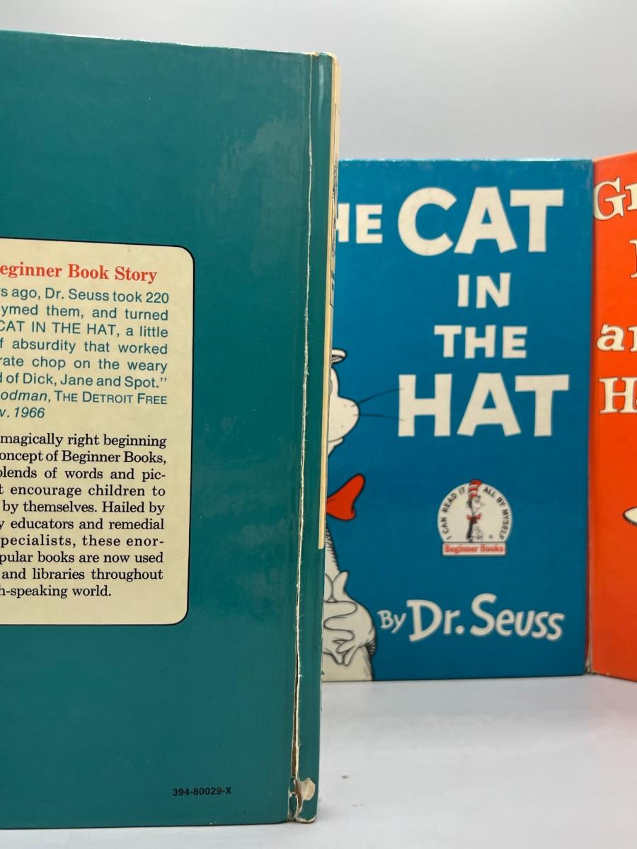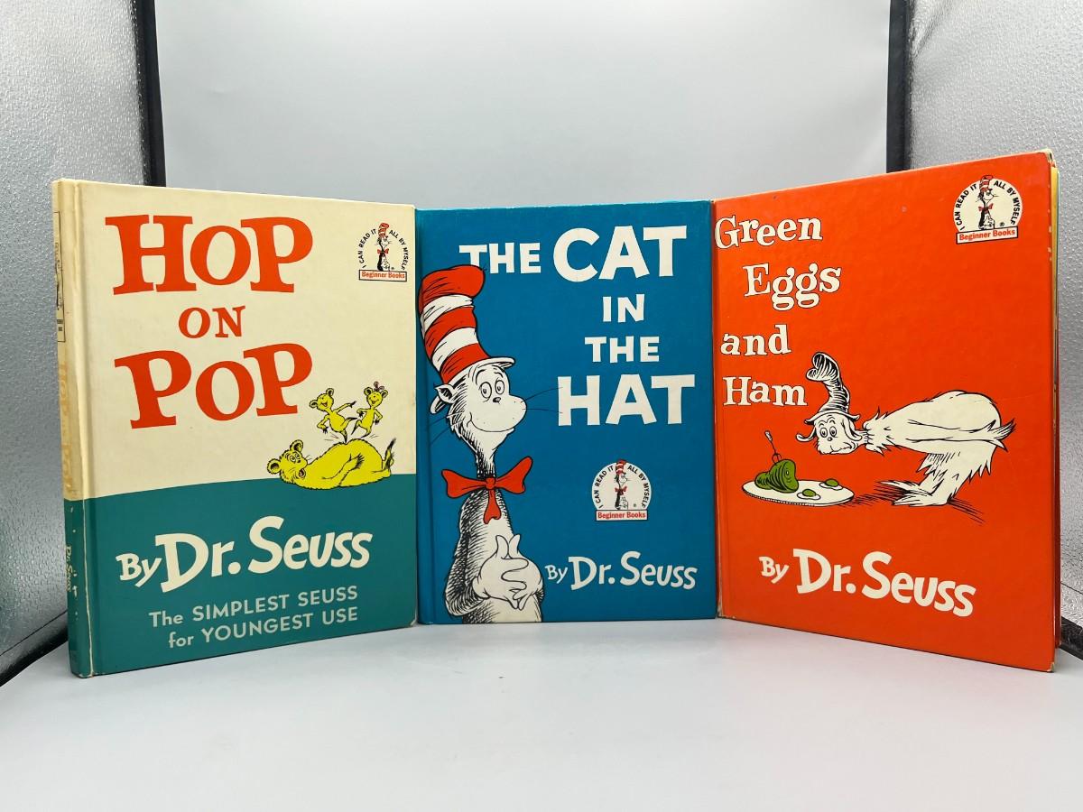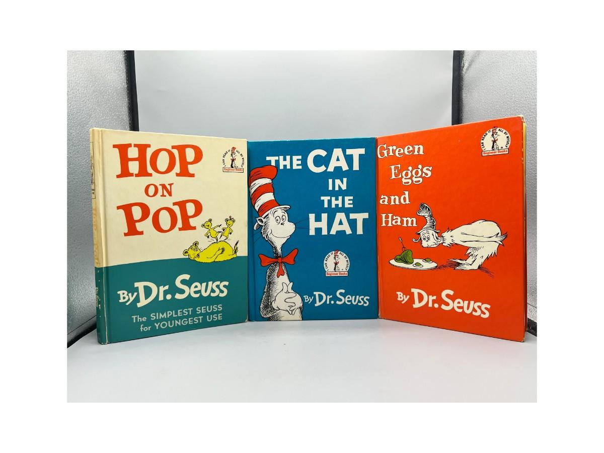 Classic Dr. Seuss Children's Books - Hop on Pop, The Cat in the Hat, & Green Eggs and Ham. In good well-read condition, wear at the spine.