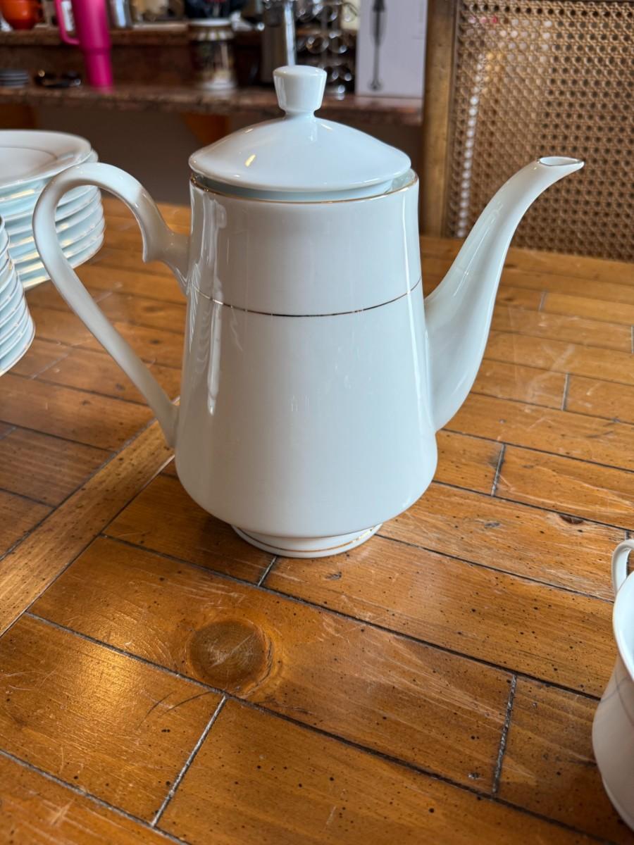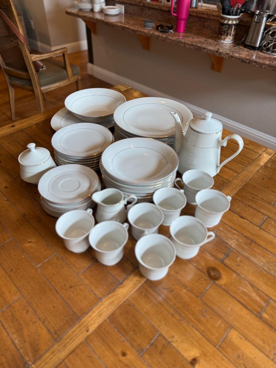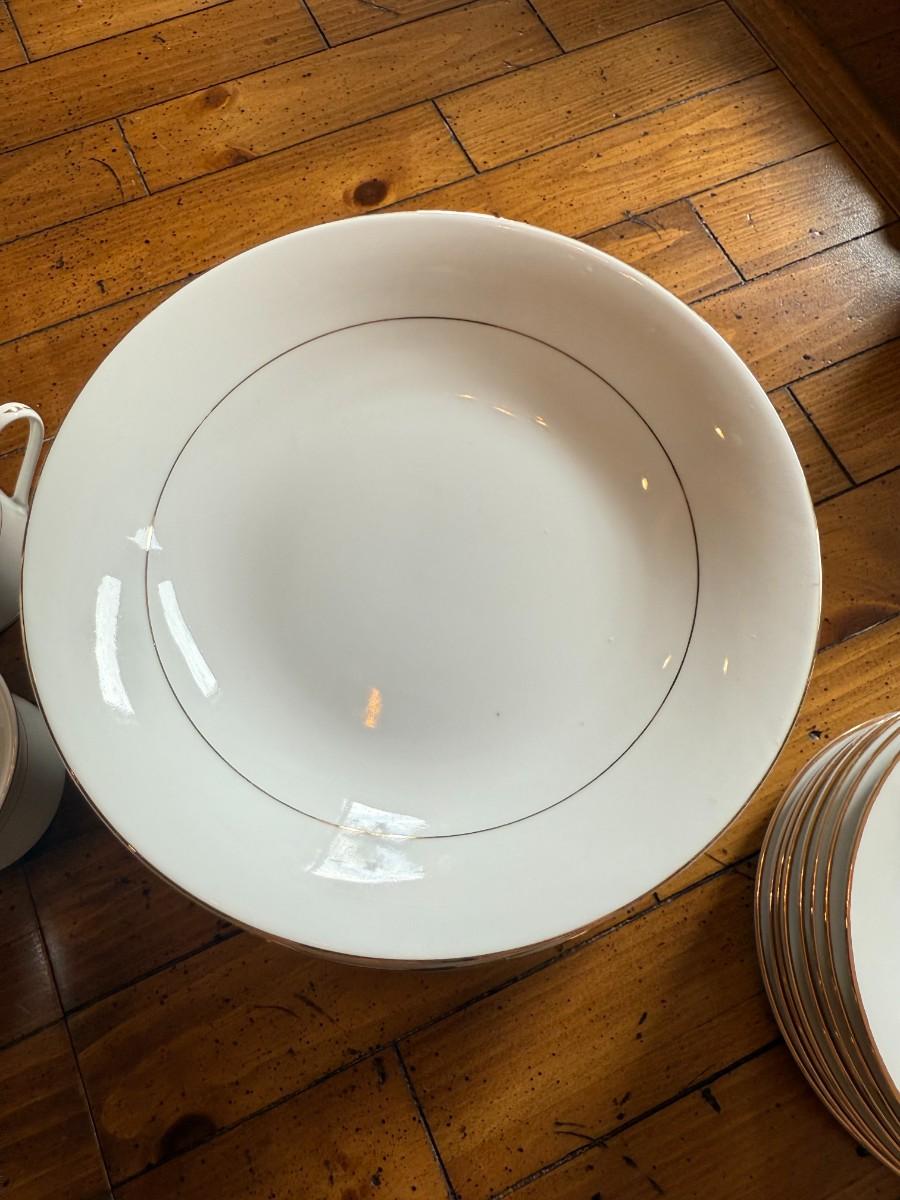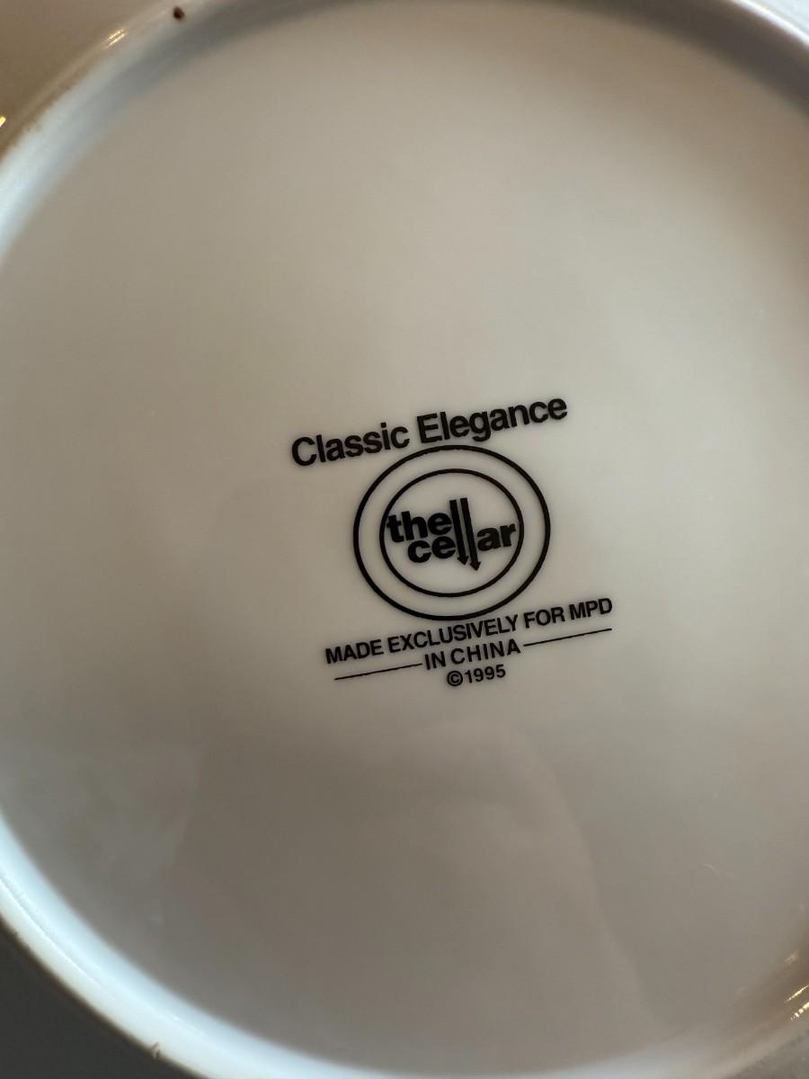 Timeless and refined, this 1995 “Classic Elegance” fine china set by The Cellar includes dinner plates, salad plates, bowls, cups, a teapot, creamer, sugar bowl, and serving pieces. White with a thin gold rim, perfect for formal dining or holiday gatherings.