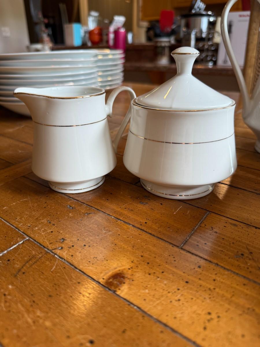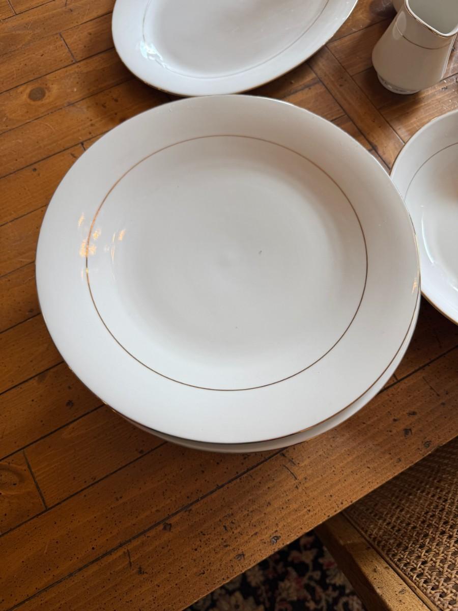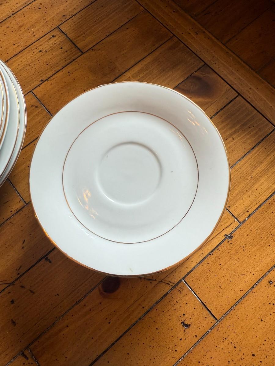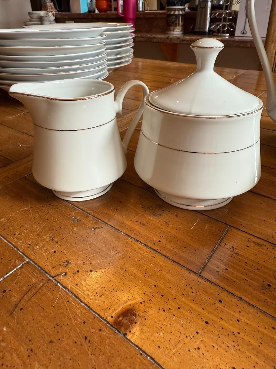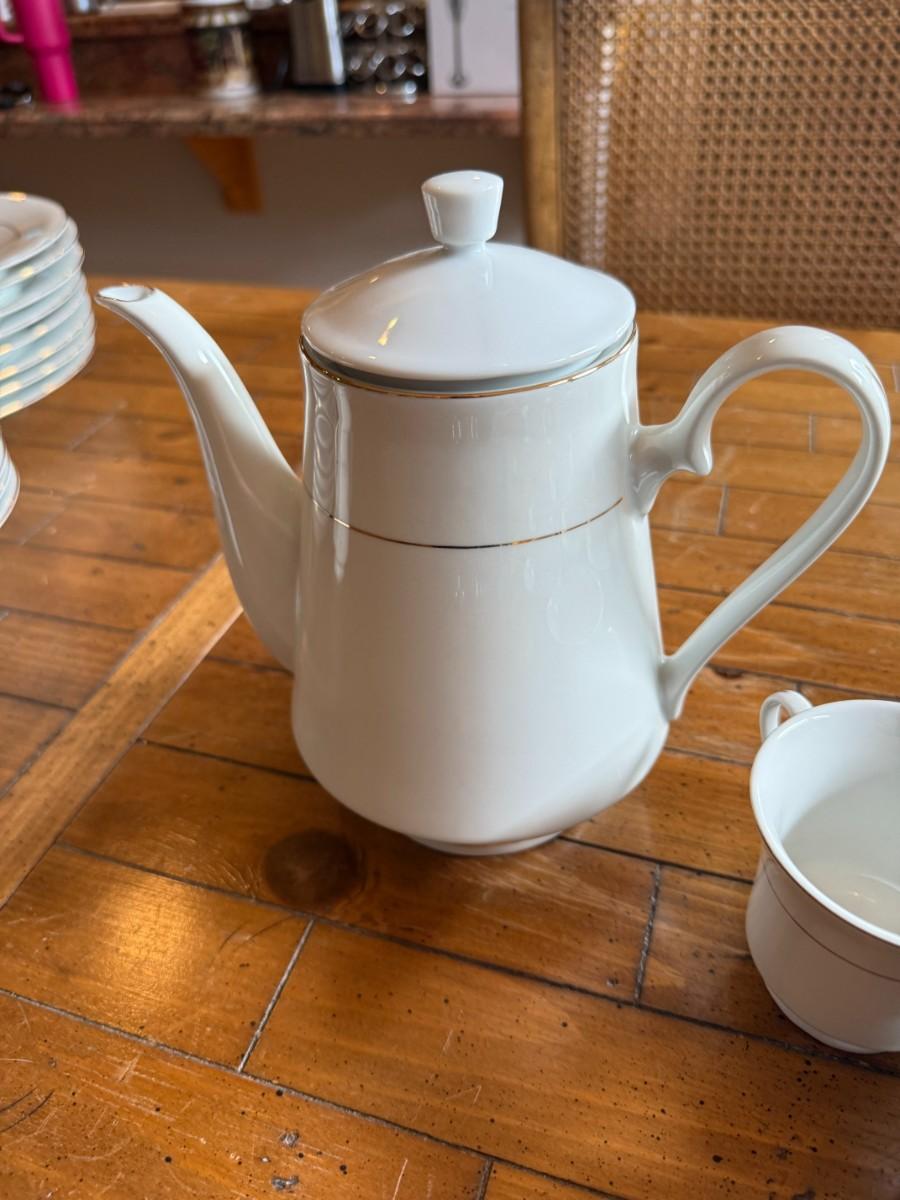 Timeless and refined, this 1995 “Classic Elegance” fine china set by The Cellar includes dinner plates, salad plates, bowls, cups, a teapot, creamer, sugar bowl, and serving pieces. White with a thin gold rim, perfect for formal dining or holiday gatherings.