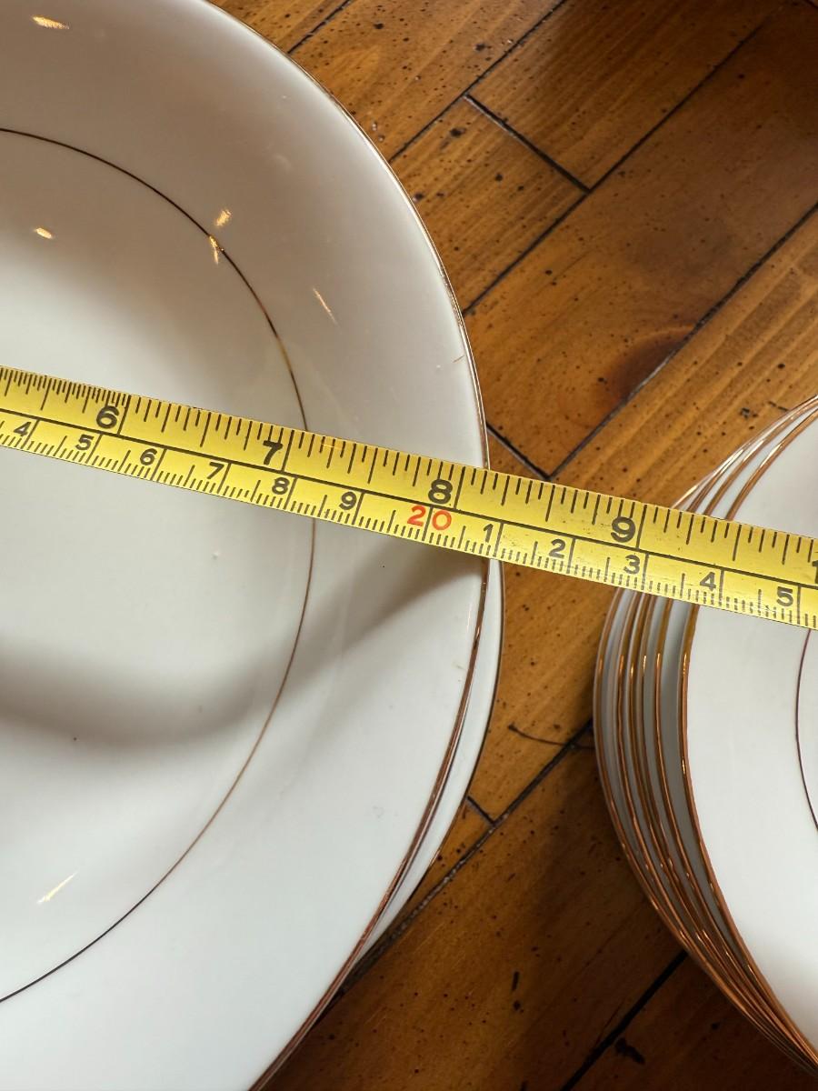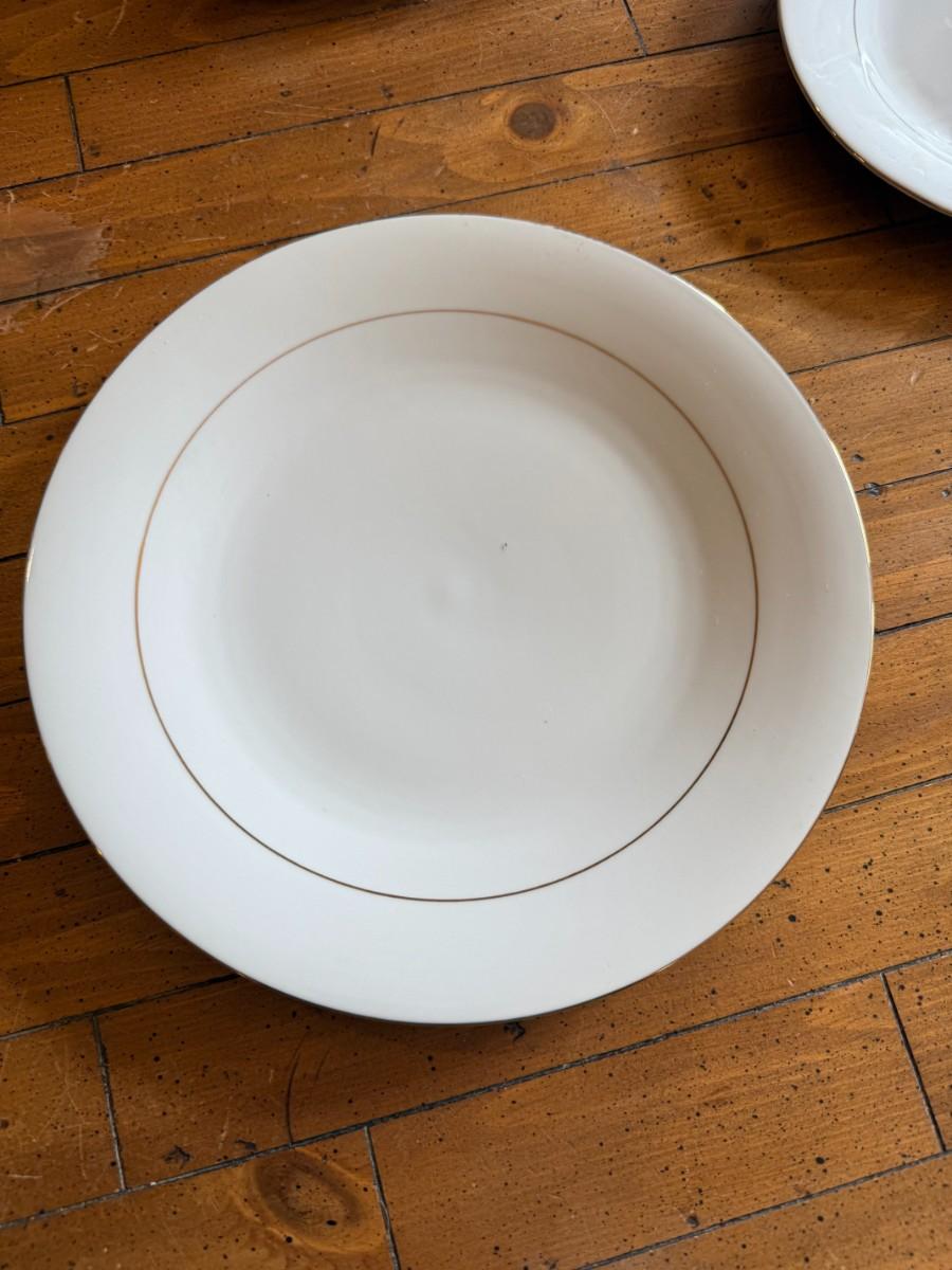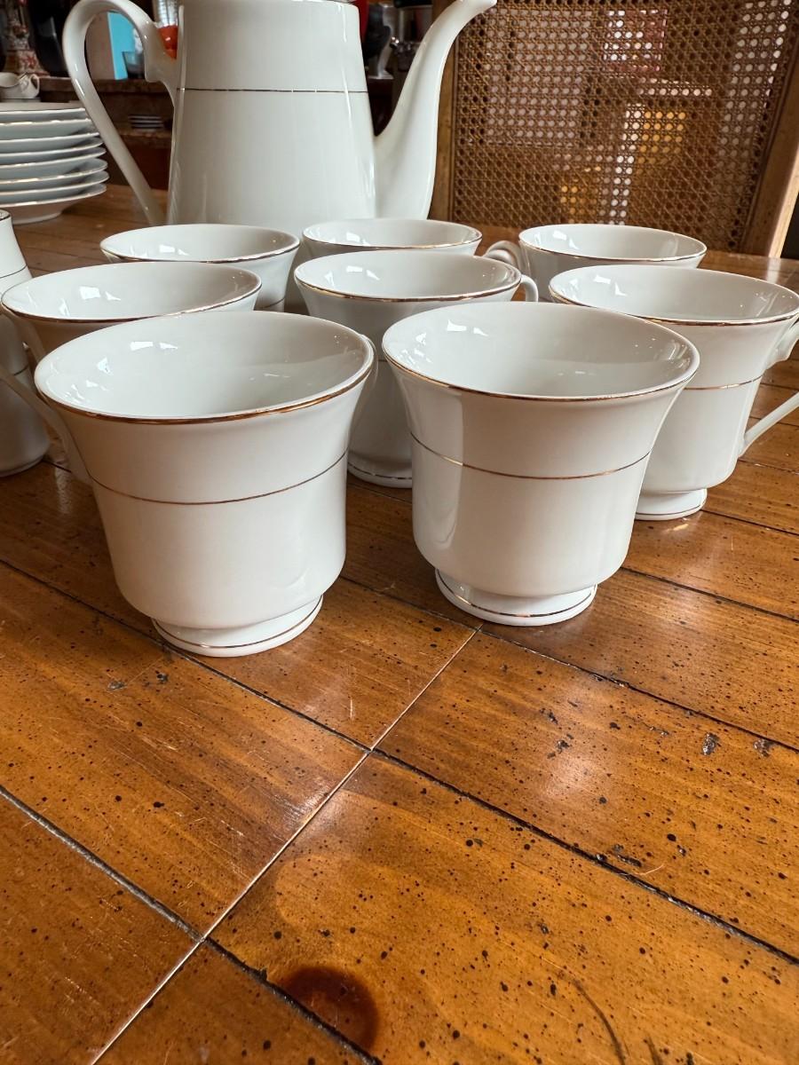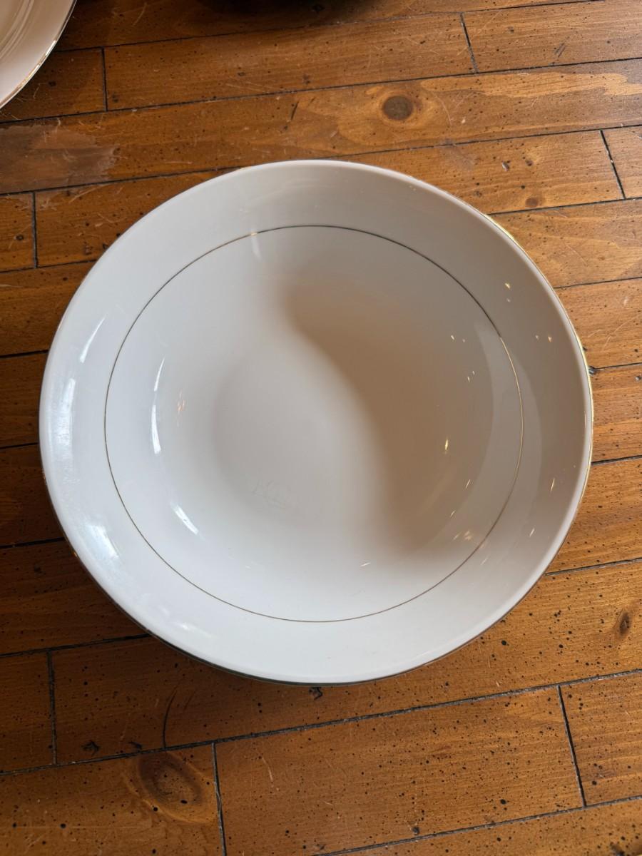 Timeless and refined, this 1995 “Classic Elegance” fine china set by The Cellar includes dinner plates, salad plates, bowls, cups, a teapot, creamer, sugar bowl, and serving pieces. White with a thin gold rim, perfect for formal dining or holiday gatherings.