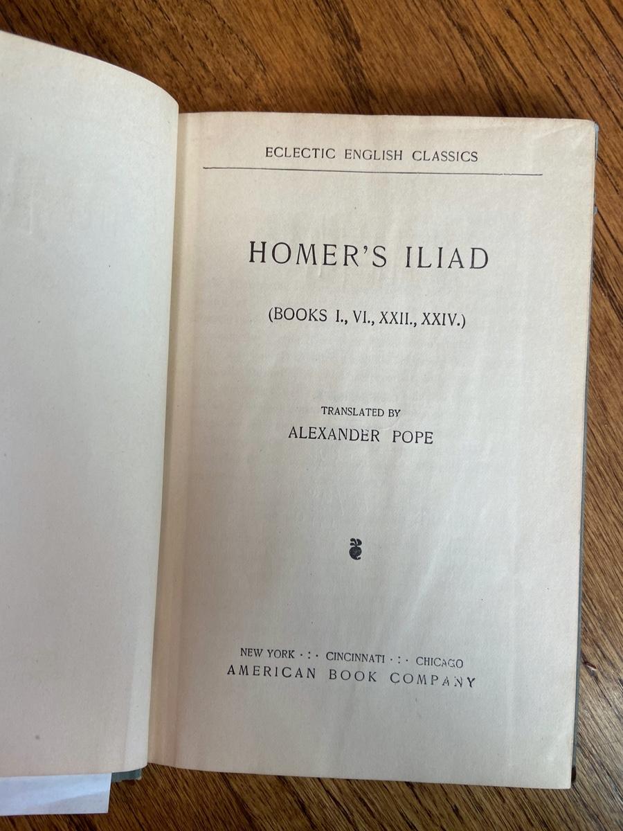 Homer's Iliad translated by Alexander Pope (1896), Published by the American Book Company. Blue Hardcover. Worn.