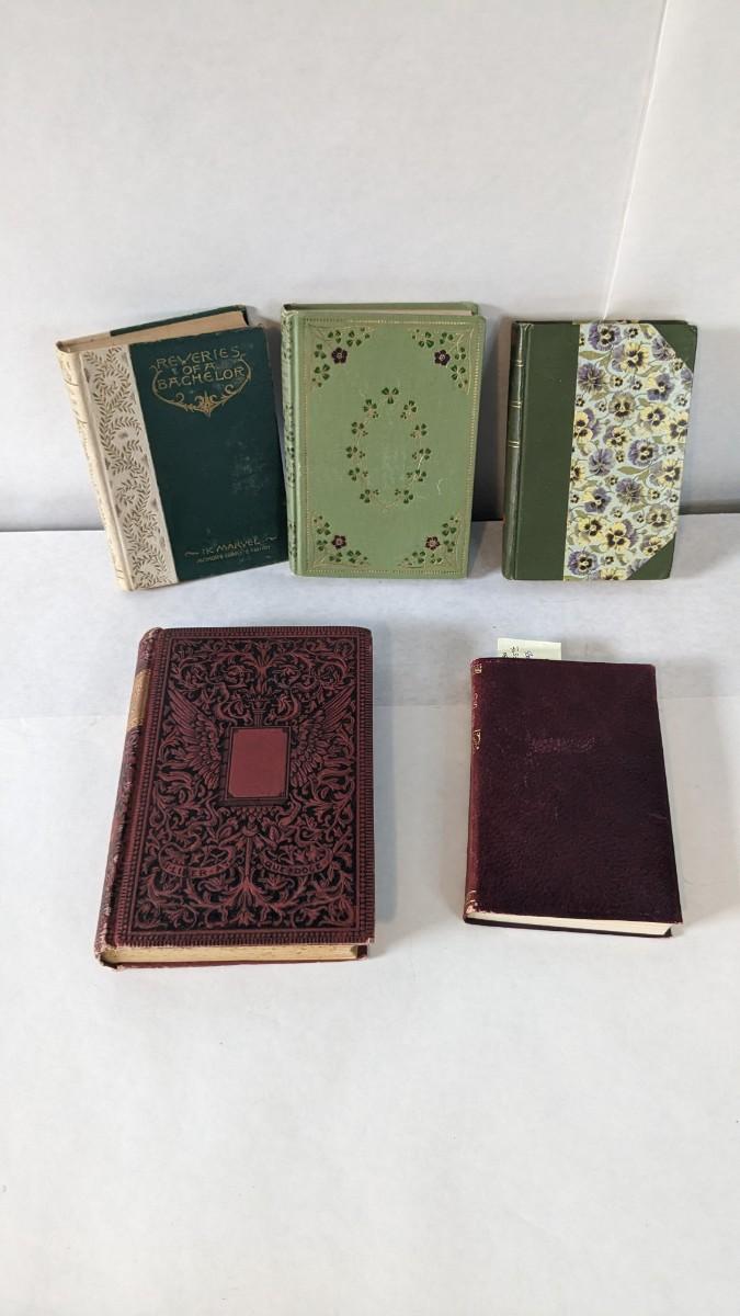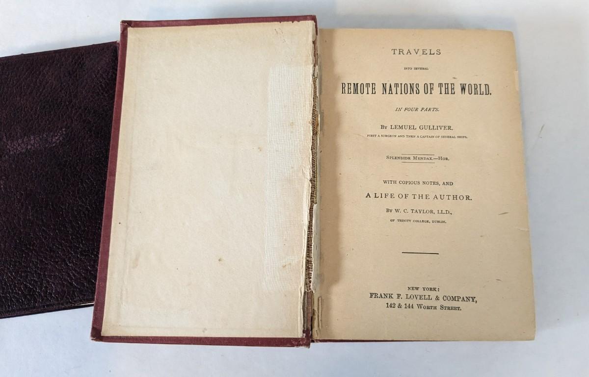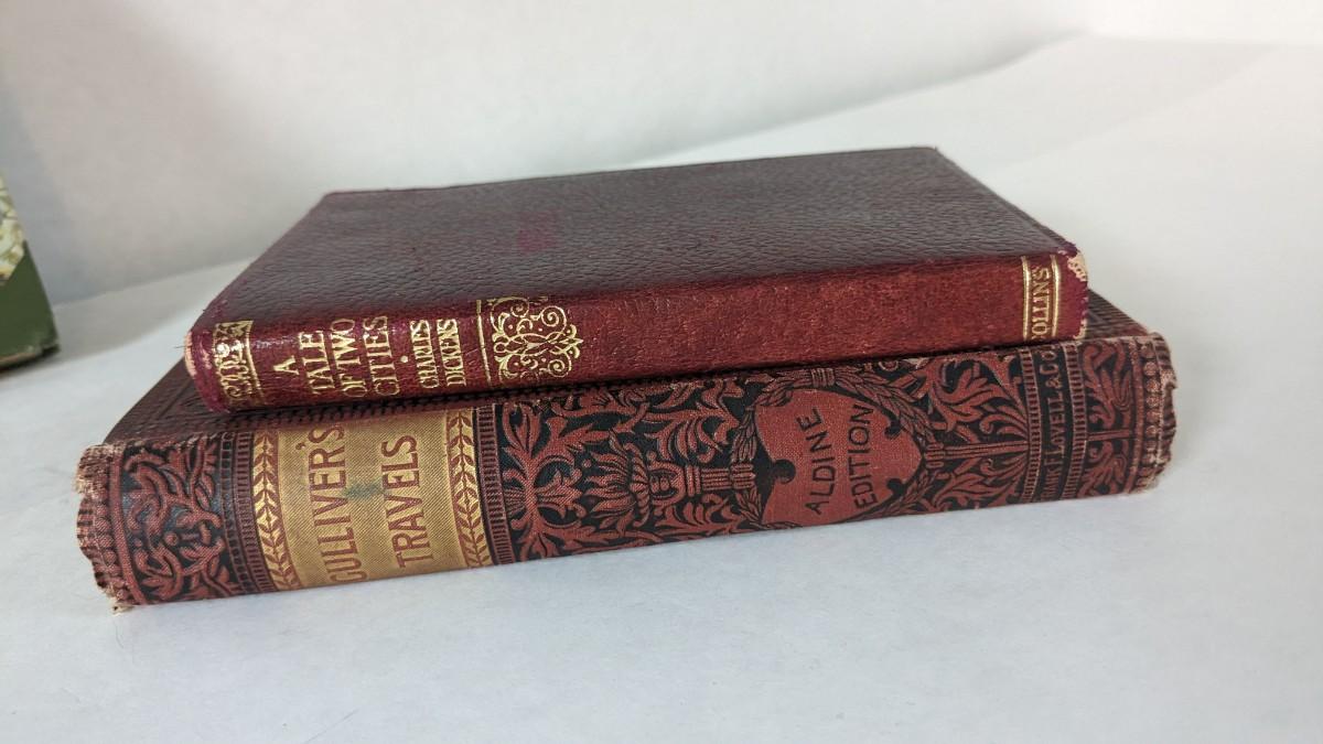 5 Titles. Includes leather bound Tale of Two Cities with gold edged pages, Aldine Edition Gulliver's Travels, and three other highly decorated cover books that are in great shape. This is a beautiful display assortment perfect for any collector