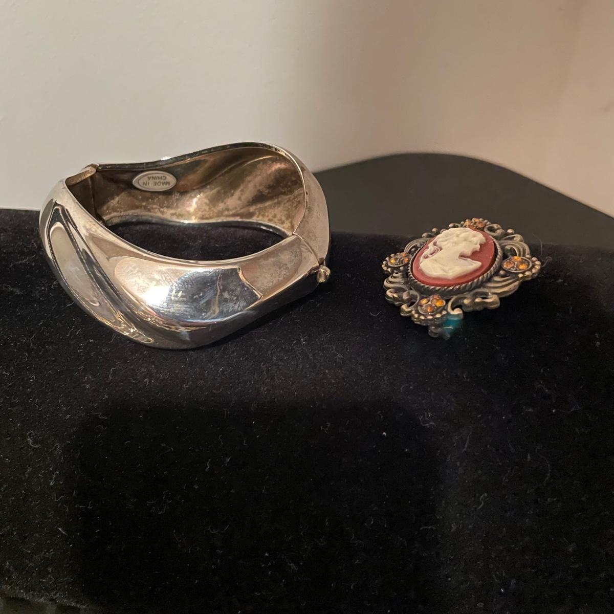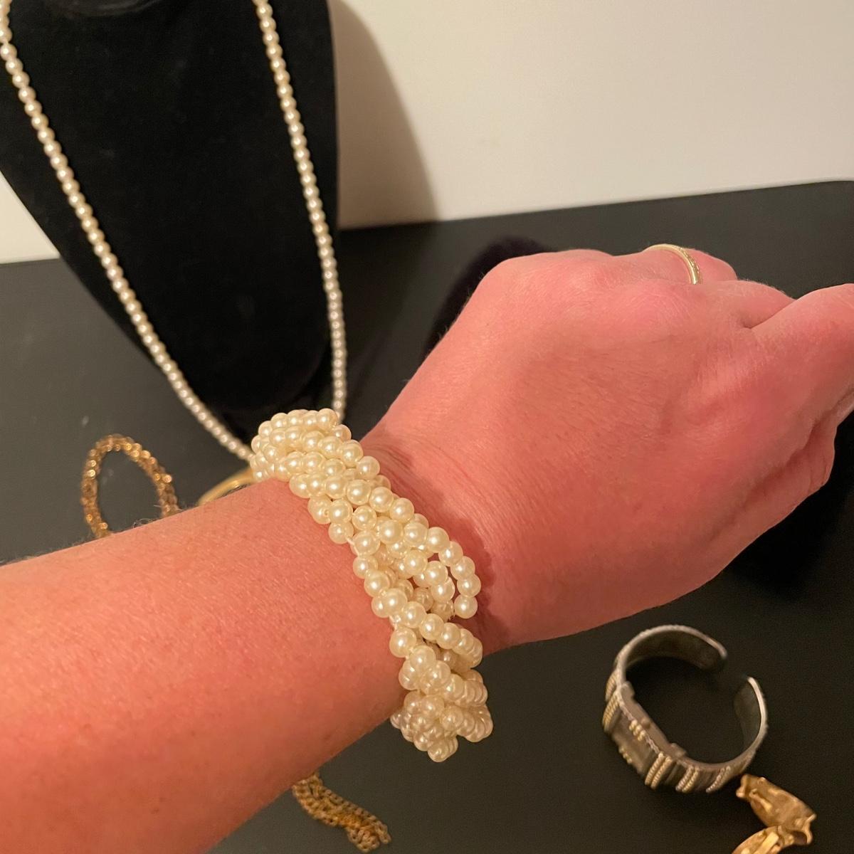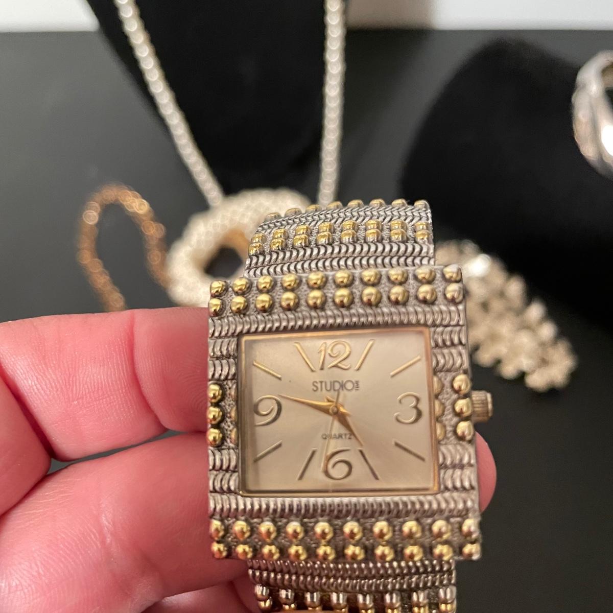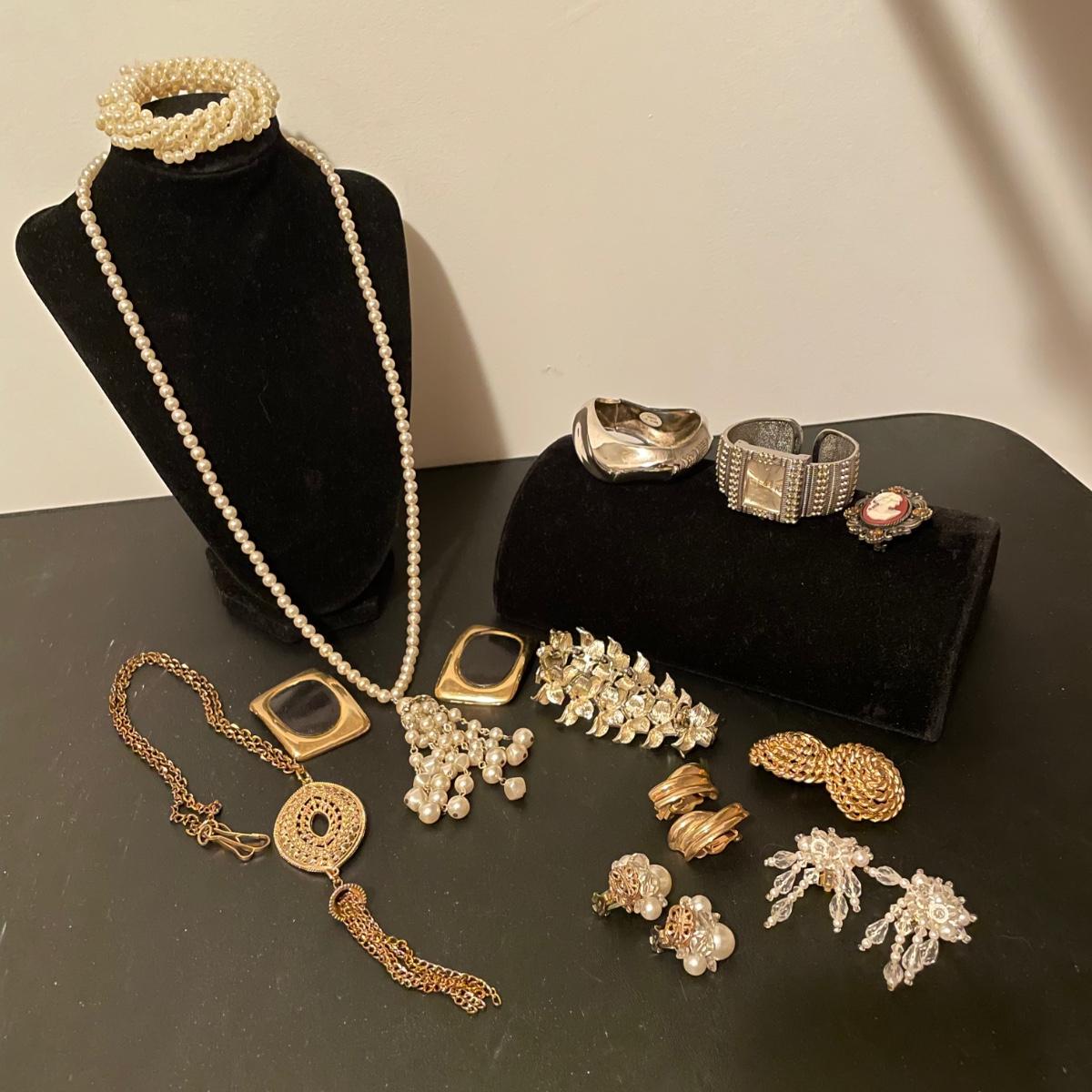 Classic selections of modern and vintage-style jewelry. Lot includes Studio Time Cuff watch, lingerie clips, a pearly elastic and two silver colored metal bracelets. We’re also offering a glasses chain and four pairs of clip earrings. The pearly necklace is 30” long. See images. Watch appears to need battery. Shipping available.