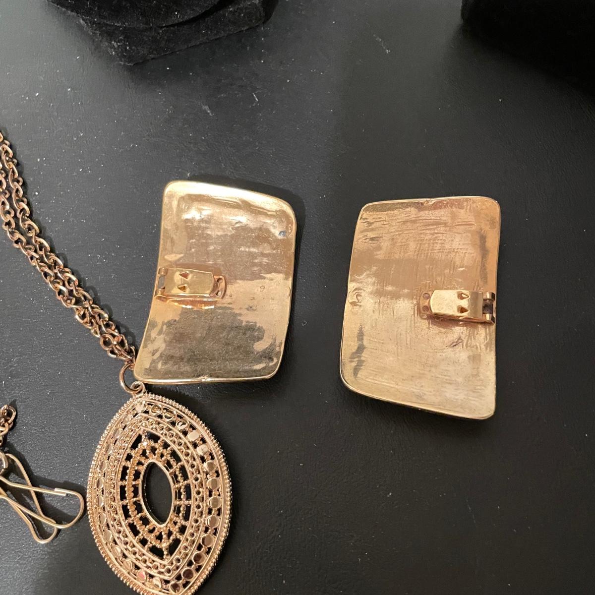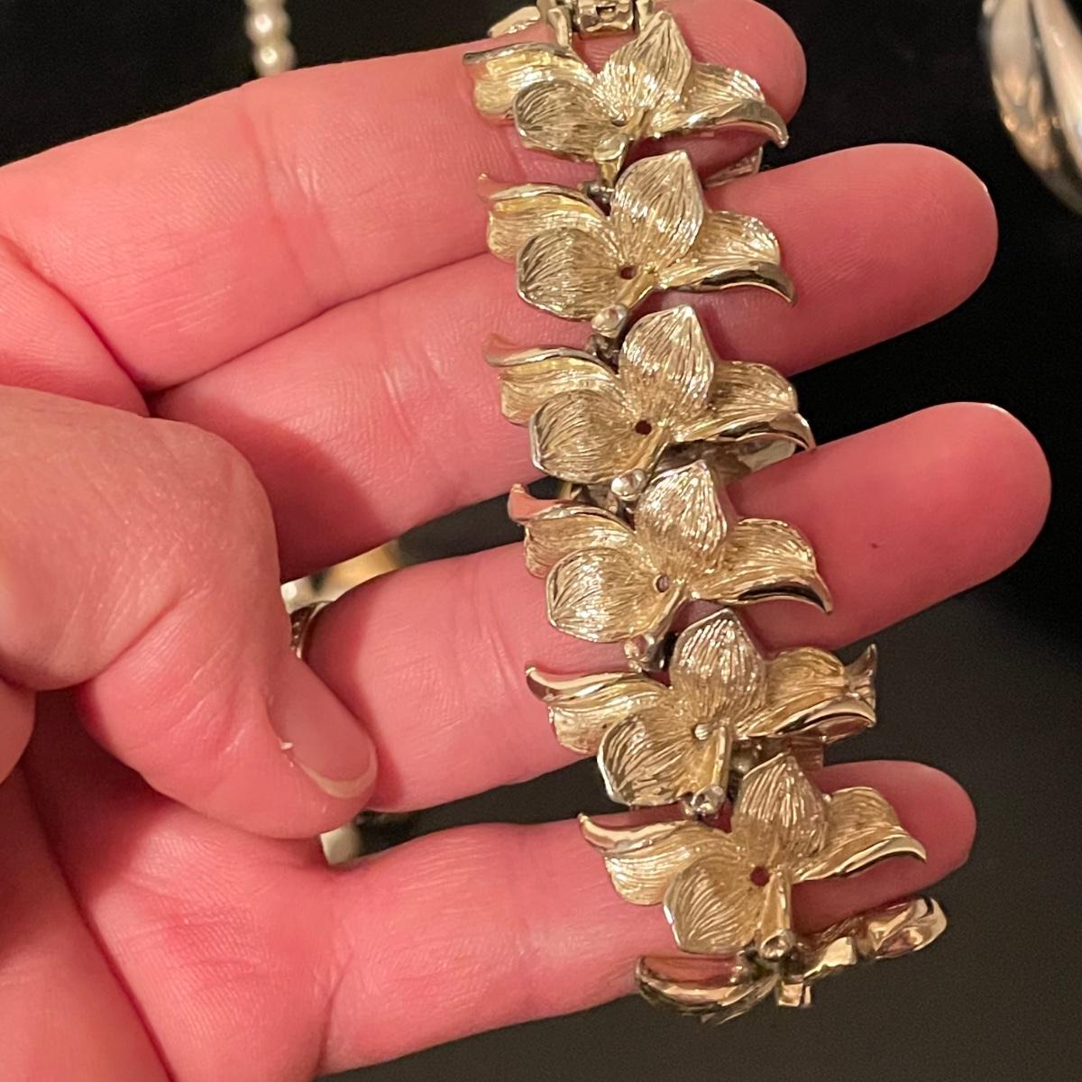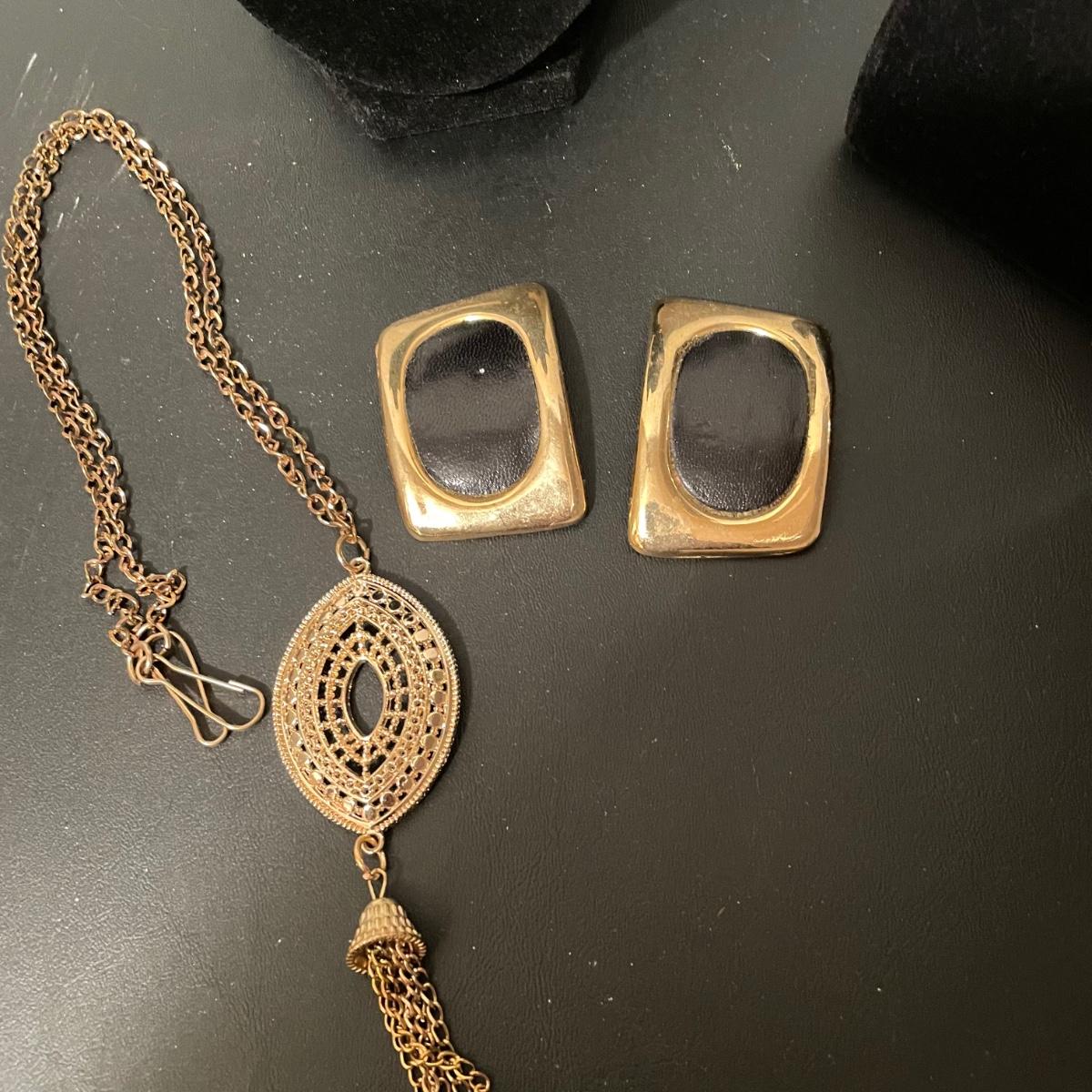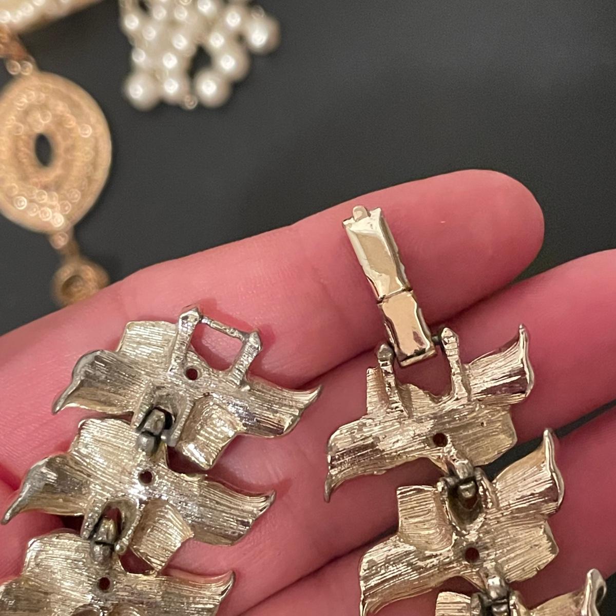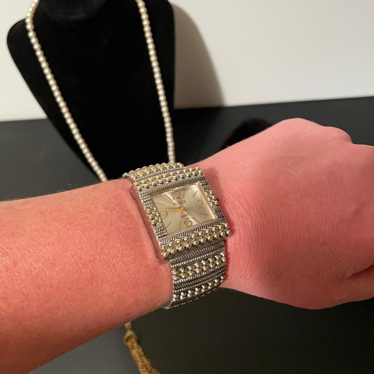Classic selections of modern and vintage-style jewelry. Lot includes Studio Time Cuff watch, lingerie clips, a pearly elastic and two silver colored metal bracelets. We’re also offering a glasses chain and four pairs of clip earrings. The pearly necklace is 30” long. See images. Watch appears to need battery. Shipping available.