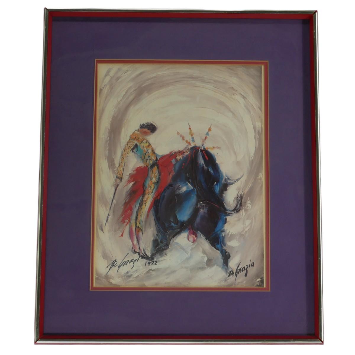 Stunning print of DeGrazia's original "Classic Natural" oil on canvas, 1966. Double signed, one print signature and one handwritten signature, "DeGrazia 1973". Scene depicts matador with large black bull. Professionally framed with gorgeous purple and red motifs to match the painting. In excellent condition. Matting has slight fading due to age. Artwork measures 11.75" x 16". Total frame measures 20" x 24" x 1.5". (A9)