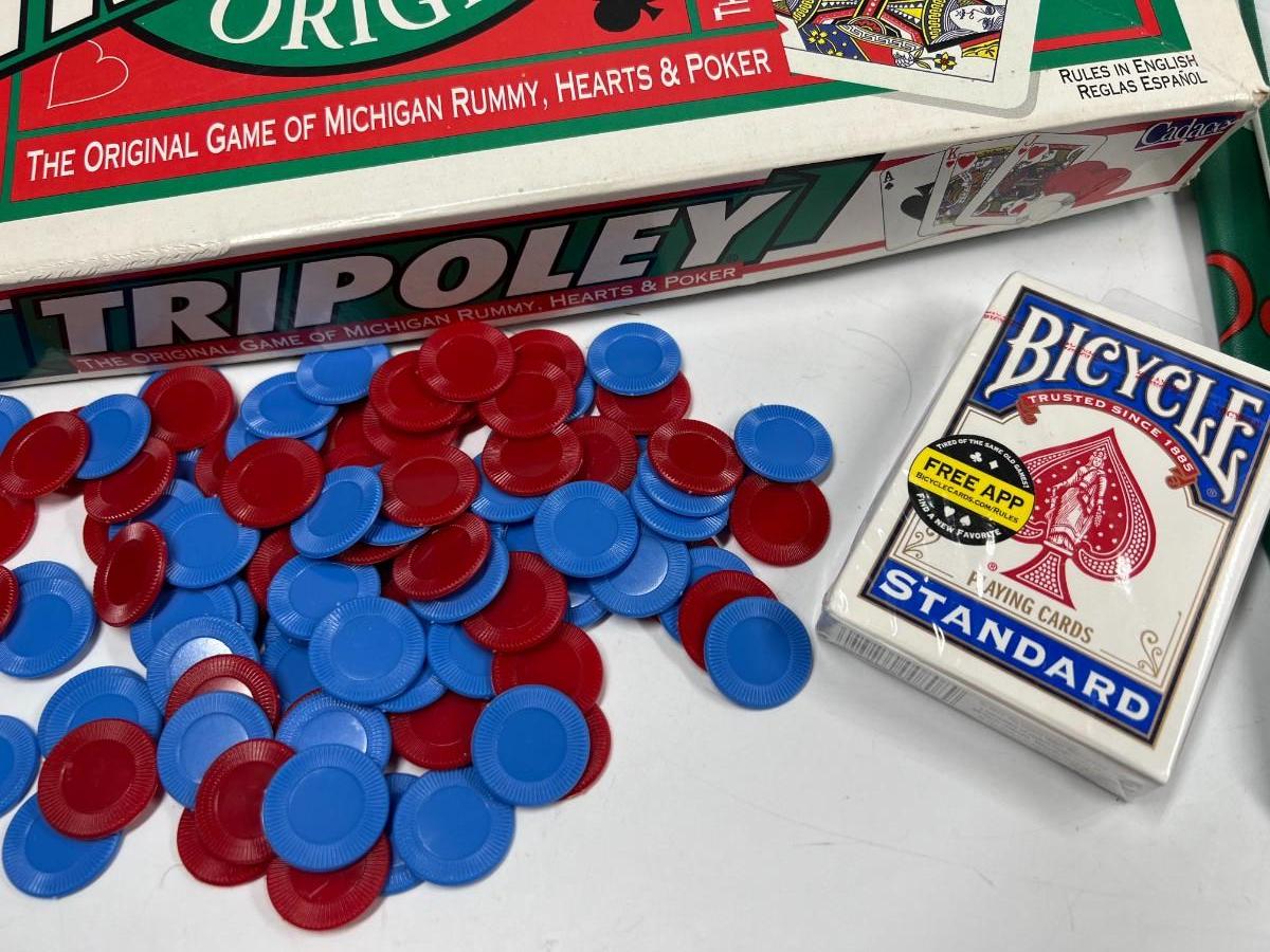 Classic Original Tripoley Card Game. Complete, some wear to game table cover edge.