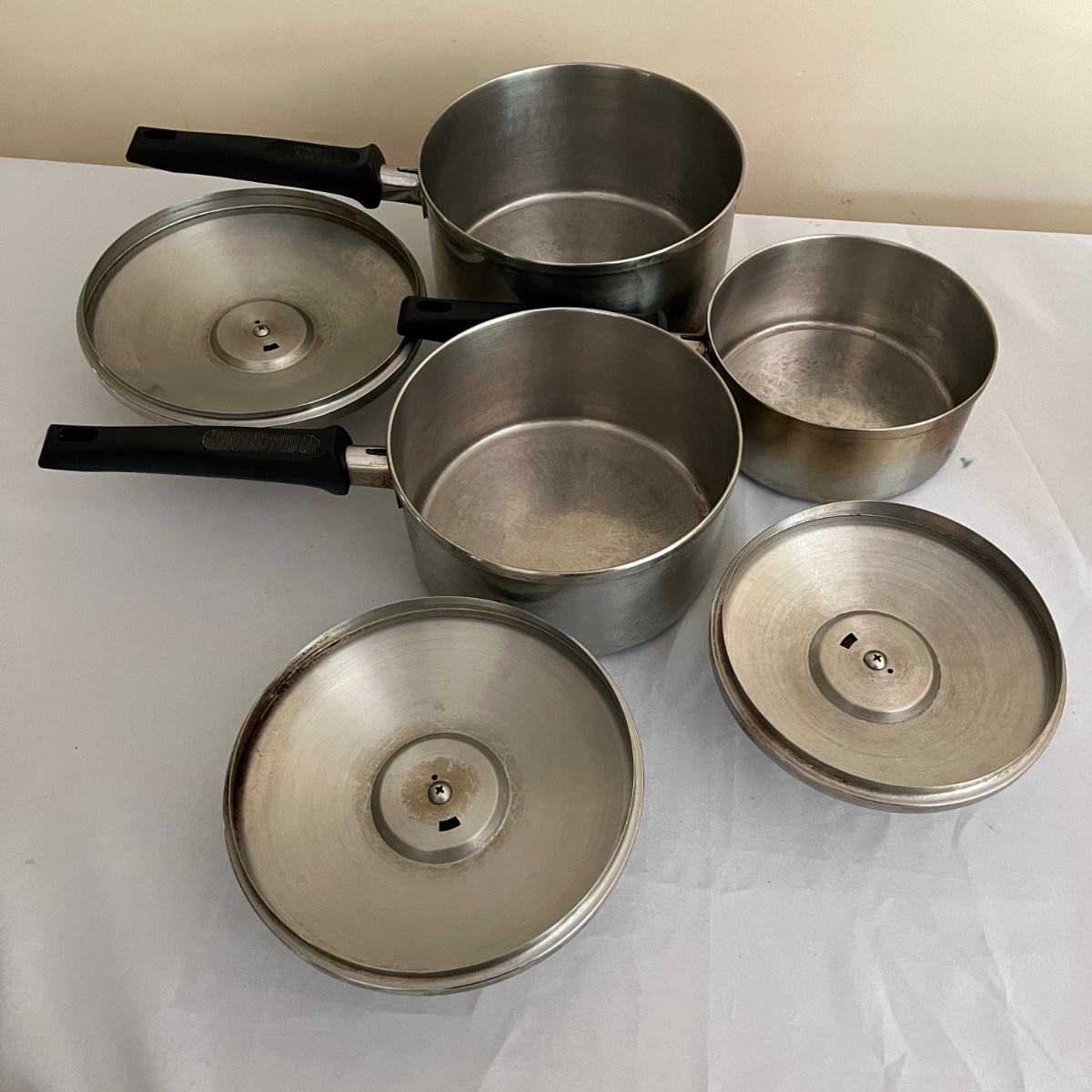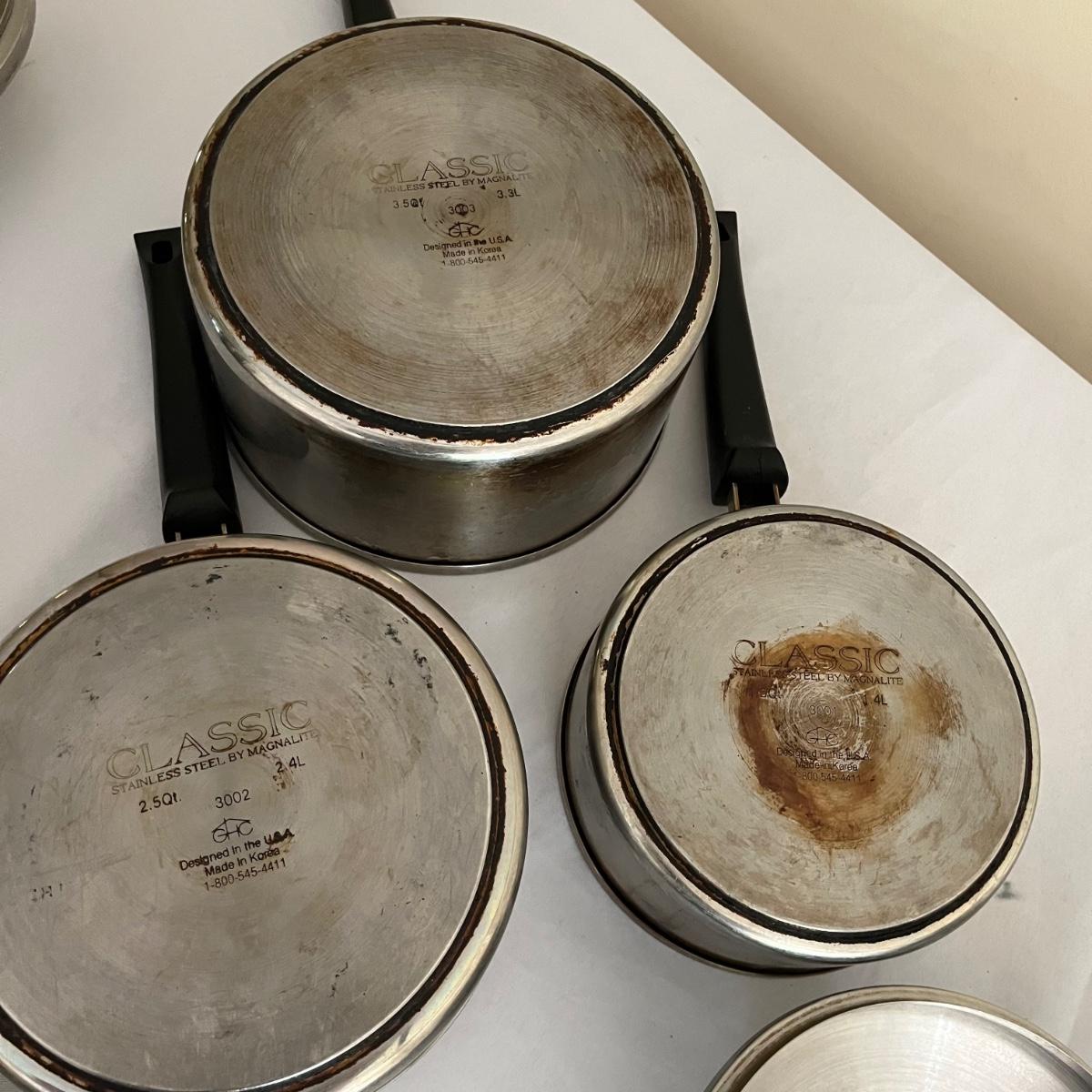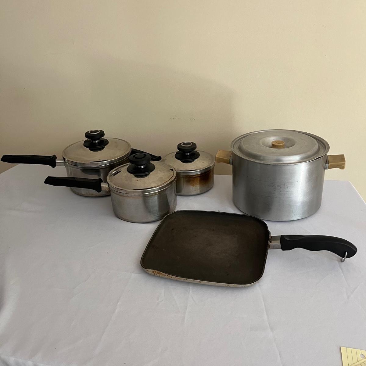 Lot includes three Classic pots with lids, Aguluxe aluminum pot with lid and a Revere Ware skillet. Pot measures 10”D x 7”.