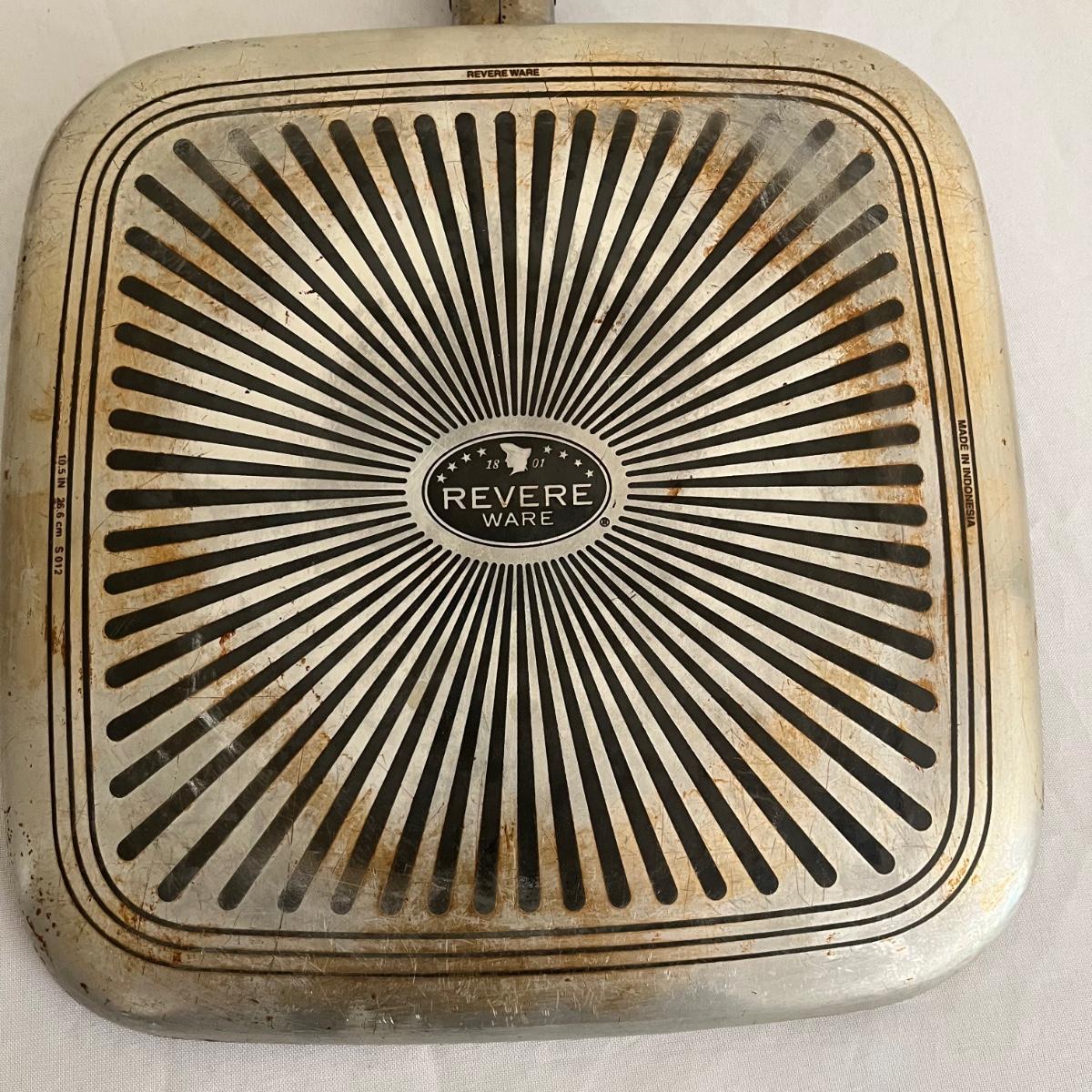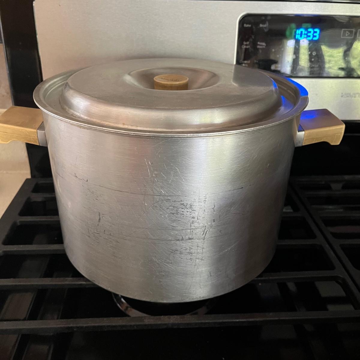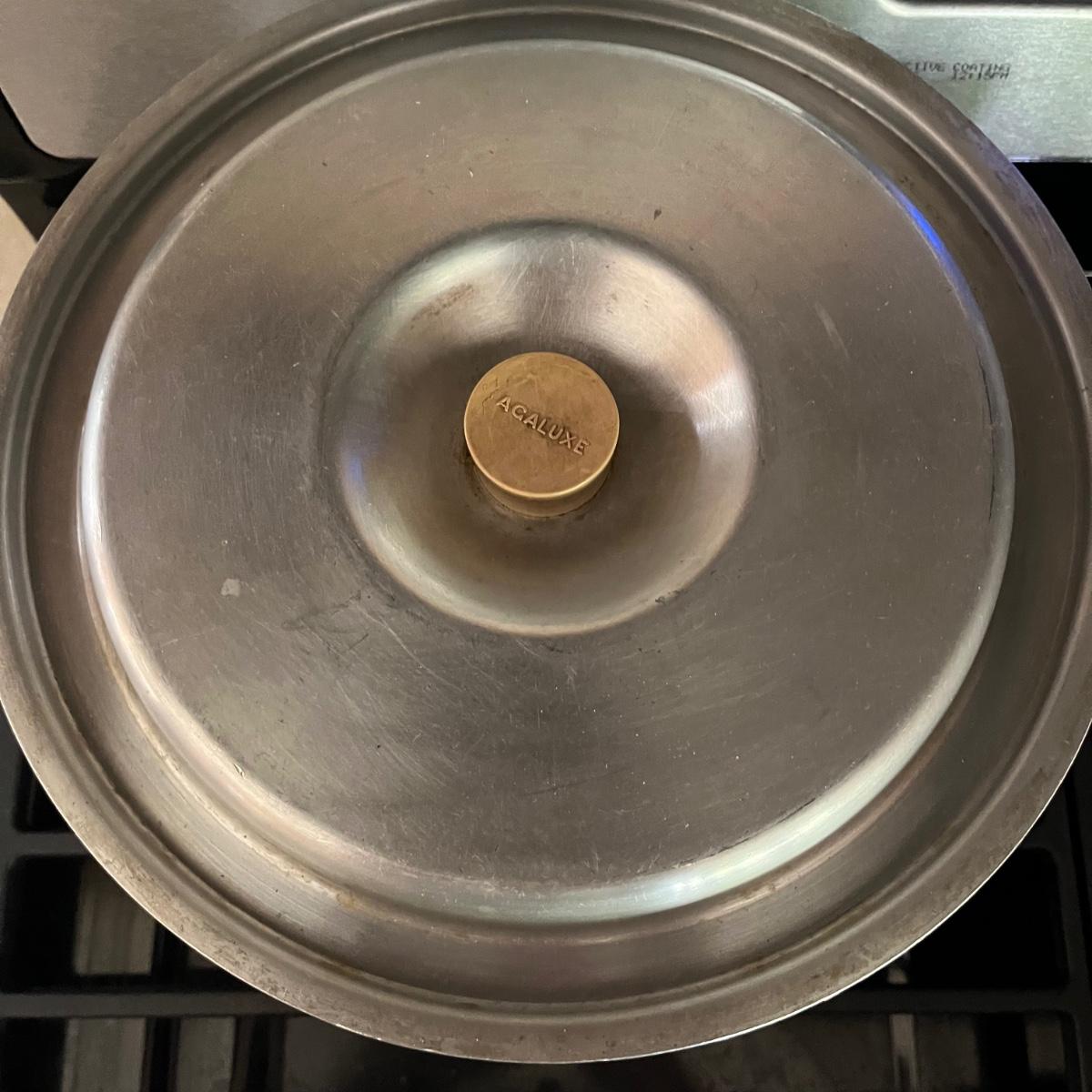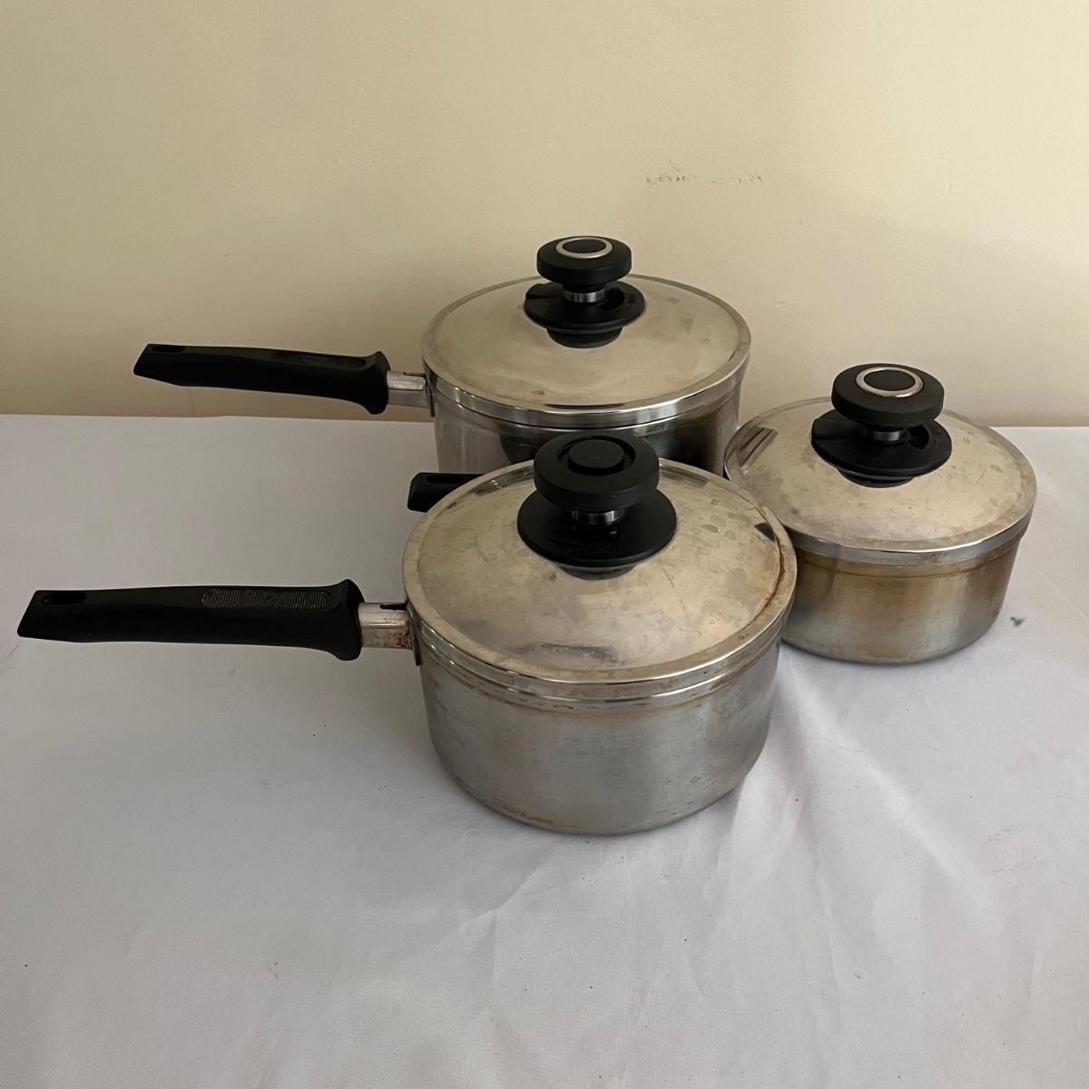 Lot includes three Classic pots with lids, Aguluxe aluminum pot with lid and a Revere Ware skillet. Pot measures 10”D x 7”.