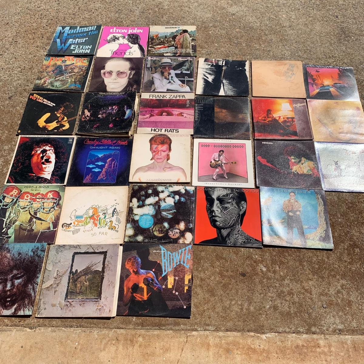 This lots contains approximately 30 classic rock vinyl records from the 1960s & “˜70s. Many of the albums are multi-record sets. Here you’ll find music from artists like David Bowie, Elton John, Pink Floyd, Jimi Hendrix, The Rolling Stones, Eric Clapton, The Who, Neil Young, Led Zeppelin, Frank Zappa, & more. The Rolling Stones’ “Tattoo You” and Elton John’s “Caribou” only have the album cover, not the records. The records are all in used condition. Shipping available.