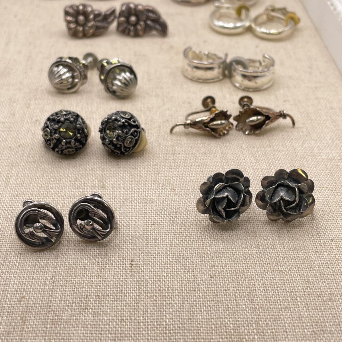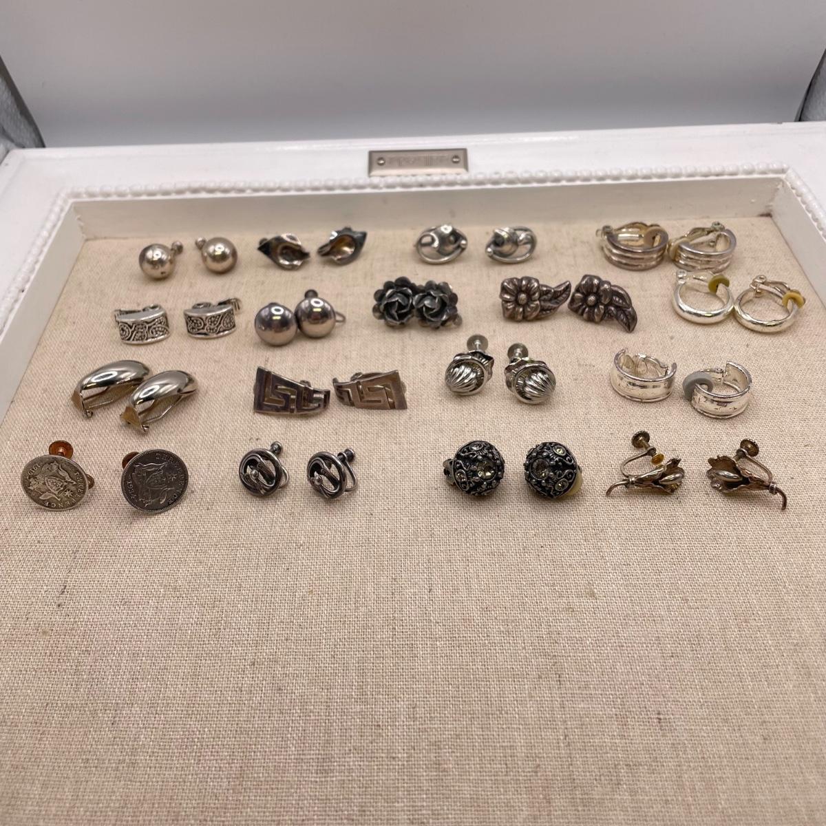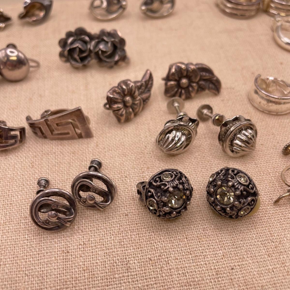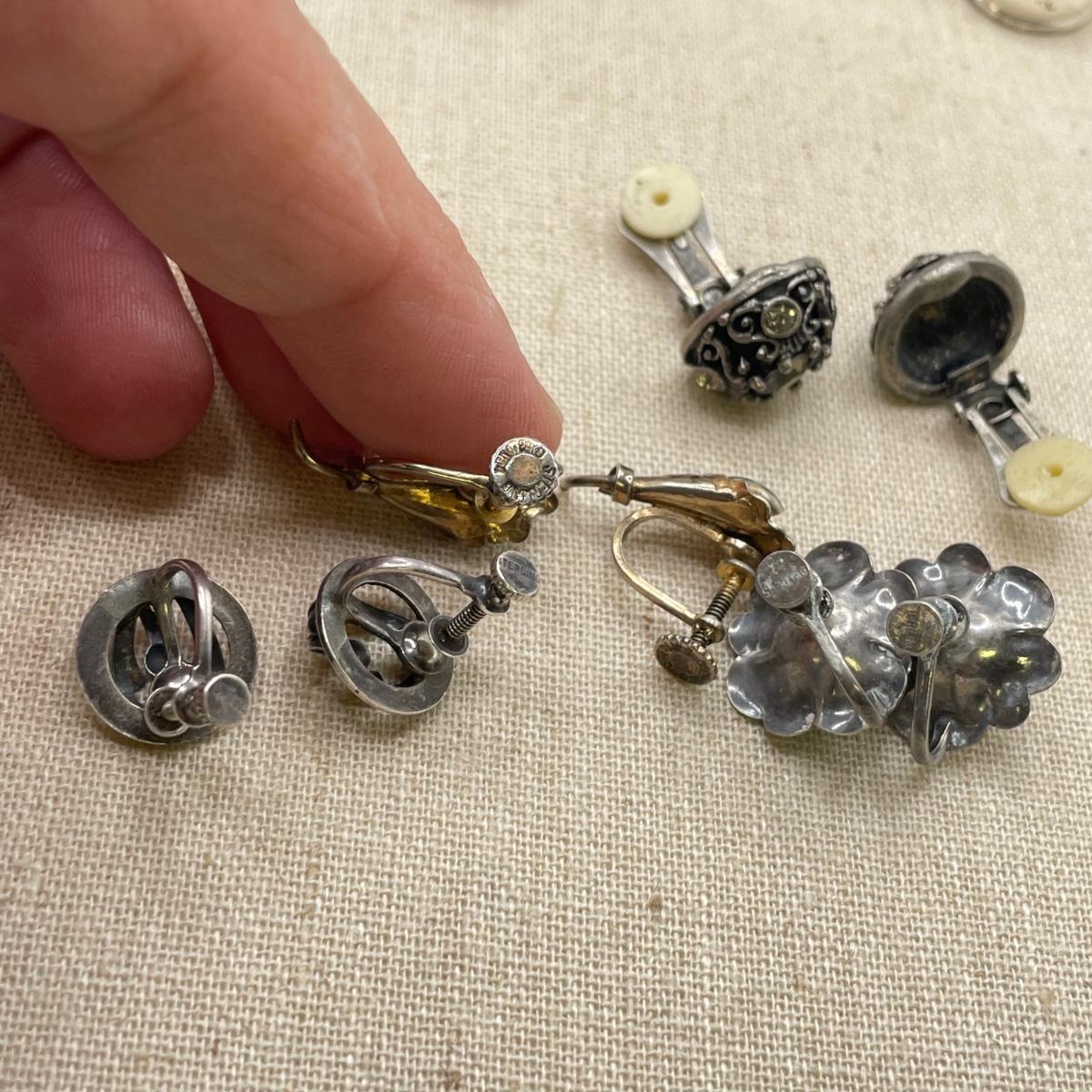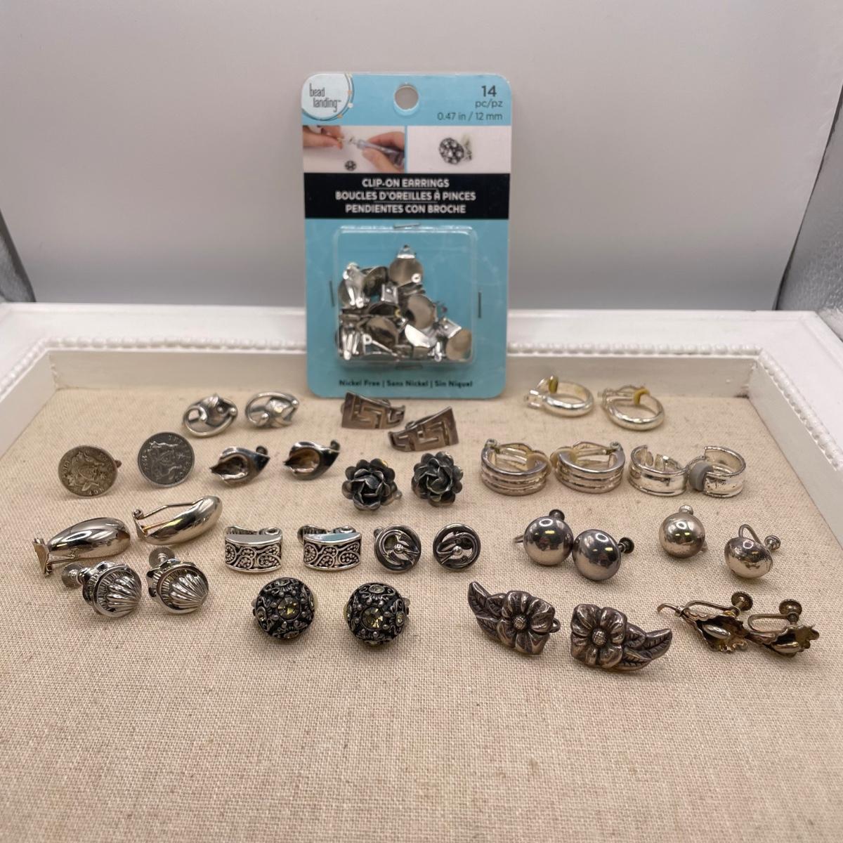 Over 15 pairs of silver colored clip earrings with a modern feel. Seven pairs have screw backings that are marked Sterling, there is also a Native American style pair marked 925. Lot also includes a sealed 14pc clip on backing set. See images. Shipping available. All sales are final. No returns or refunds. Please bid accordingly.