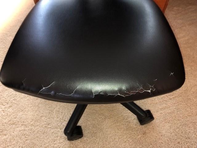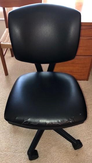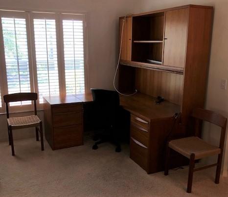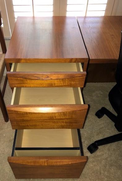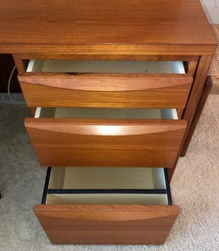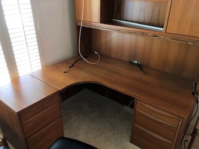 This desk comes apart in multiple pieces and includes a separate office chair (with some cracking) and two teak woven seat side chairs in excellent condition. Little surface wear on this desk