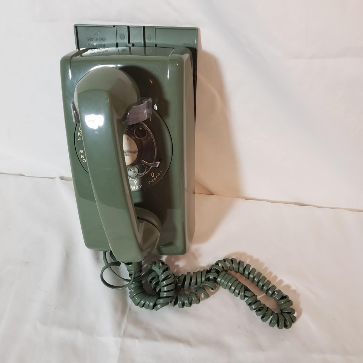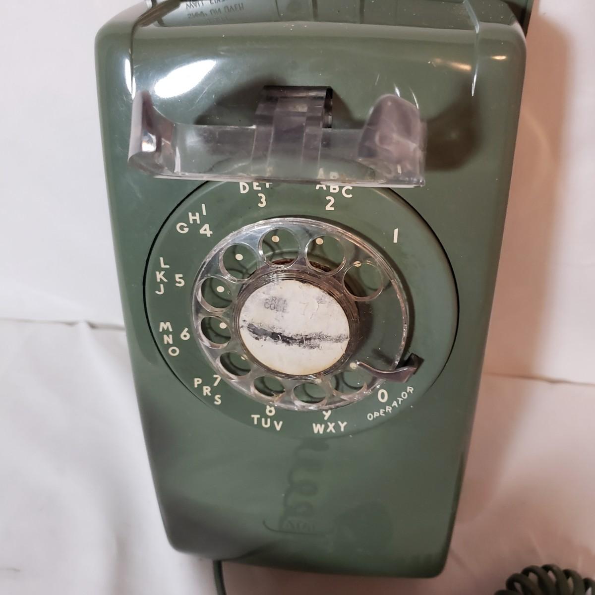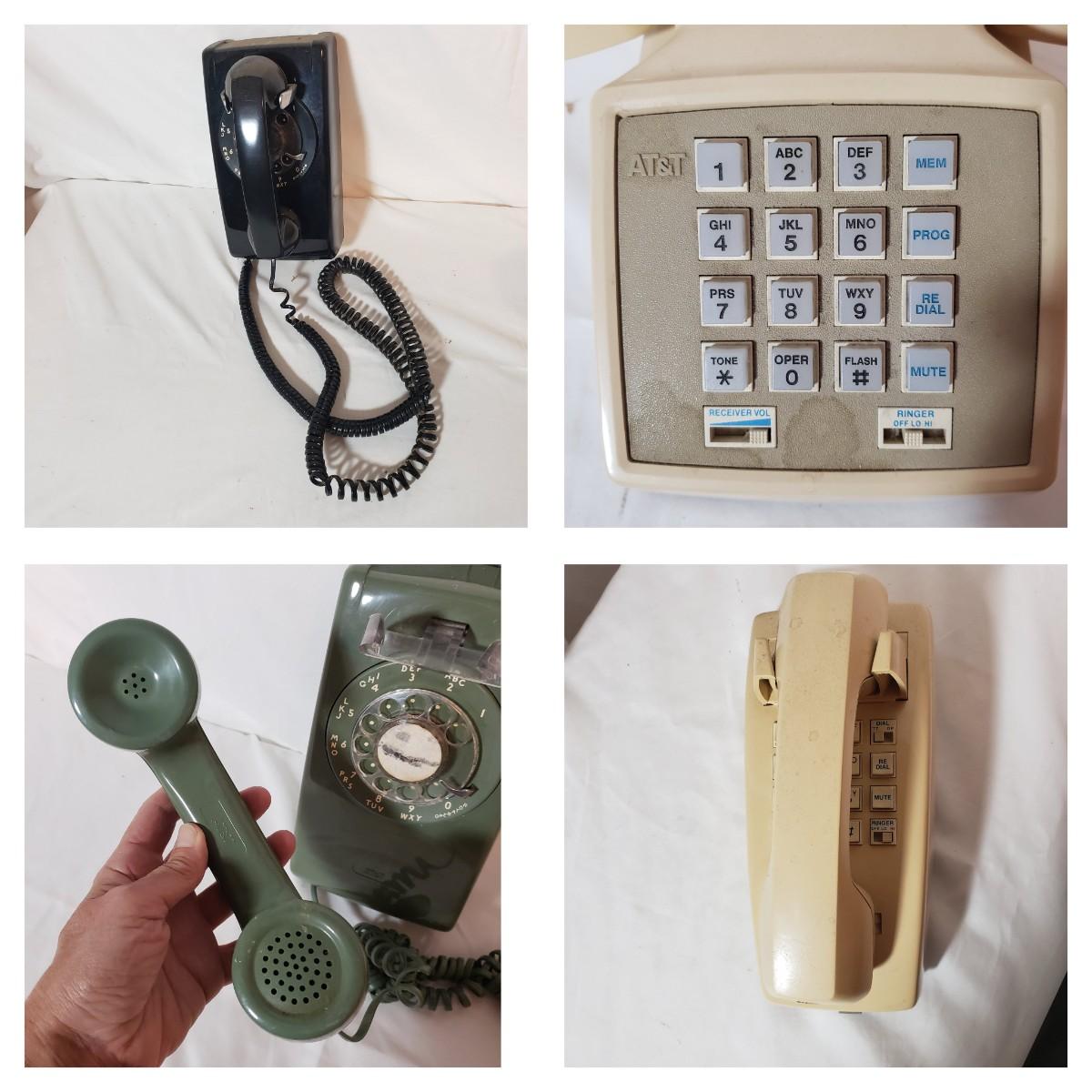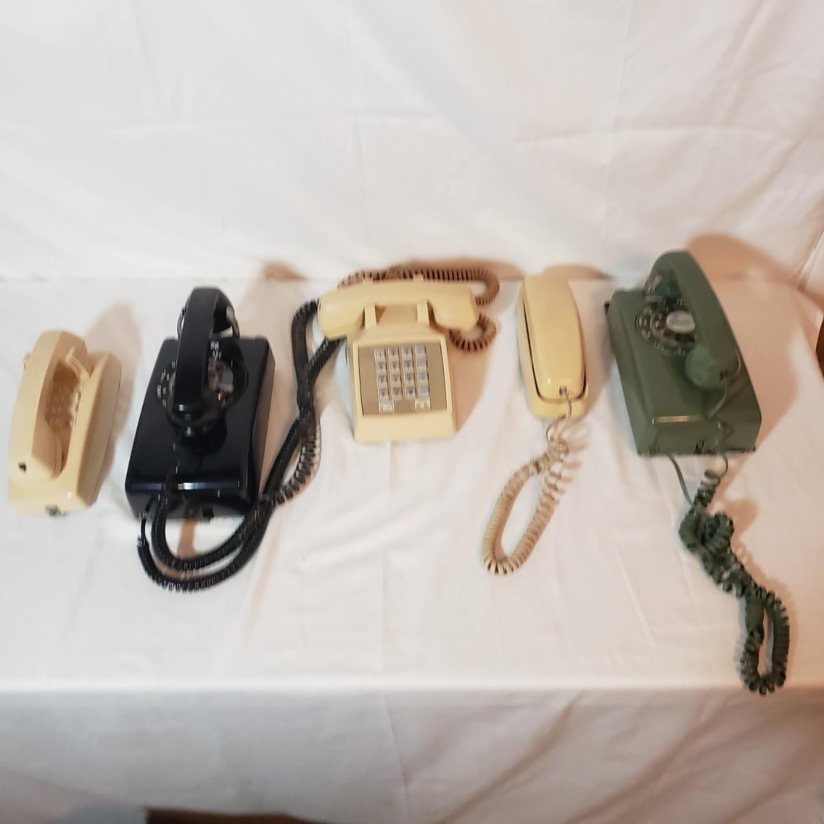 This five piece old school telephone lot is definitely not the wrong number! There are three wall mounted phones and two table top. The two mounted ones are rotary, while the other is touch tone. The rotary phones measure approximately 5" x 3" x 10"H. Note how long those spiral cords are from having to go into the other room for privacy!