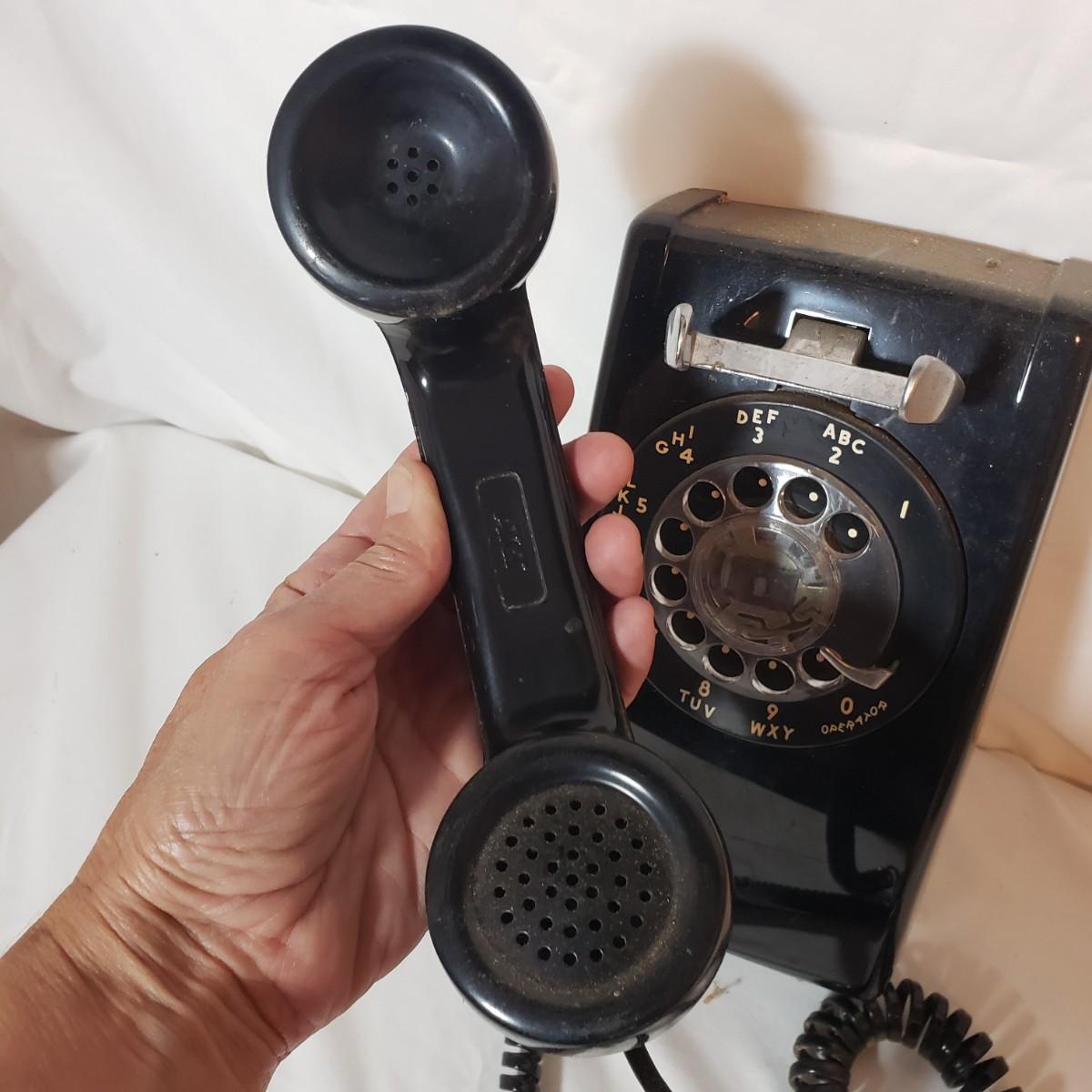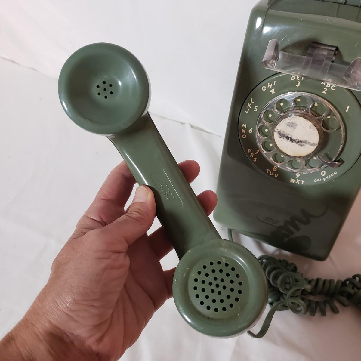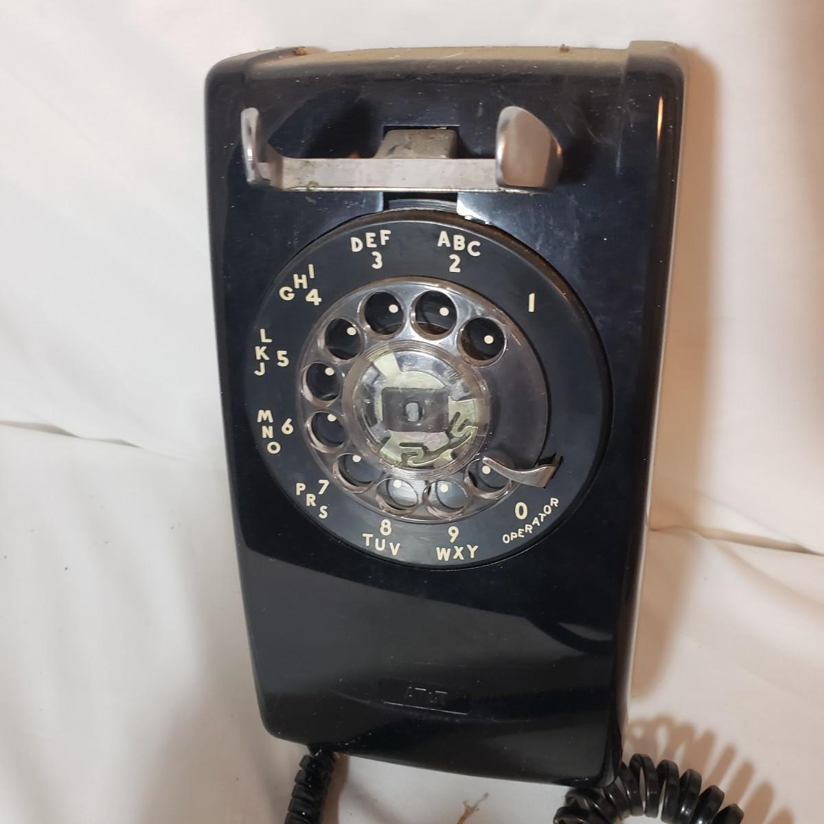 This five piece old school telephone lot is definitely not the wrong number! There are three wall mounted phones and two table top. The two mounted ones are rotary, while the other is touch tone. The rotary phones measure approximately 5" x 3" x 10"H. Note how long those spiral cords are from having to go into the other room for privacy!