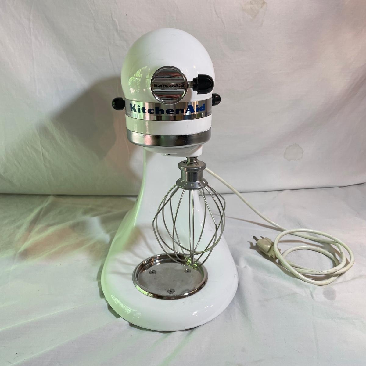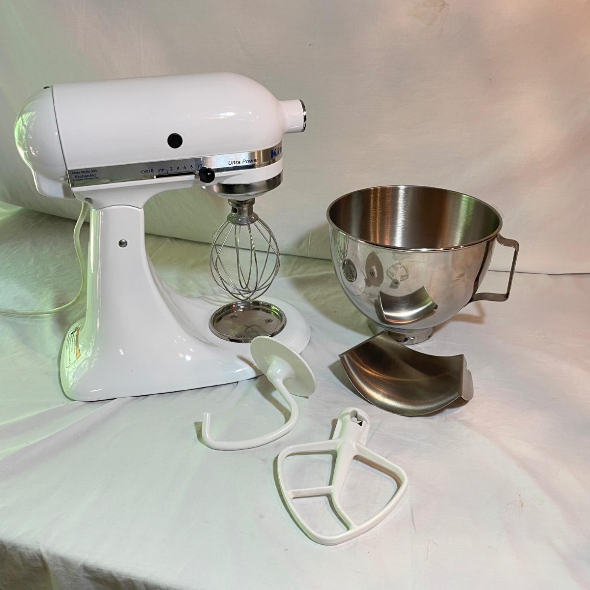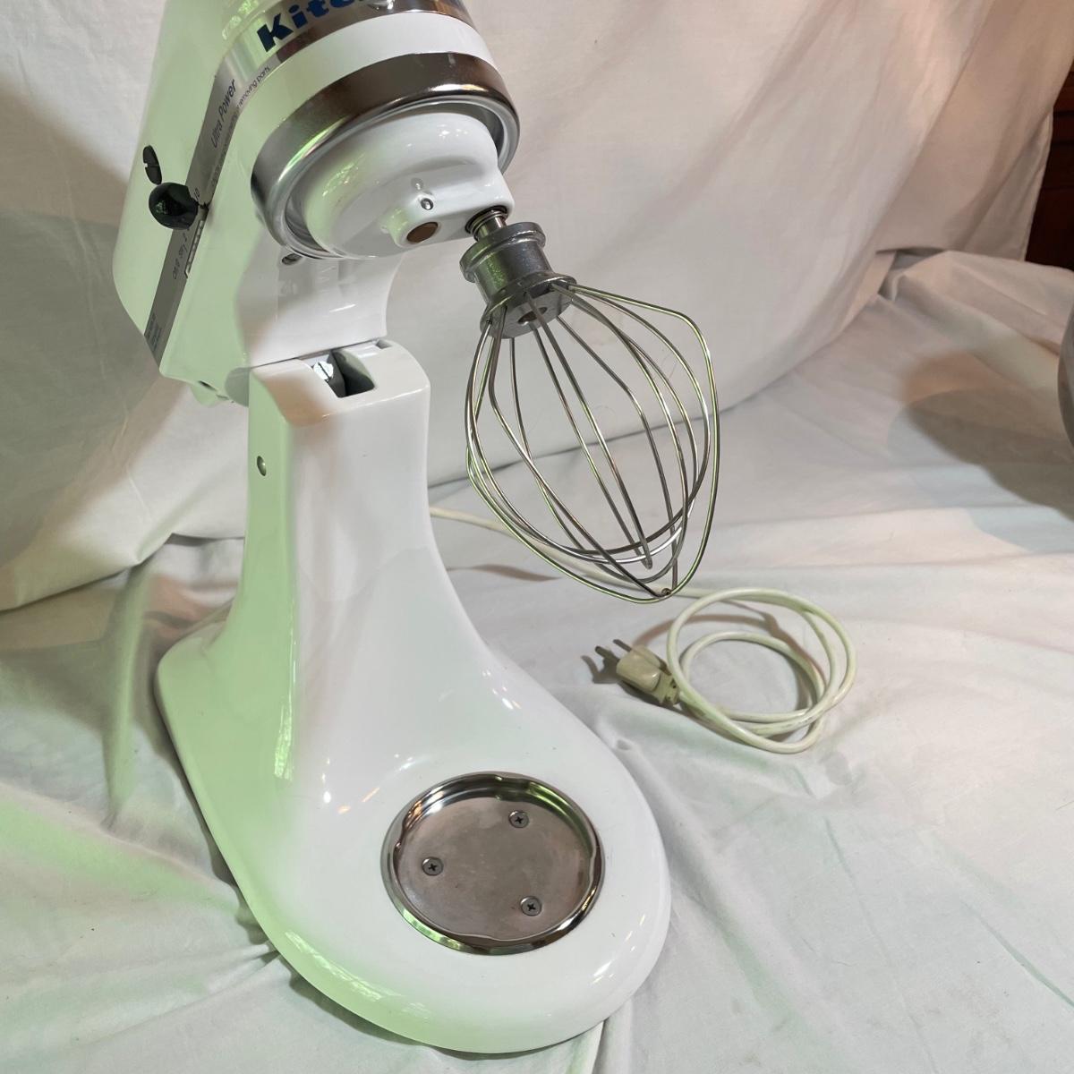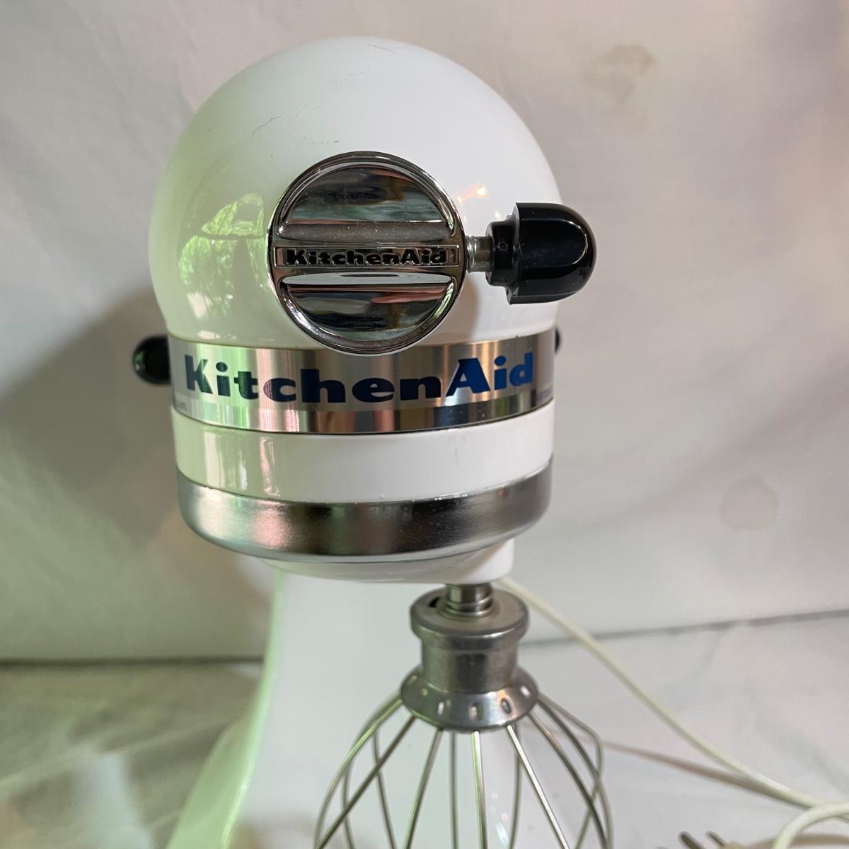 Classic white KitchenAid mixer with three attachments, mixing bowl and bowl pouring guard. Mixer turned on when plugged in. See images. Shipping available.