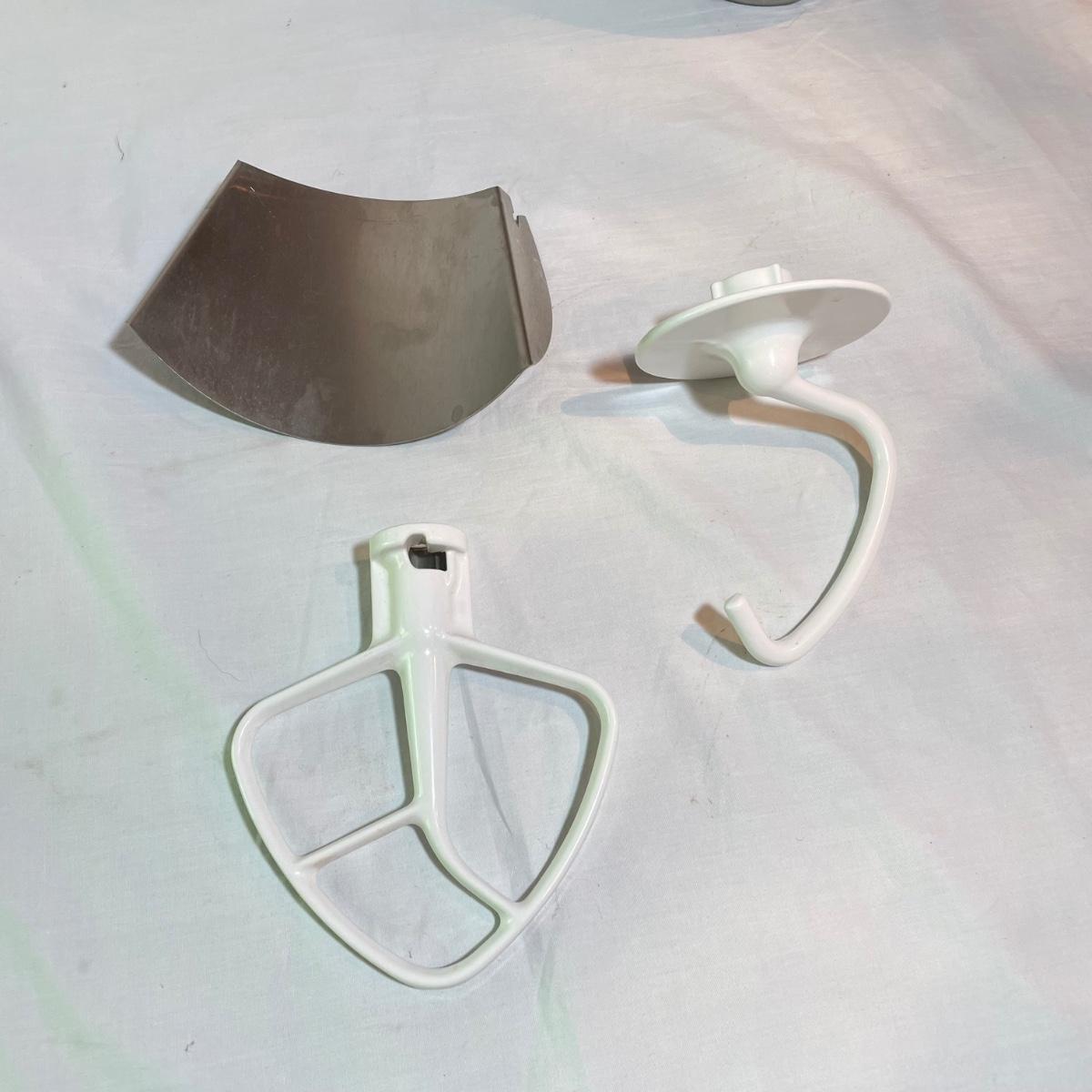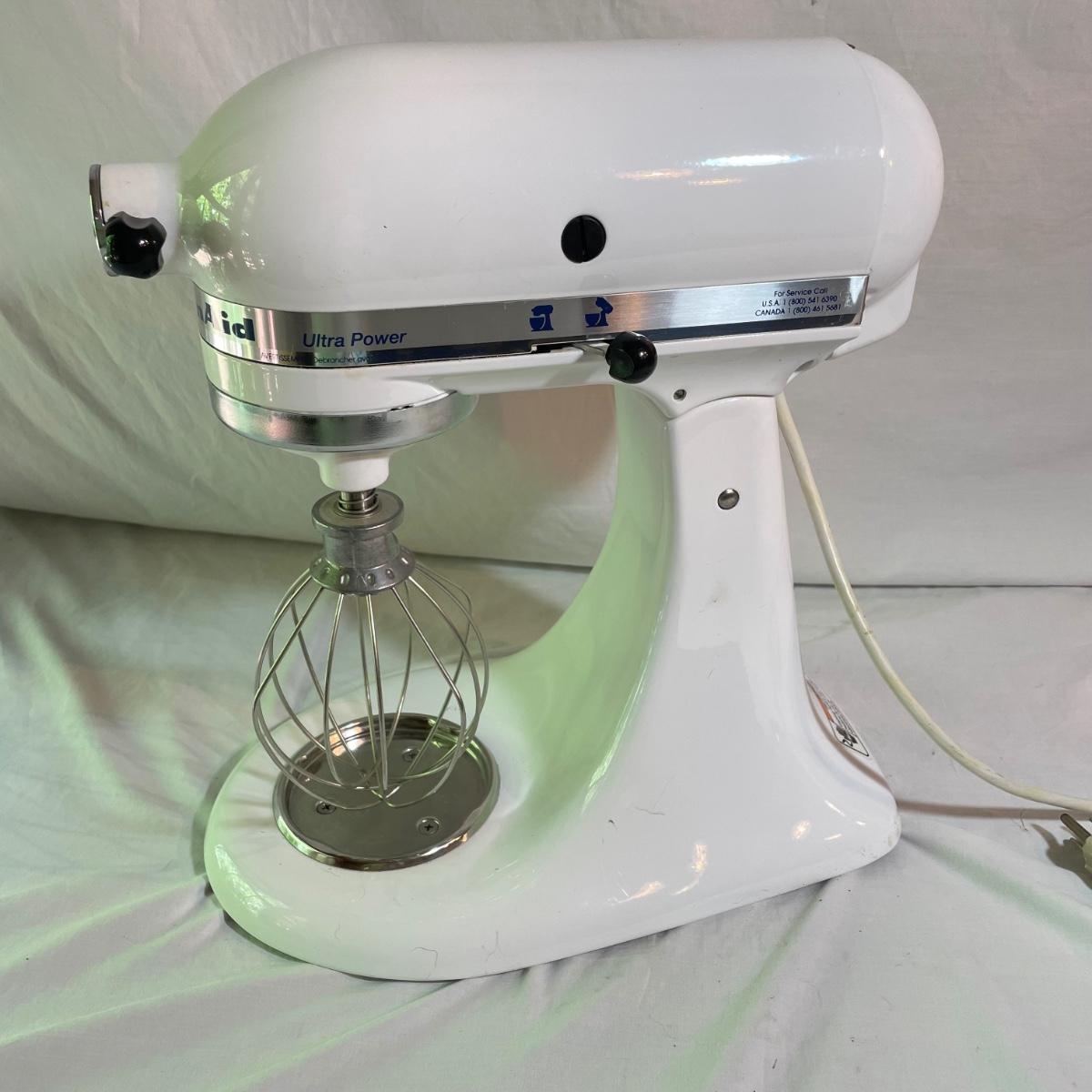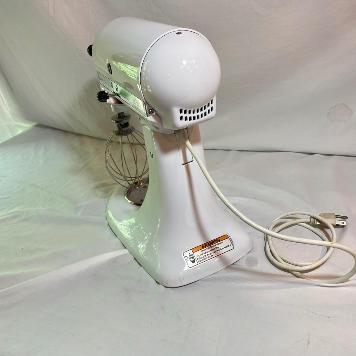 Classic white KitchenAid mixer with three attachments, mixing bowl and bowl pouring guard. Mixer turned on when plugged in. See images. Shipping available.