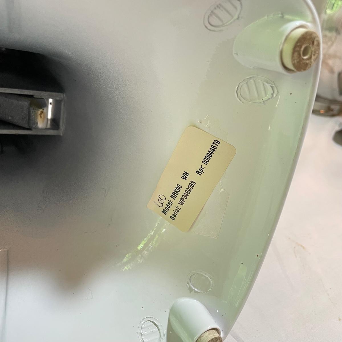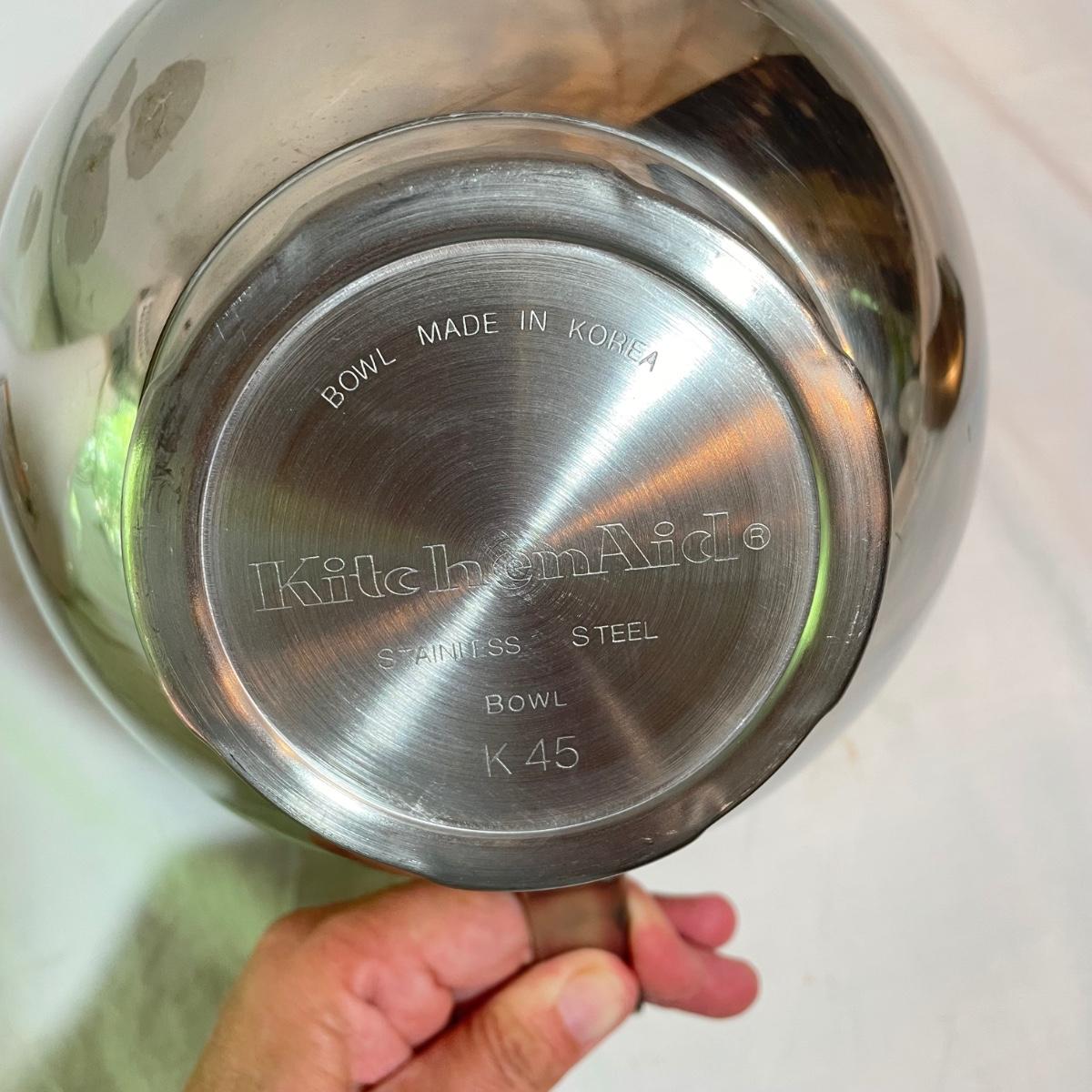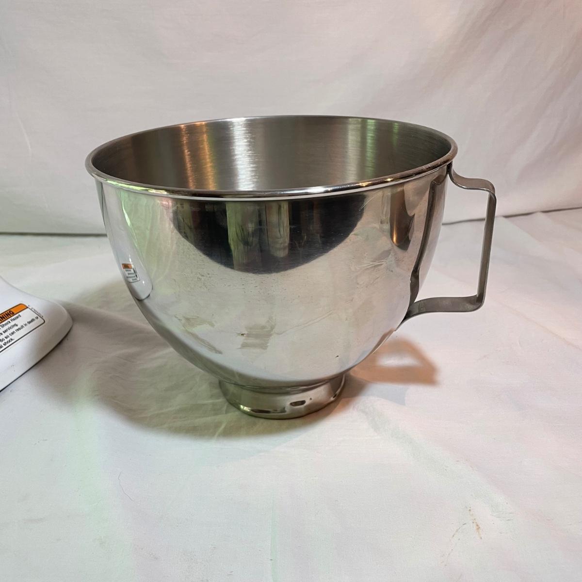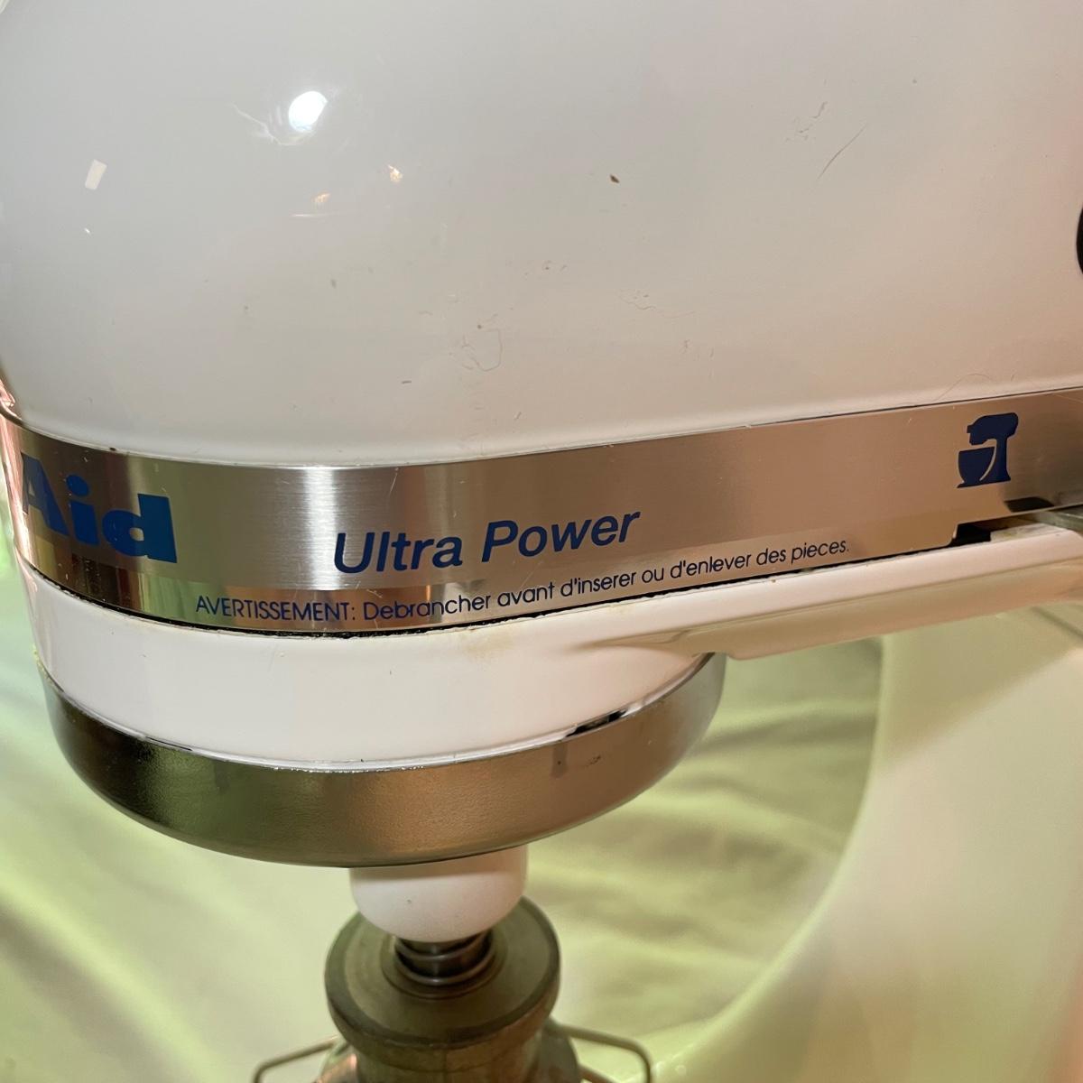Classic white KitchenAid mixer with three attachments, mixing bowl and bowl pouring guard. Mixer turned on when plugged in. See images. Shipping available.