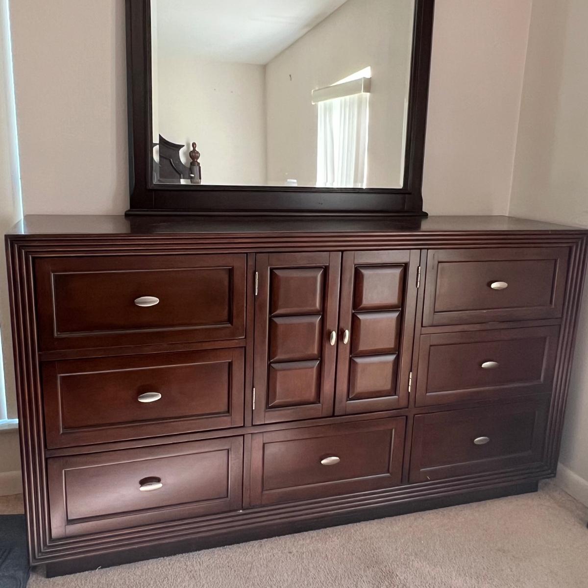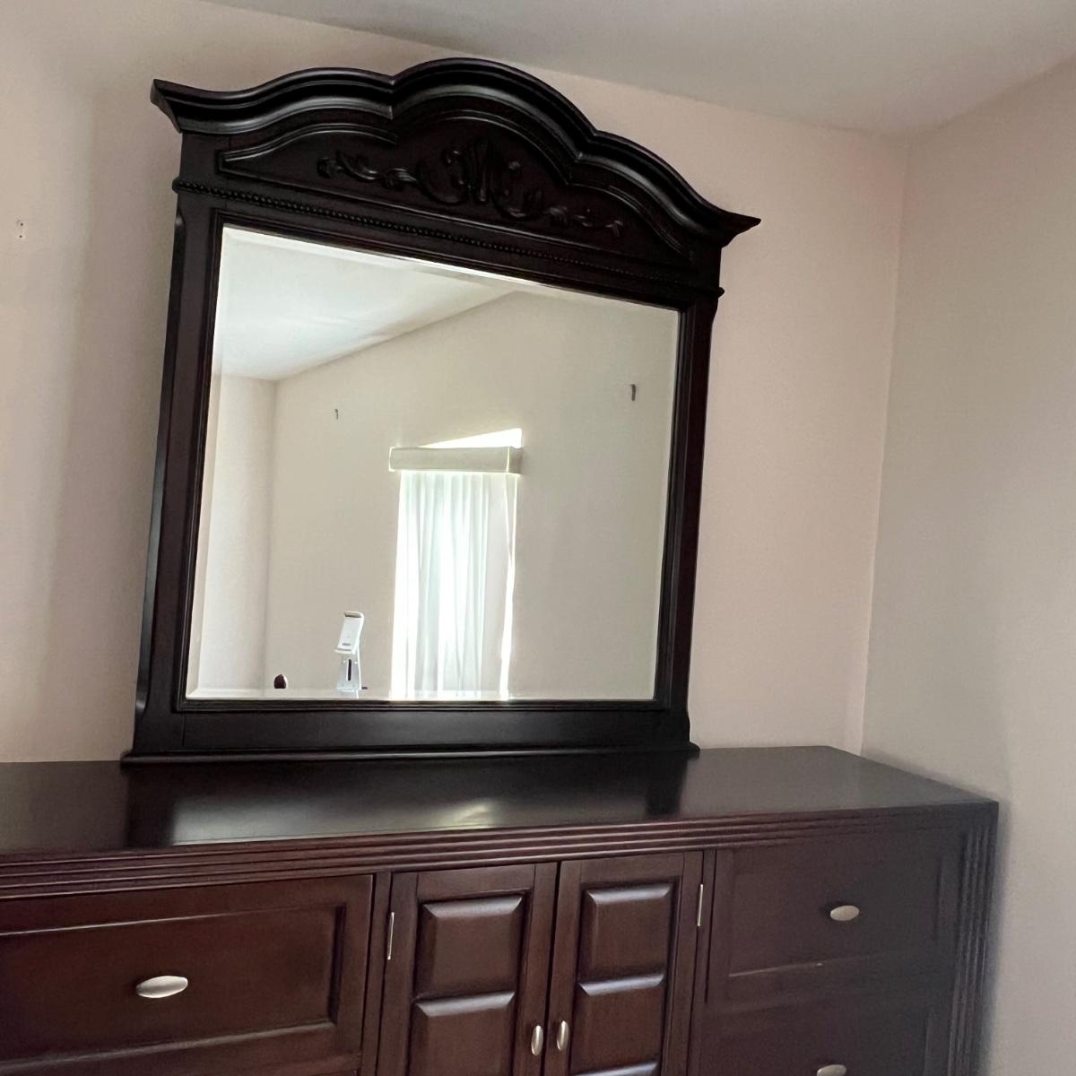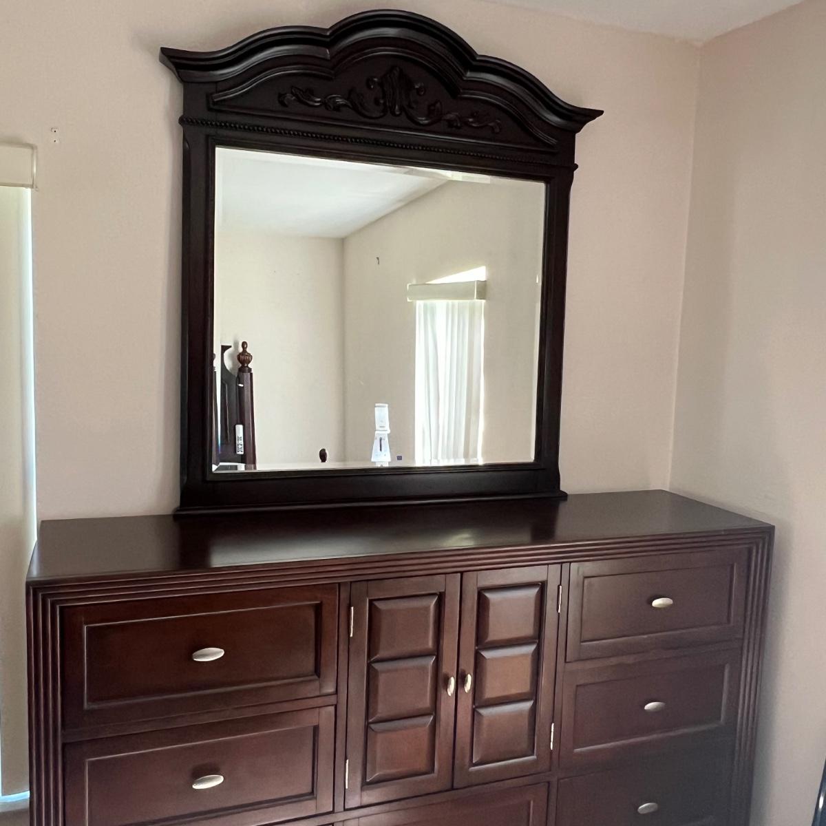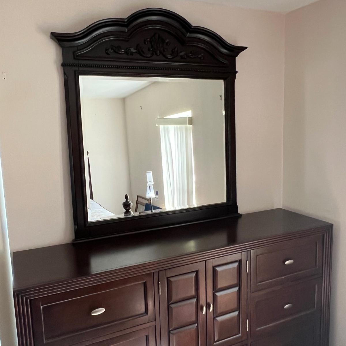 Beautiful dark wood dresser and decorative mirror - like brand new. Measures 68”Lx18”Wx38”H. Detachable mirror measures 41”Wx49”.H. Matching queen bed also for sale. Please bring tools and help for removal.
