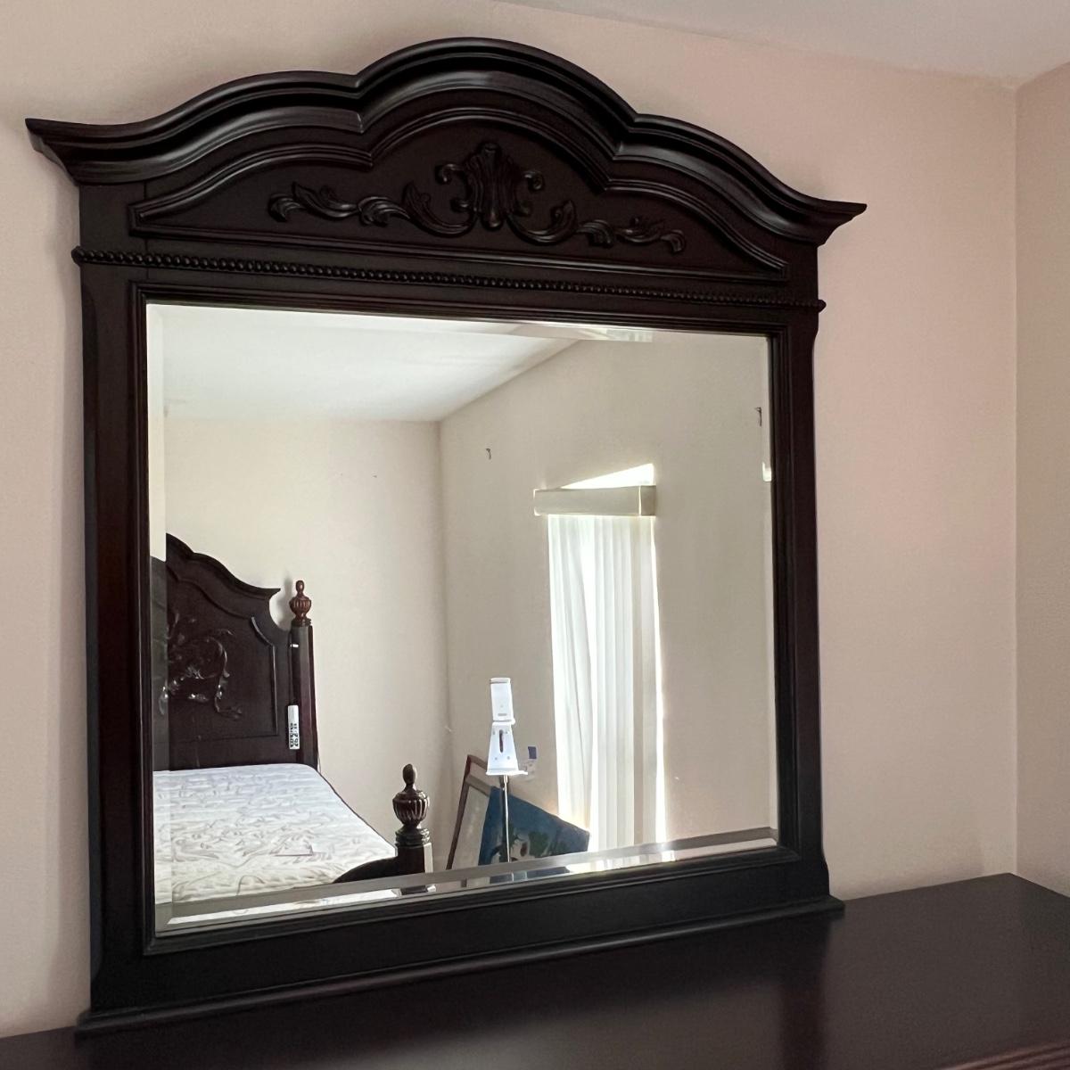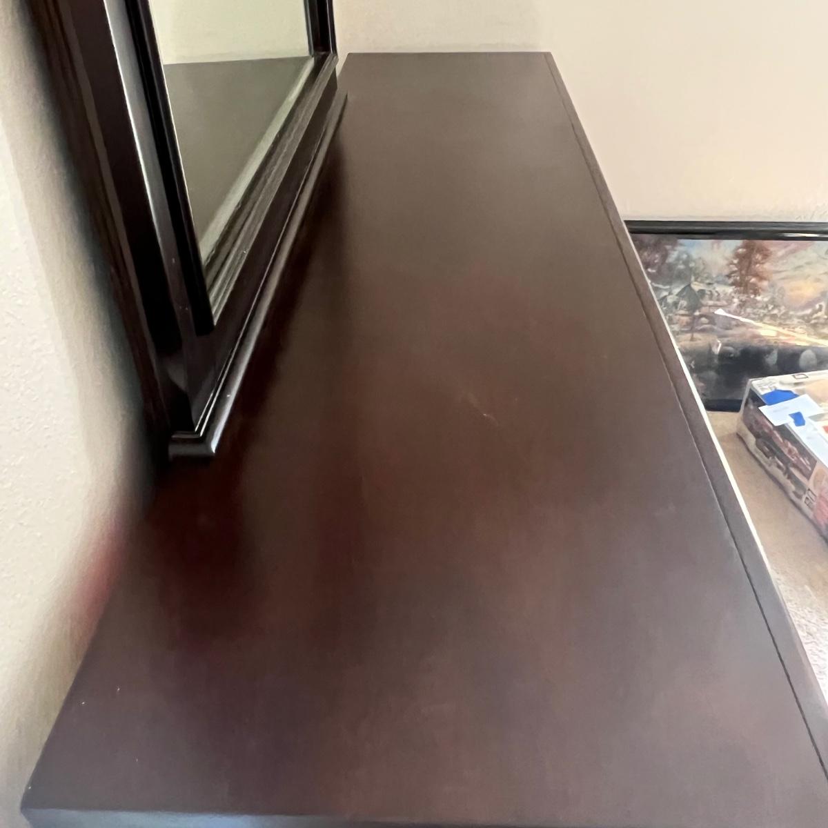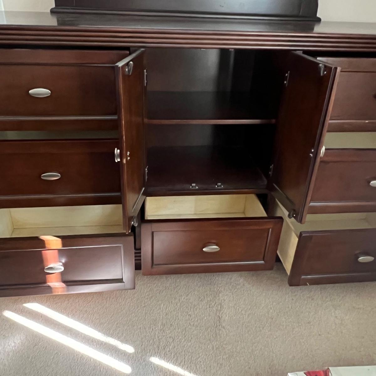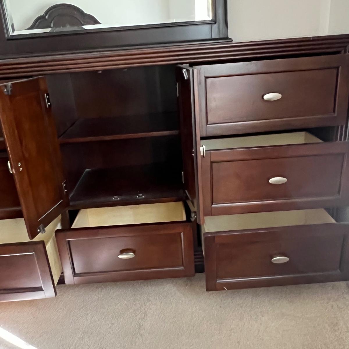 Beautiful dark wood dresser and decorative mirror - like brand new. Measures 68”Lx18”Wx38”H. Detachable mirror measures 41”Wx49”.H. Matching queen bed also for sale. Please bring tools and help for removal.