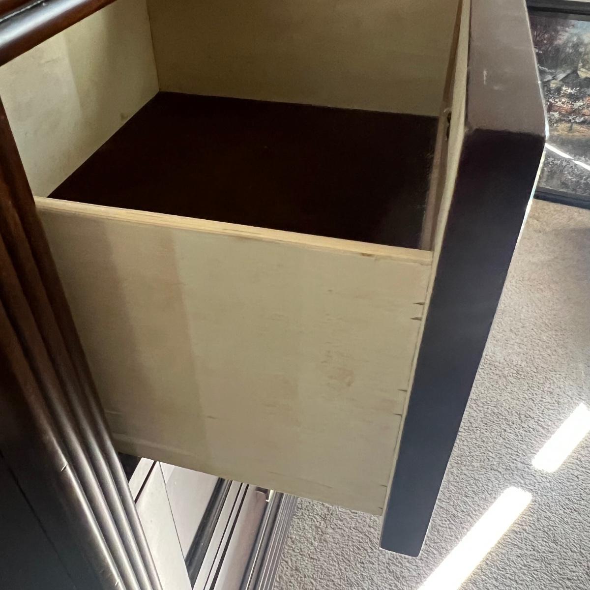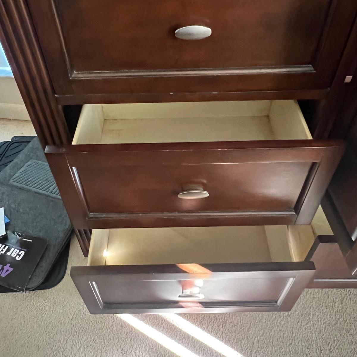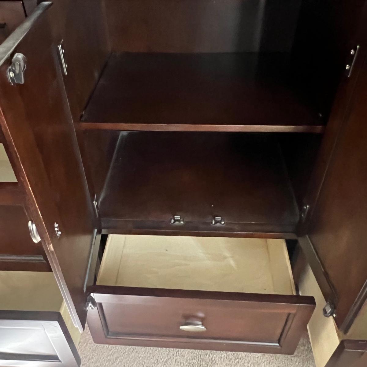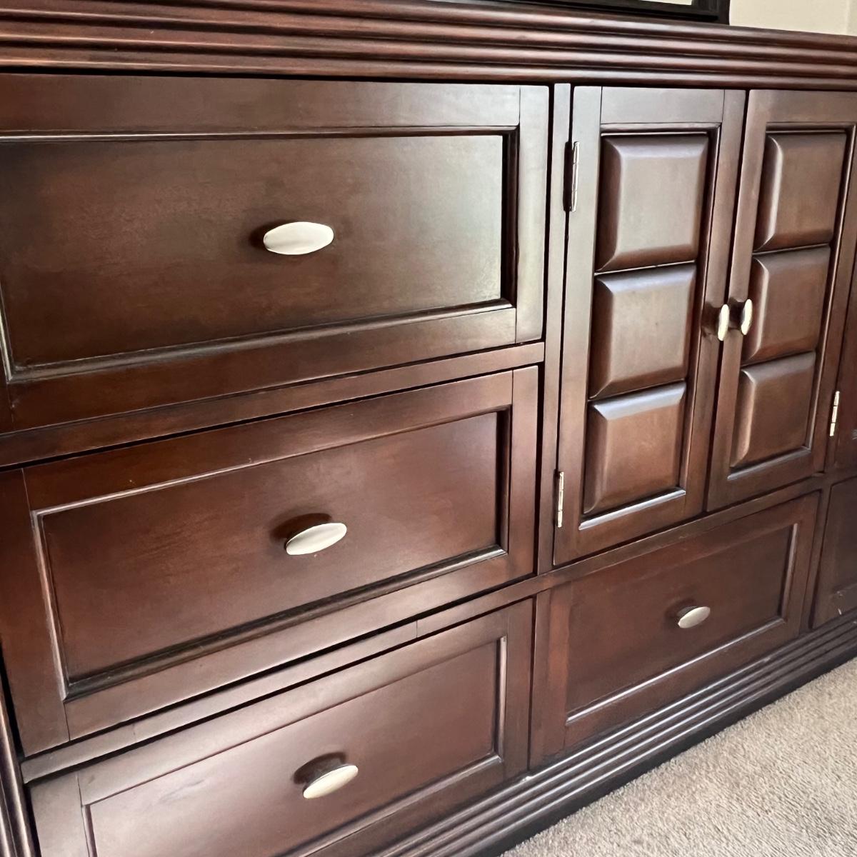 Beautiful dark wood dresser and decorative mirror - like brand new. Measures 68”Lx18”Wx38”H. Detachable mirror measures 41”Wx49”.H. Matching queen bed also for sale. Please bring tools and help for removal.