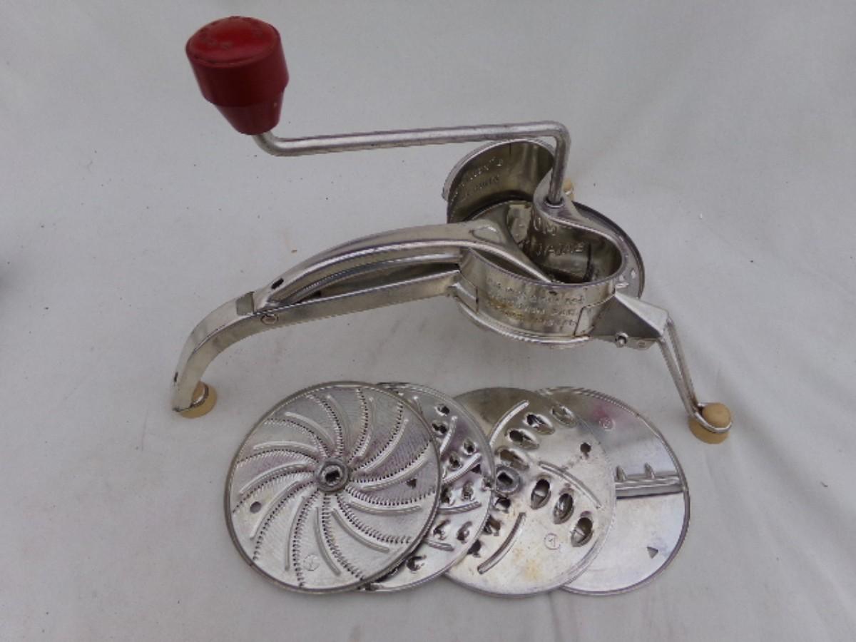 Classic VTG MOULI Salad Maker! c.1950s. Before Veg-O-Matic, Salad Shooter, Dial-O-Matic & Zip Codes - - - There was the MOULI Salad Maker. ALL metal construction w/ 5 different slicing, grating, shredding, chopping rotors, for every imaginable need. Way ahead of it’s time. Might have been used, but you can’t tell it. Still in the original box w/ instuctions.