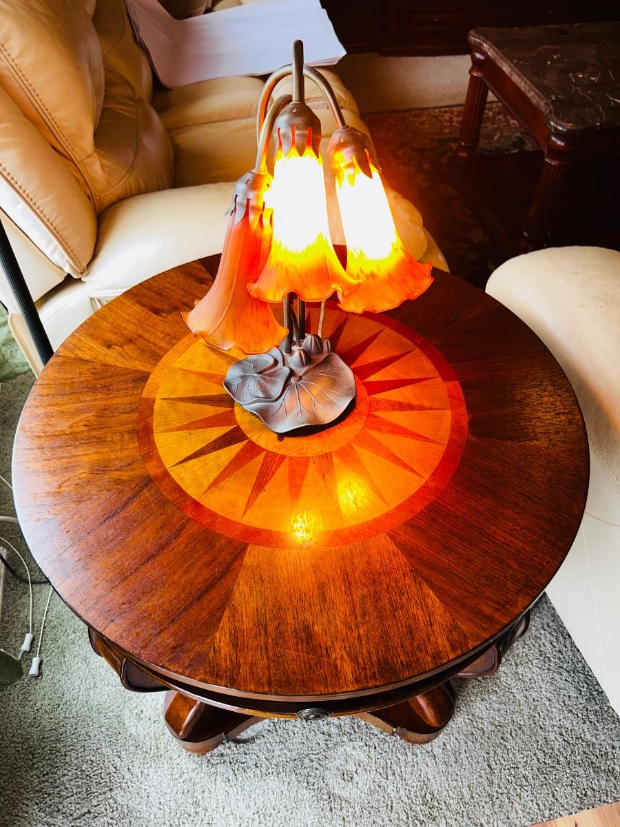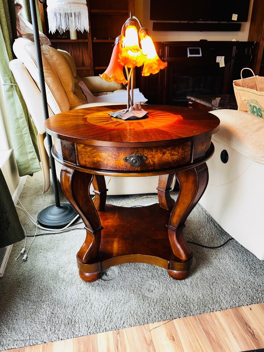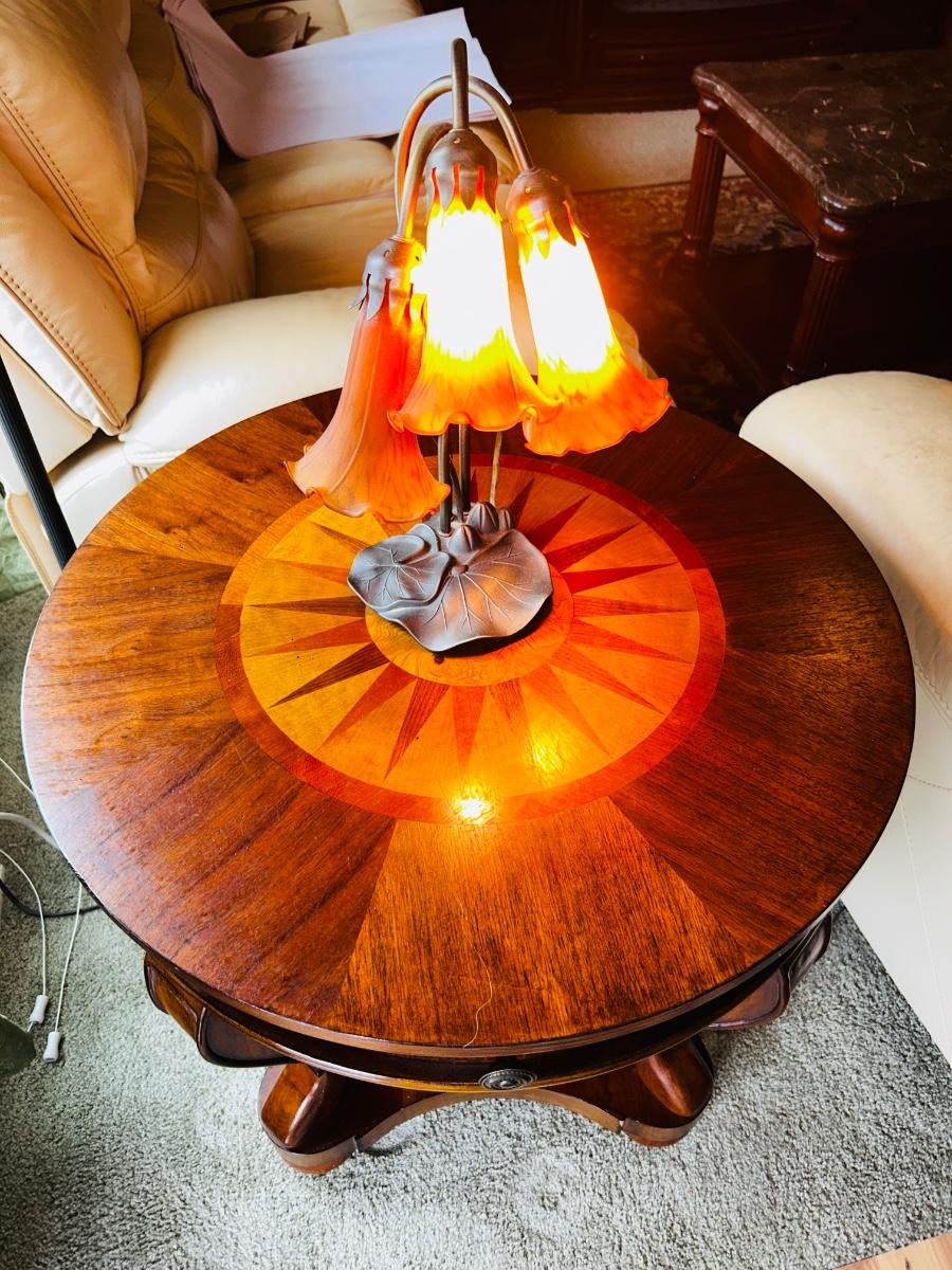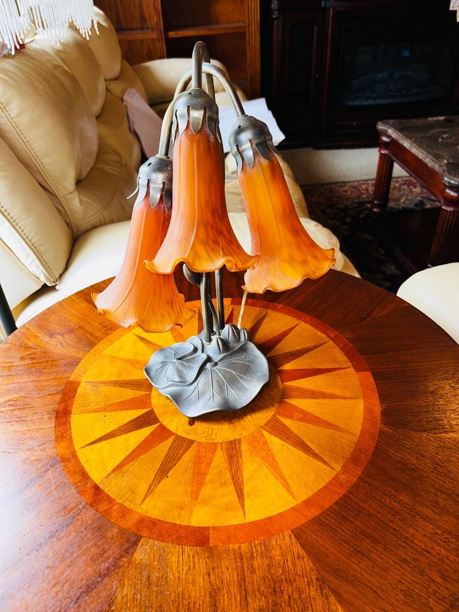 2 TIER INLAID WOOD SIDE TABLE W/DRAWER AND A 3 LIGHT LILY LAMP