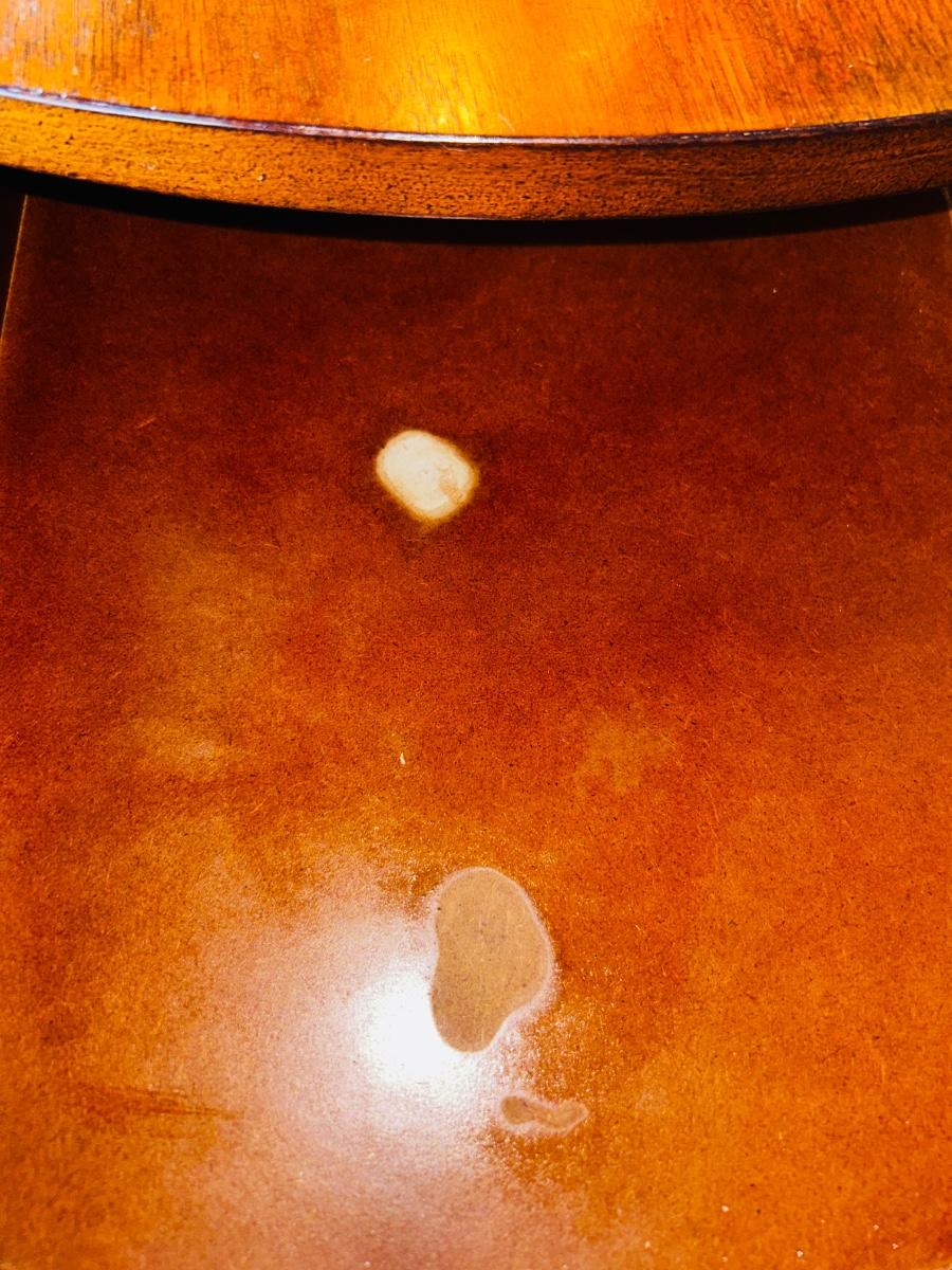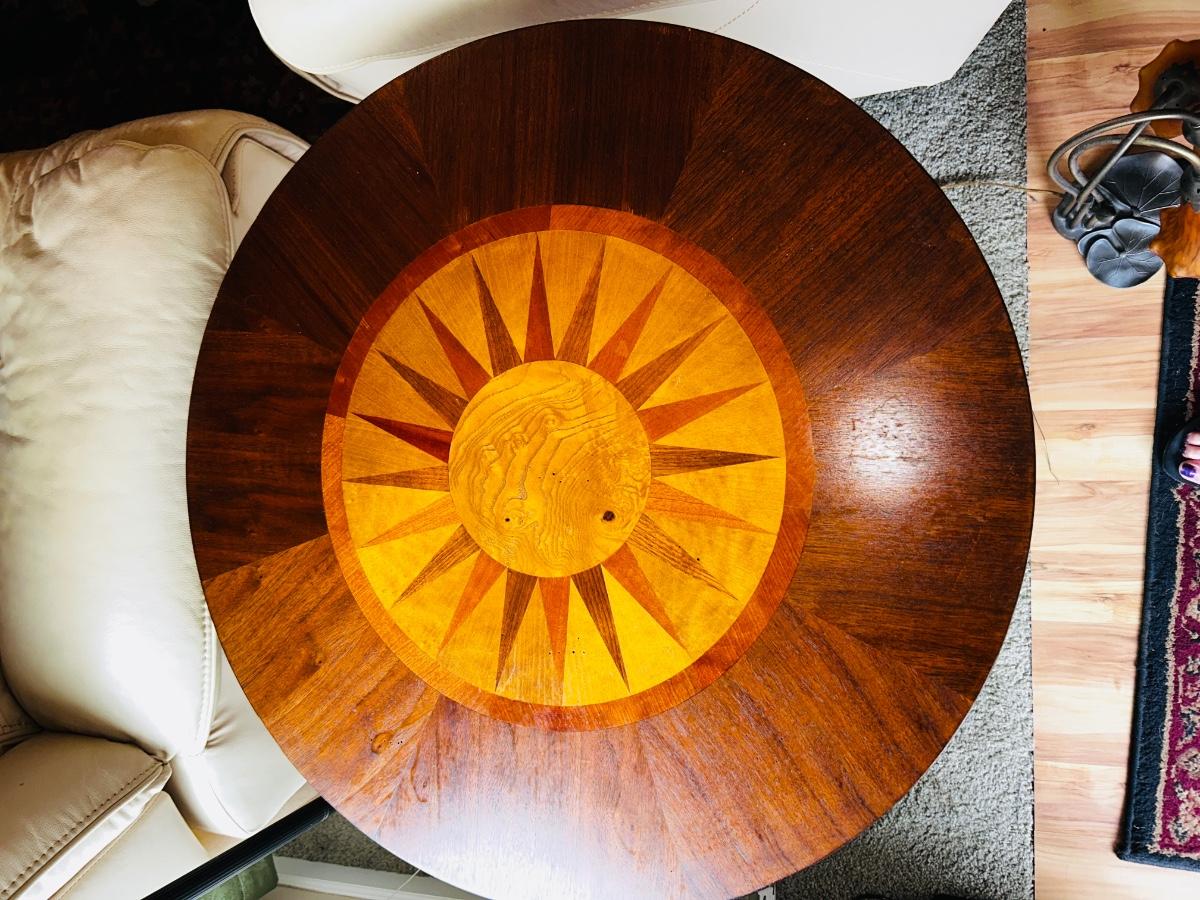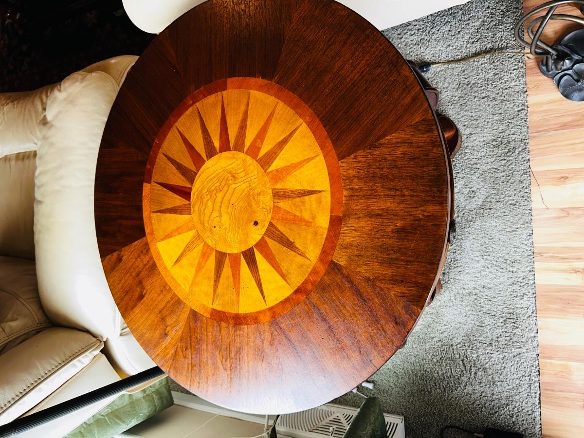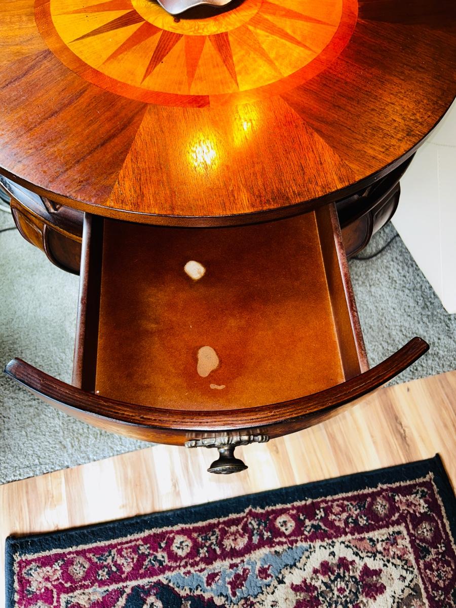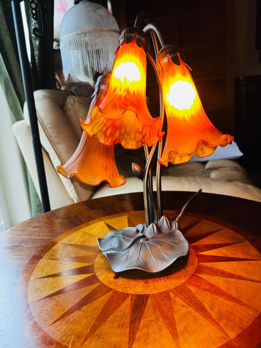 2 TIER INLAID WOOD SIDE TABLE W/DRAWER AND A 3 LIGHT LILY LAMP