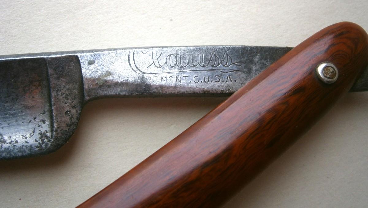 Vintage "Clauss" Straight Razor made by Clauss Co. (1877-1918) Freemont, Ohio, 6 1/4 in. long (closed), scales are man made material probably Bakelite or some other composite.