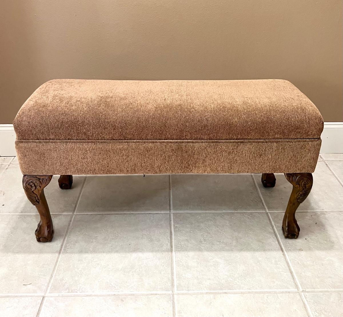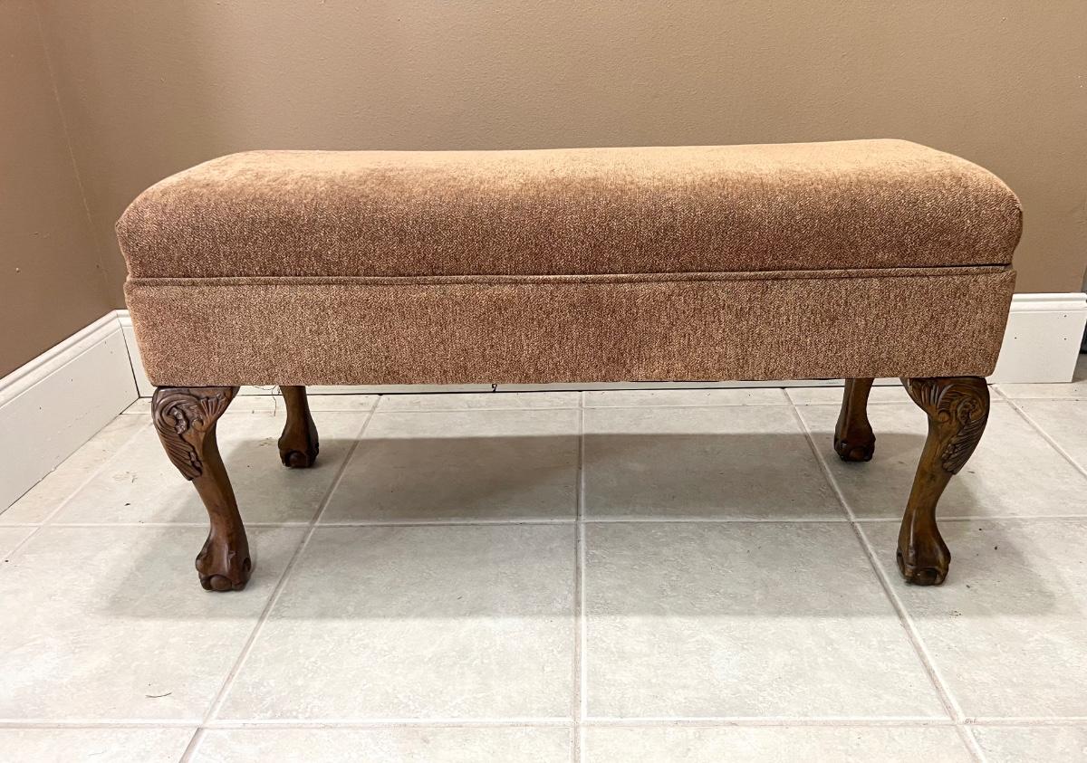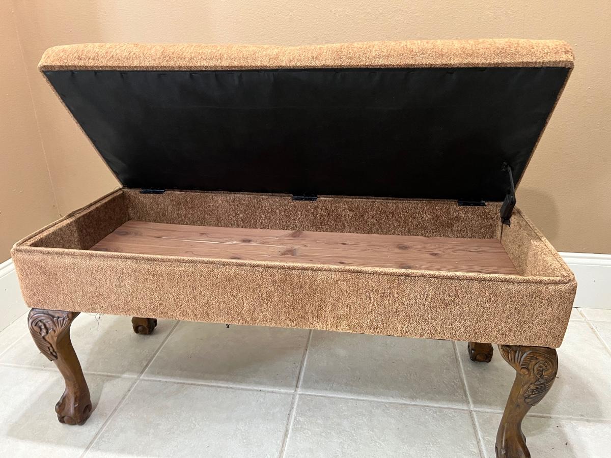 Cedar Lined Storage Bench with a neutral brown material on top measures 21 inches tall 30, 39 1/2 inches wide and 17 inches deep.