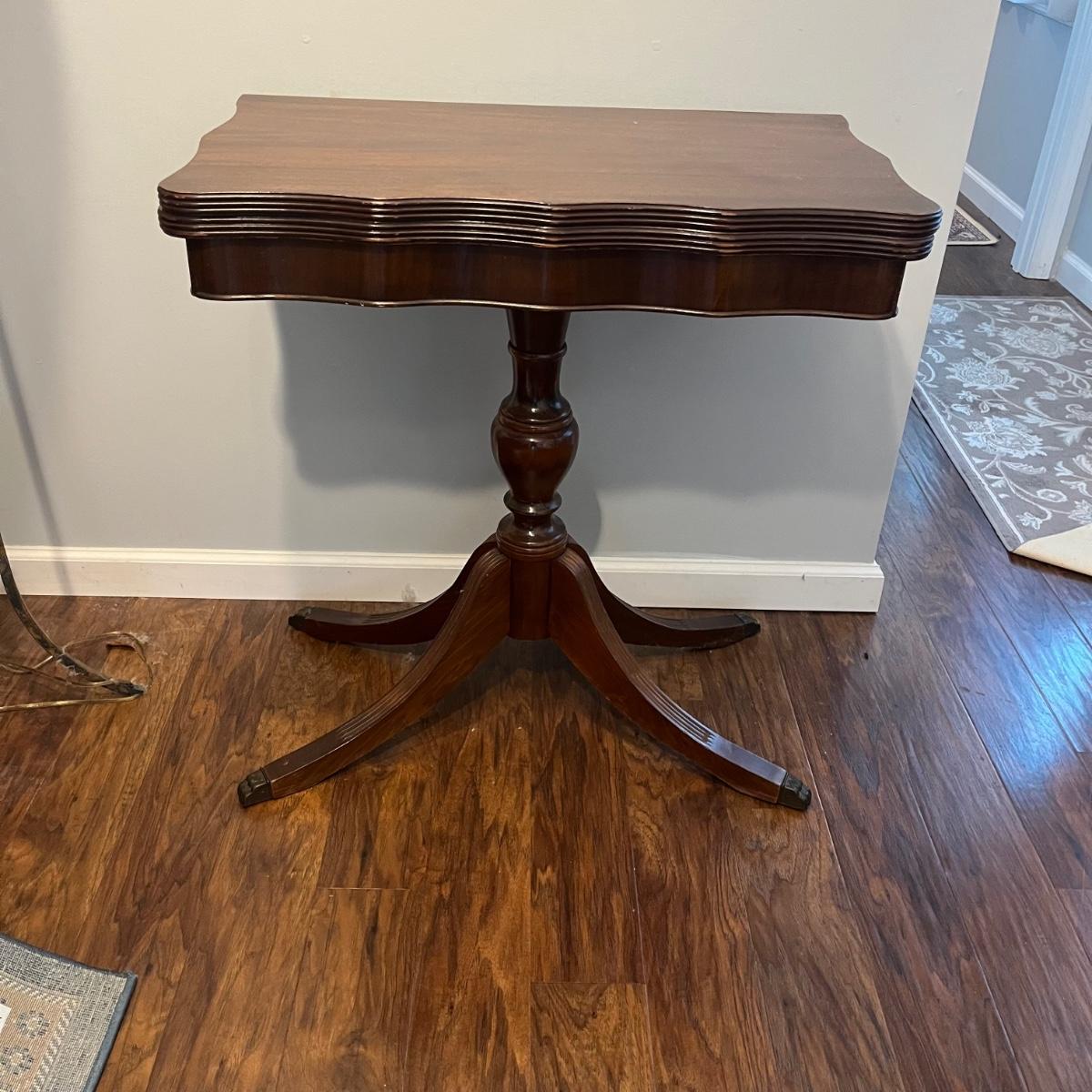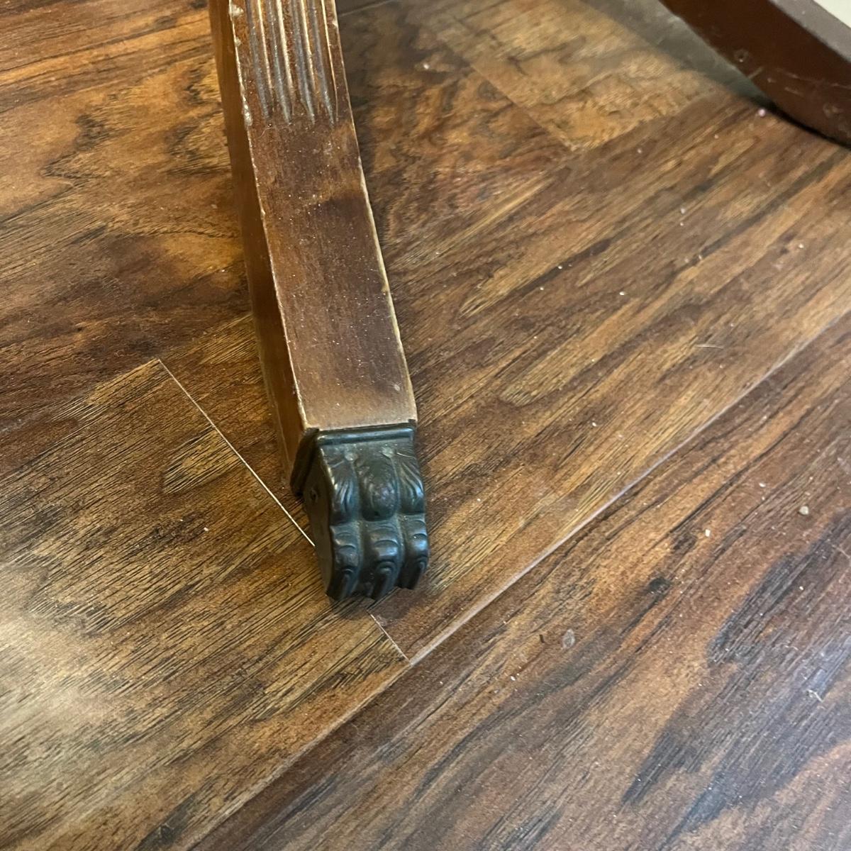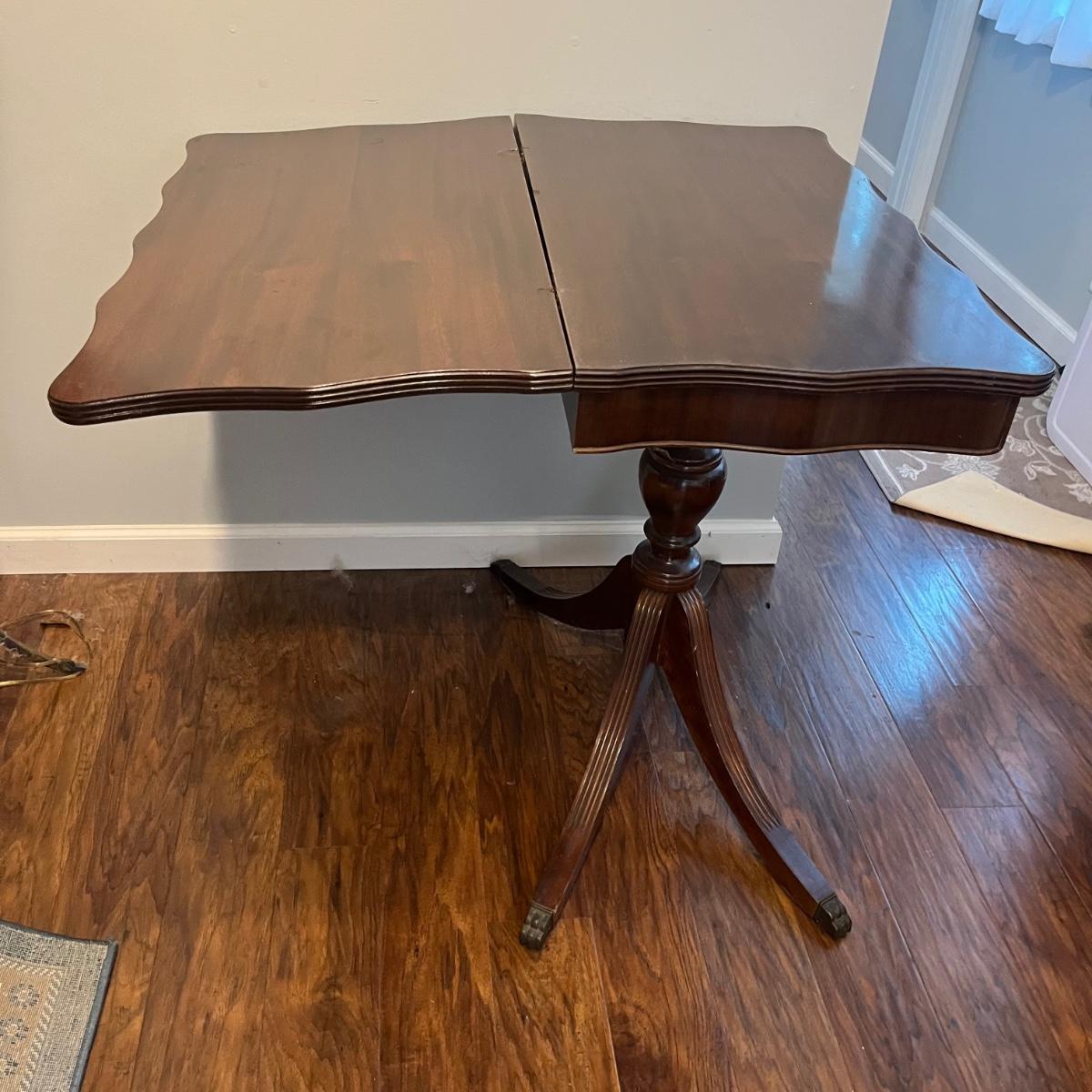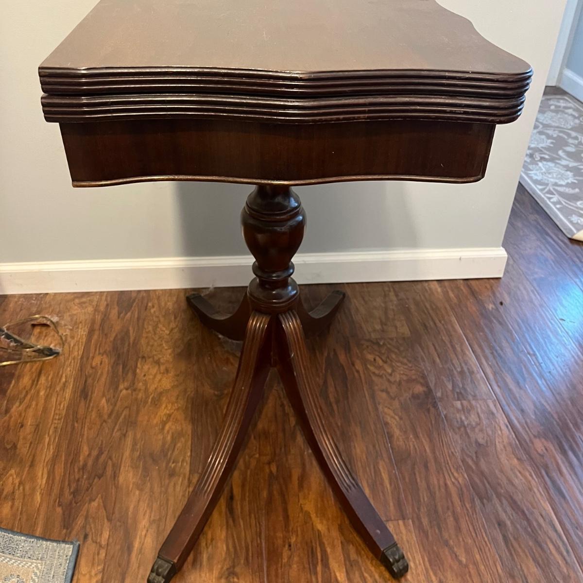 Lot includes a claw footed wooden folding top table. The tips of the table feet have metal covers. Table measures 16” x 28” x 30”H when folded and 32” x 28” x 29”H when open. Table has a few scratches and nicks, see photos.