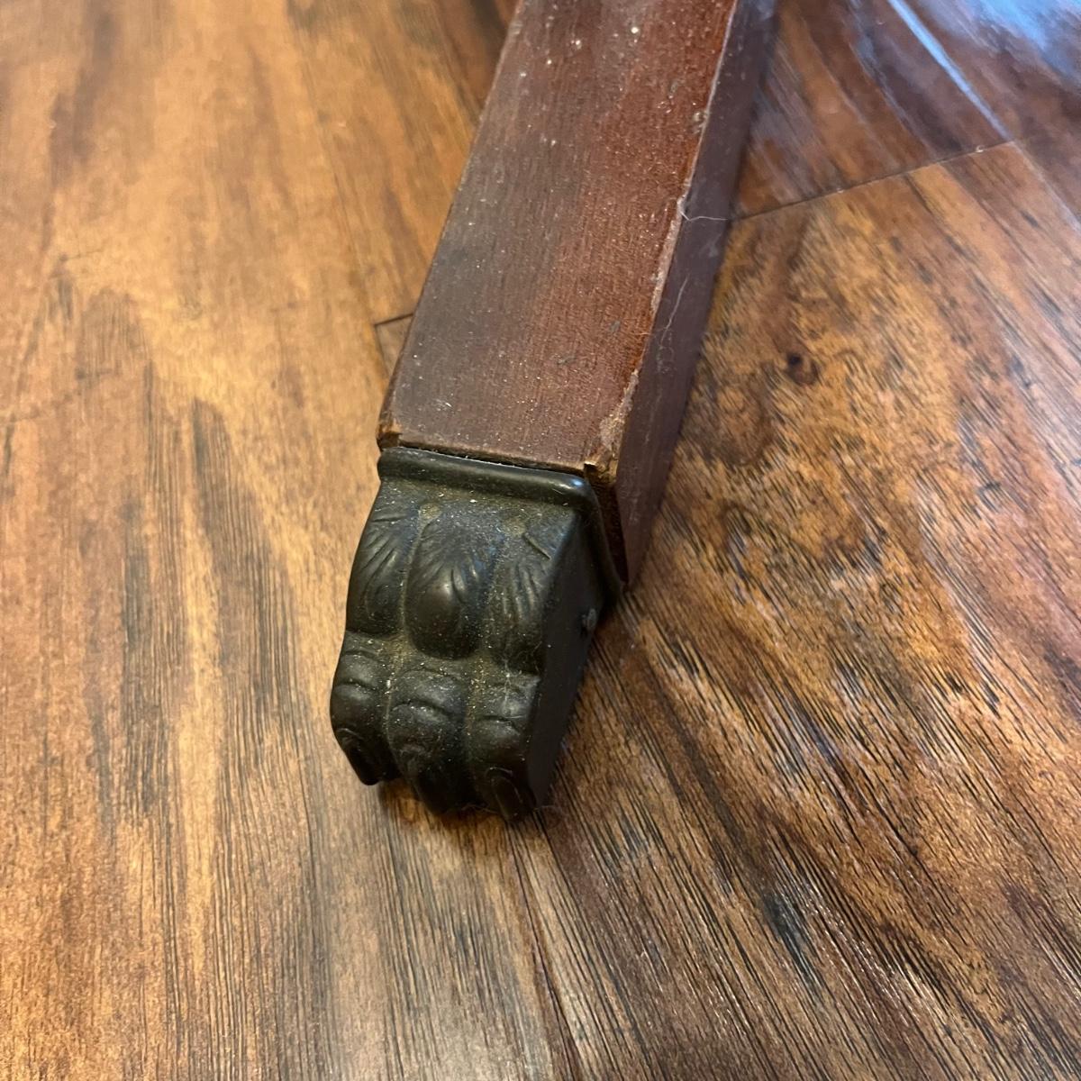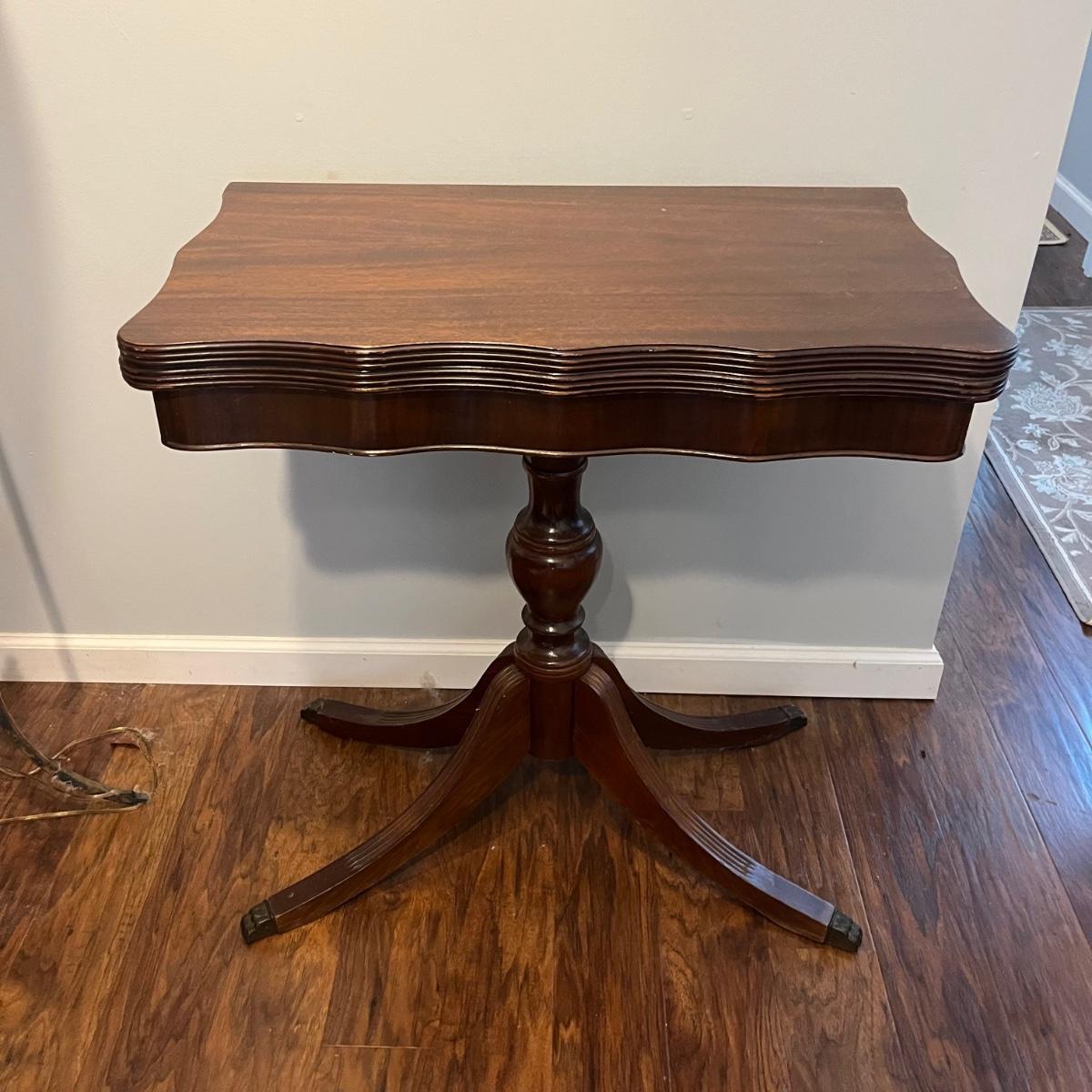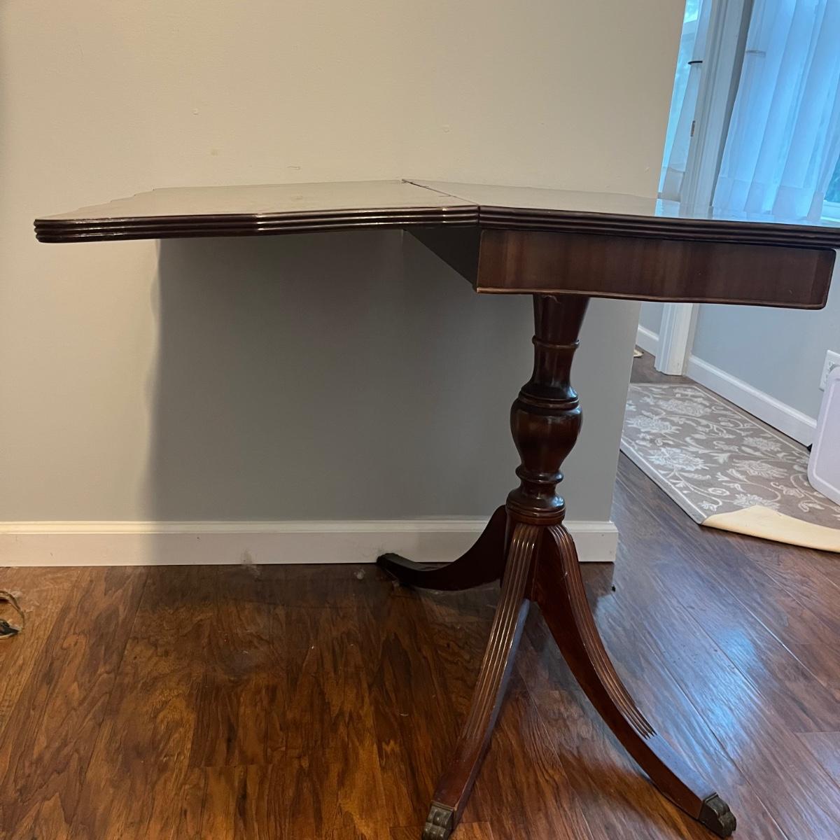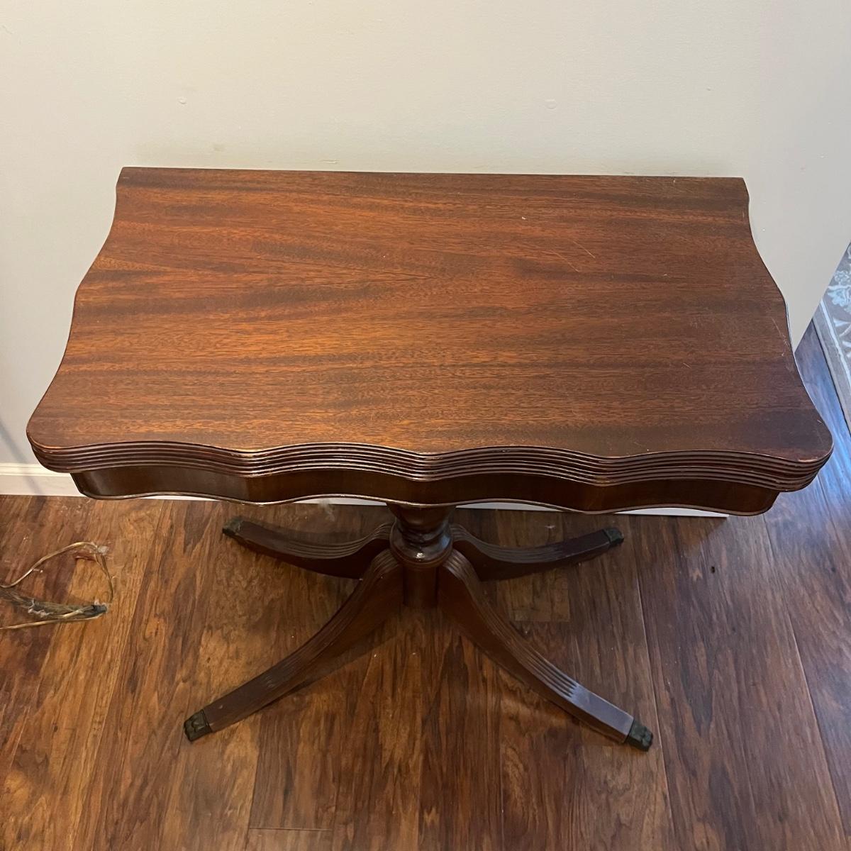 Lot includes a claw footed wooden folding top table. The tips of the table feet have metal covers. Table measures 16” x 28” x 30”H when folded and 32” x 28” x 29”H when open. Table has a few scratches and nicks, see photos.