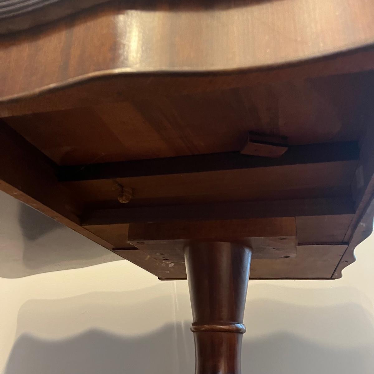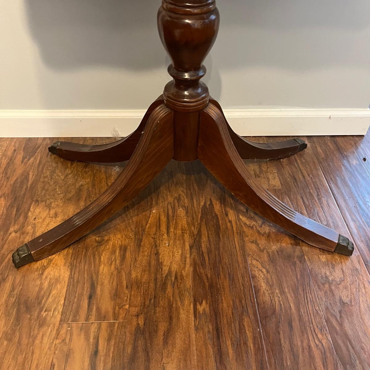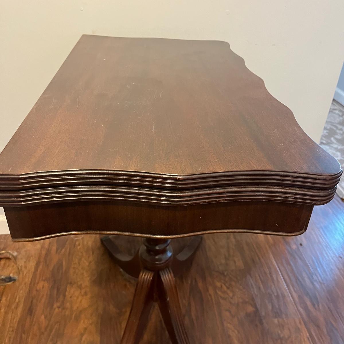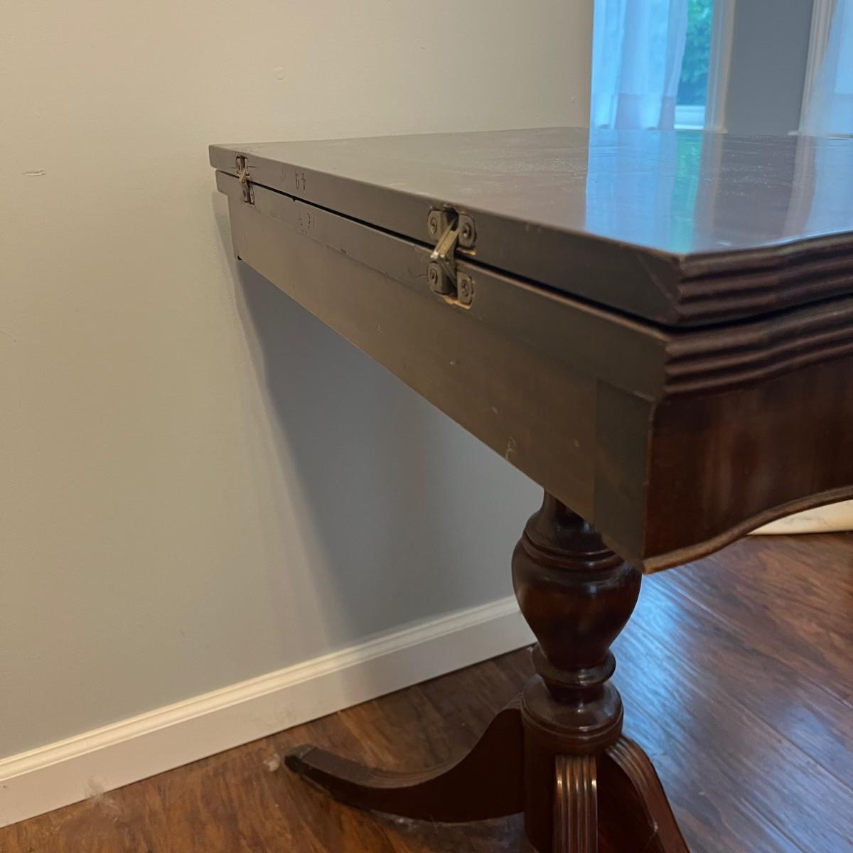 Lot includes a claw footed wooden folding top table. The tips of the table feet have metal covers. Table measures 16” x 28” x 30”H when folded and 32” x 28” x 29”H when open. Table has a few scratches and nicks, see photos.