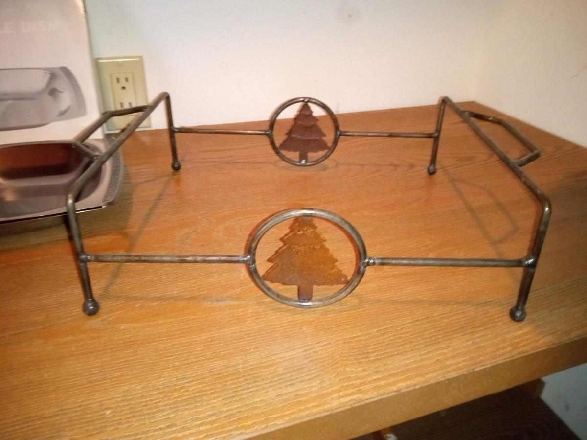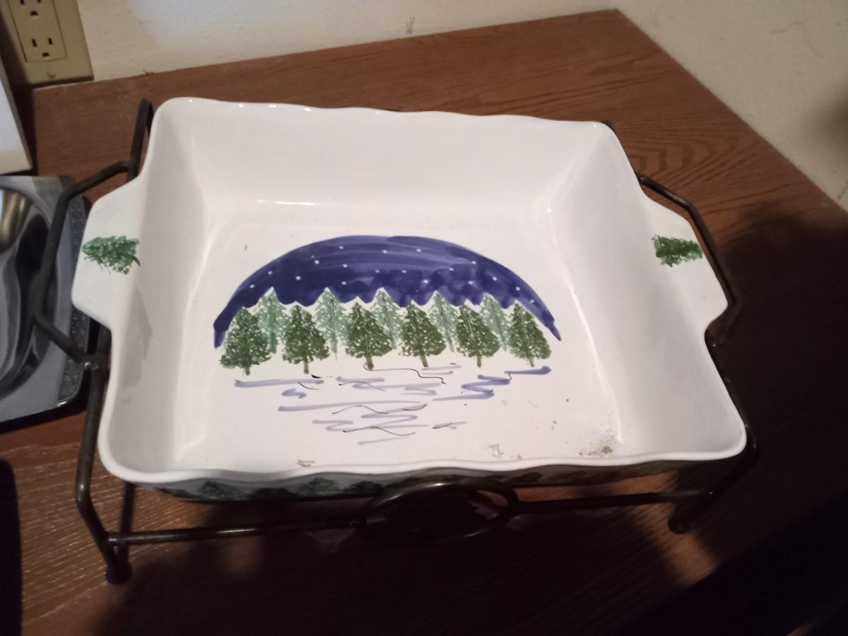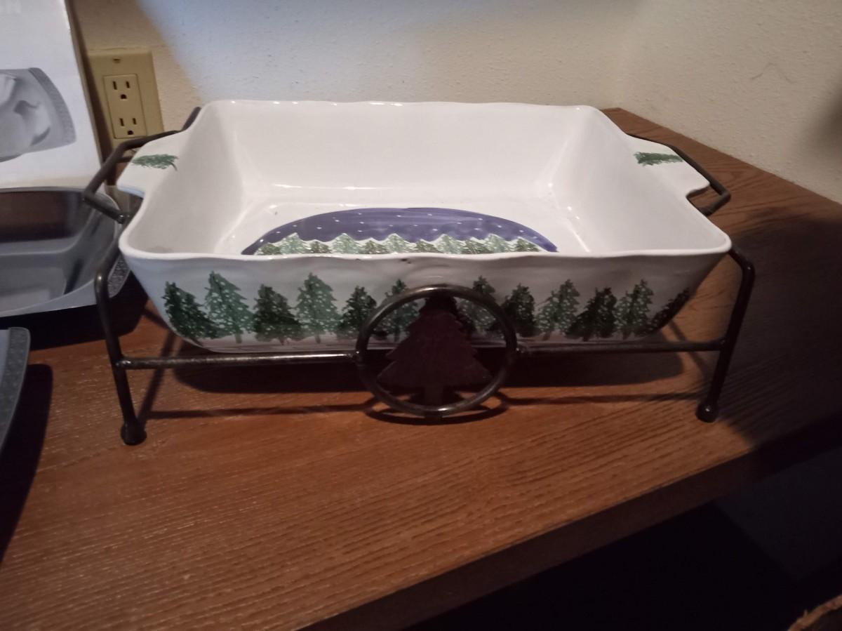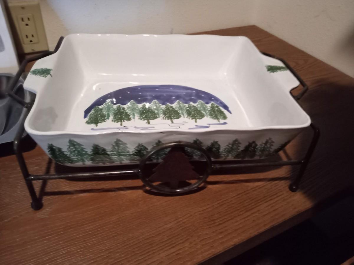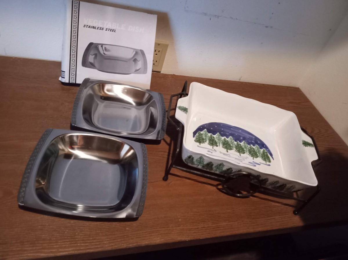 CLAY BAKING DISH IN AN IRON HOLDER AND 2 VEEGETABLE BOWLS