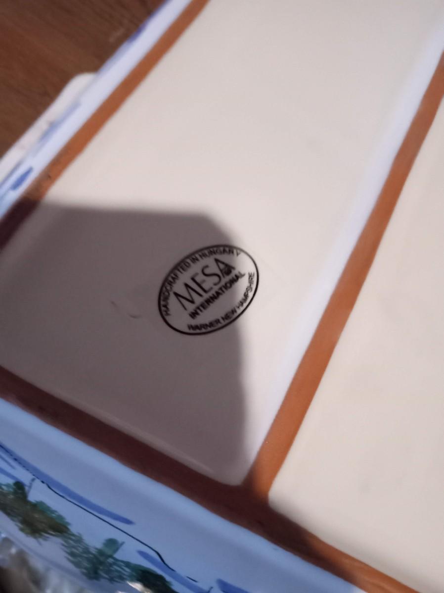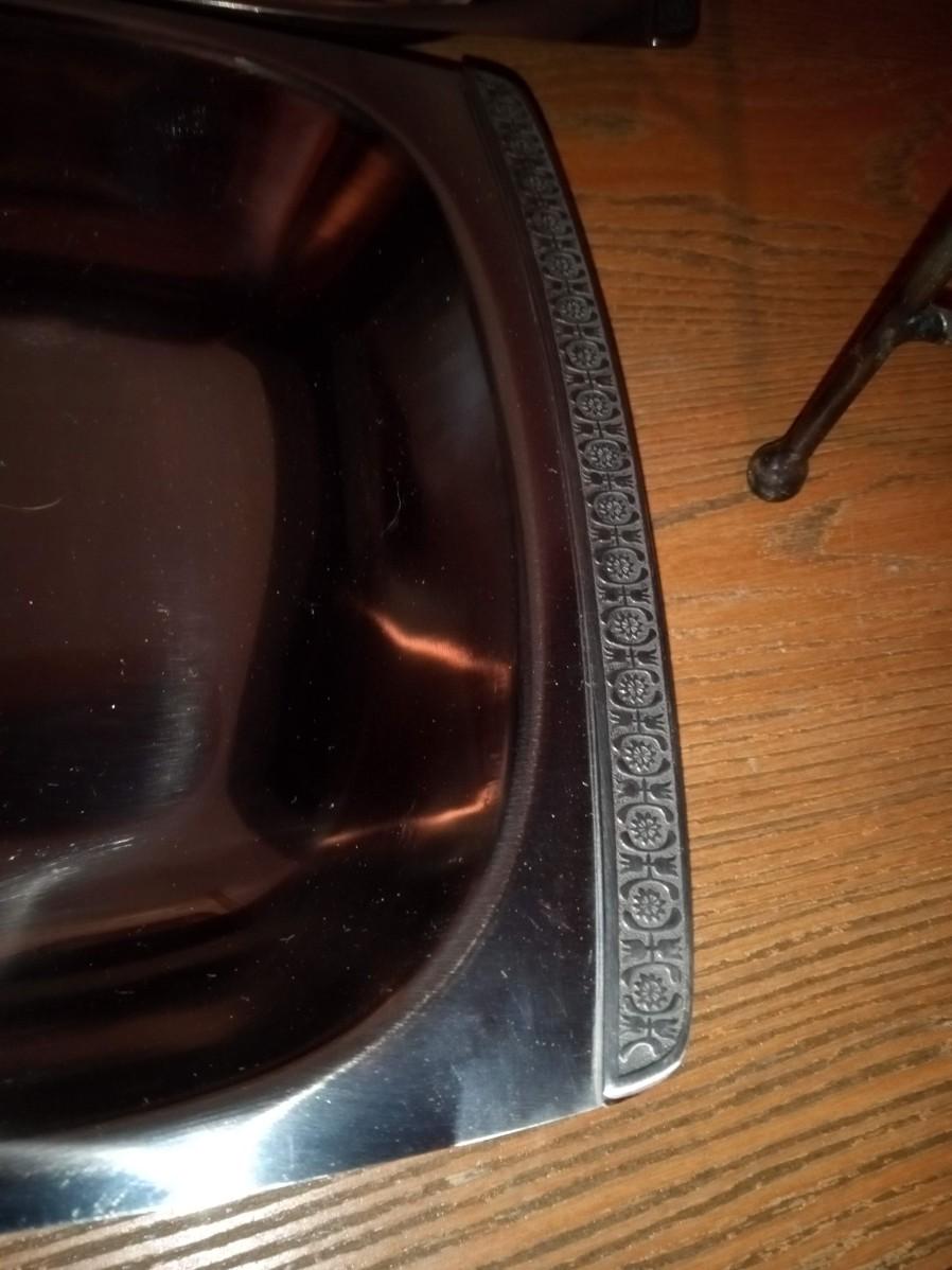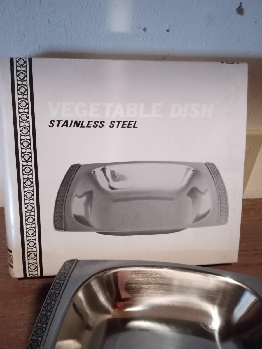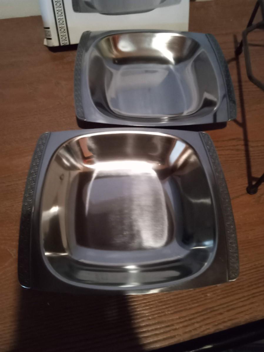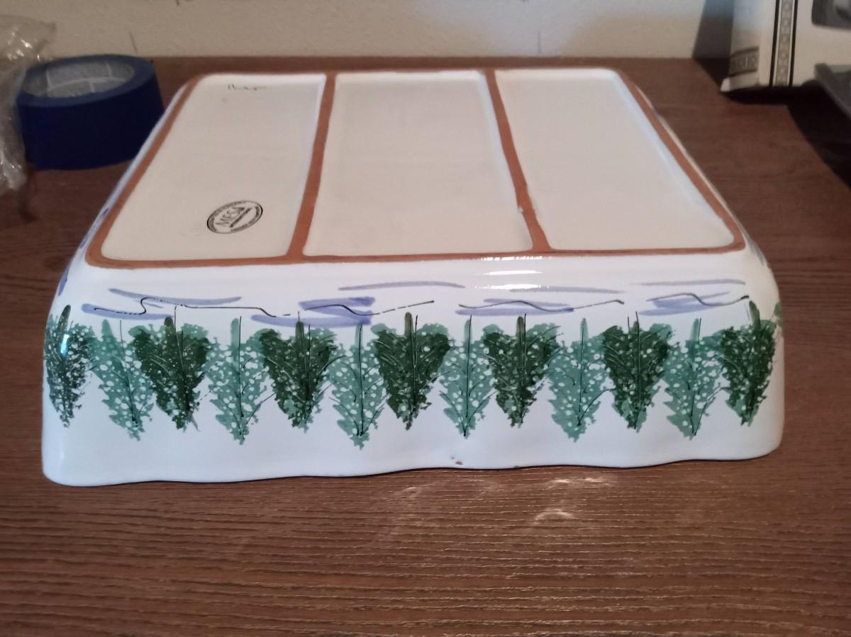 CLAY BAKING DISH IN AN IRON HOLDER AND 2 VEEGETABLE BOWLS