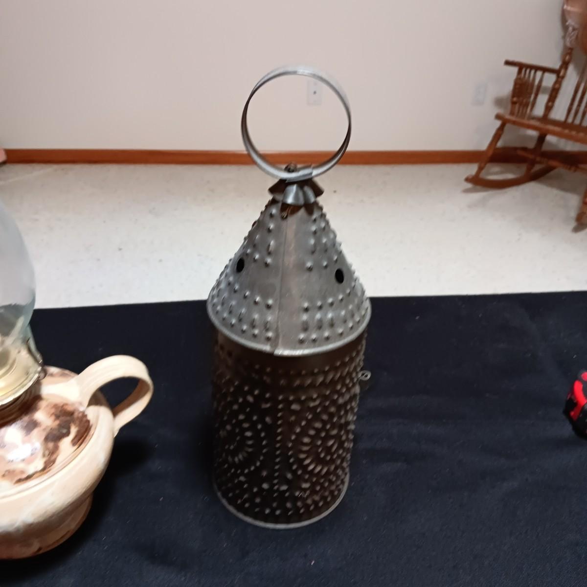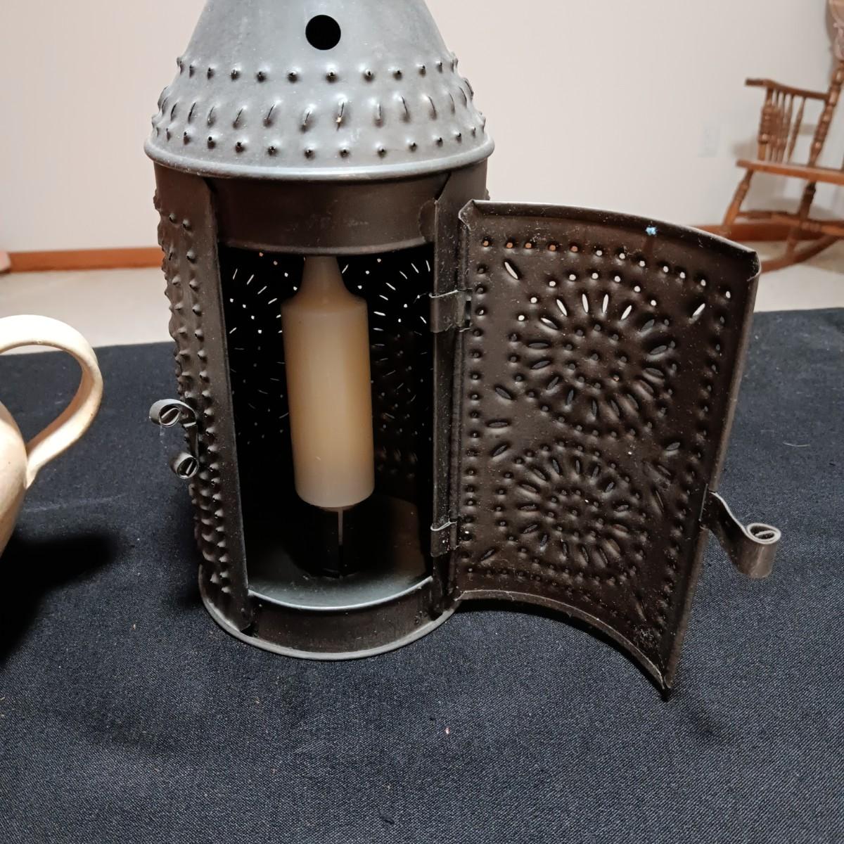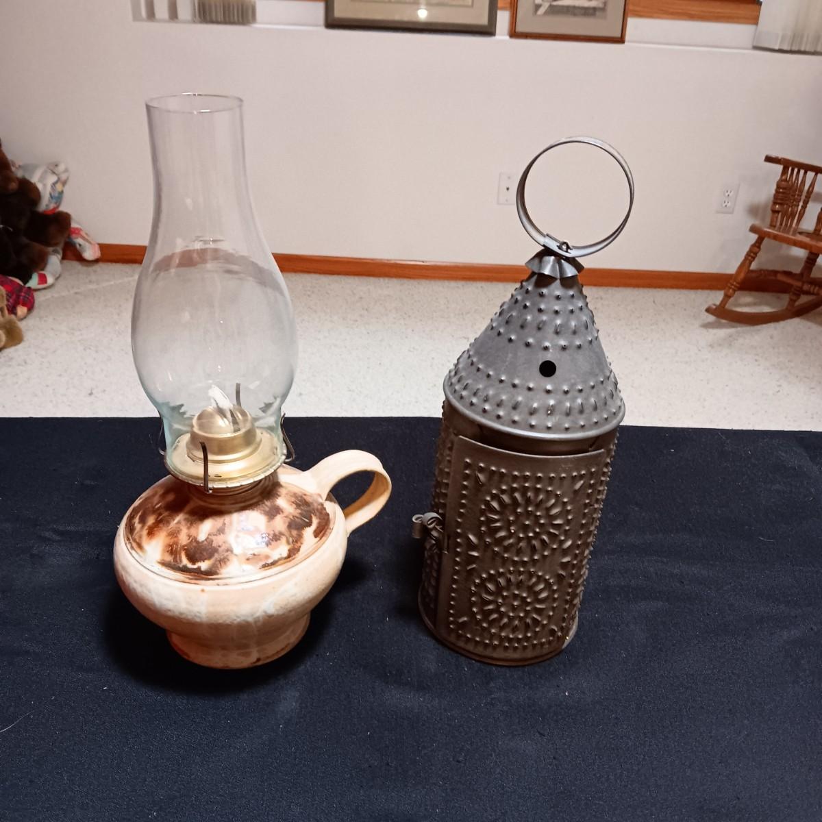 CLAY BASE LANTERN AND A TIN CANDLE LANTERN