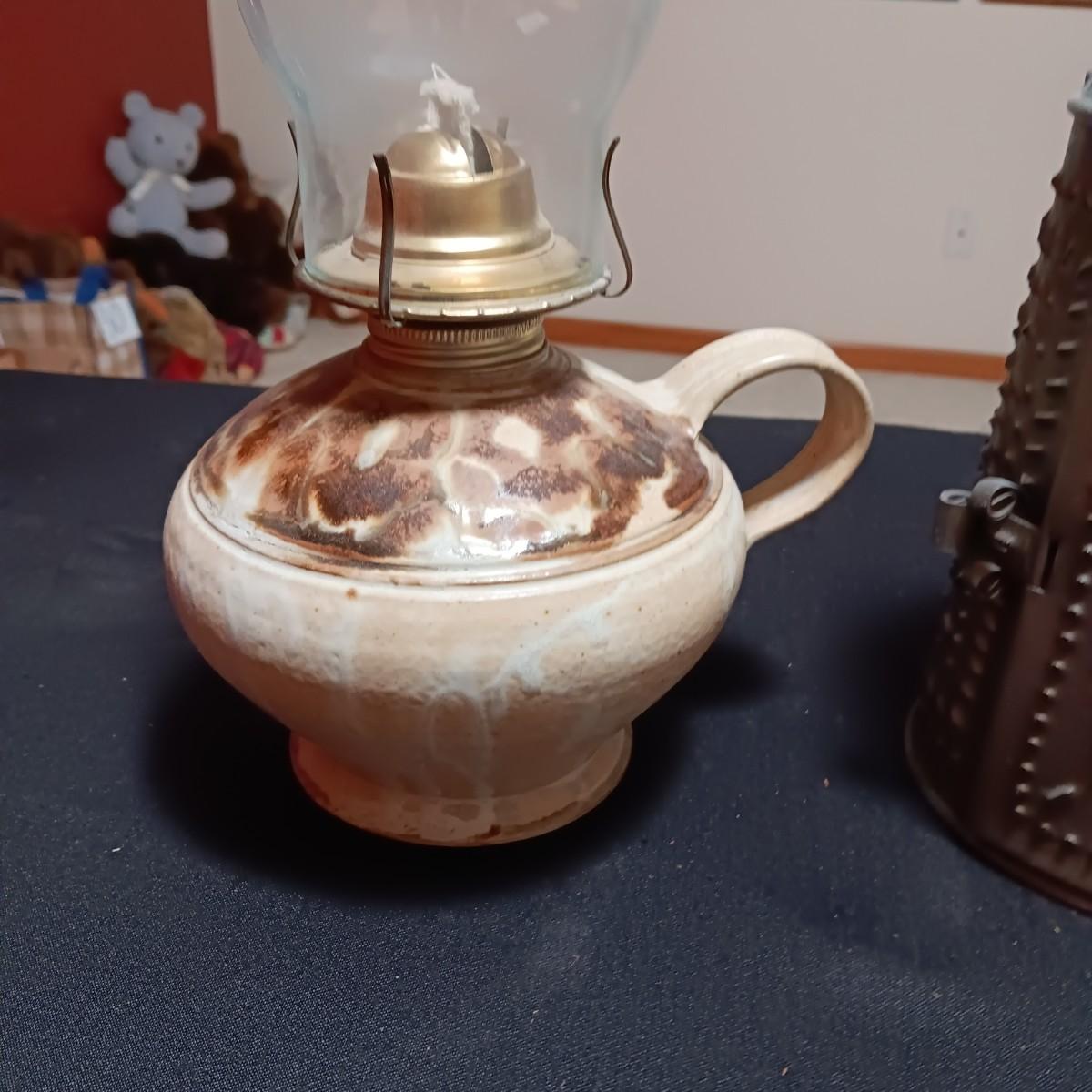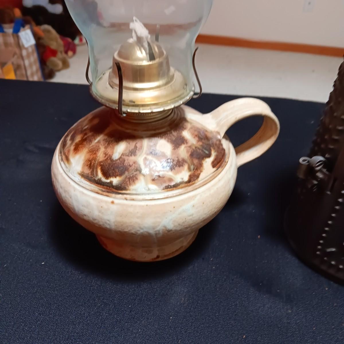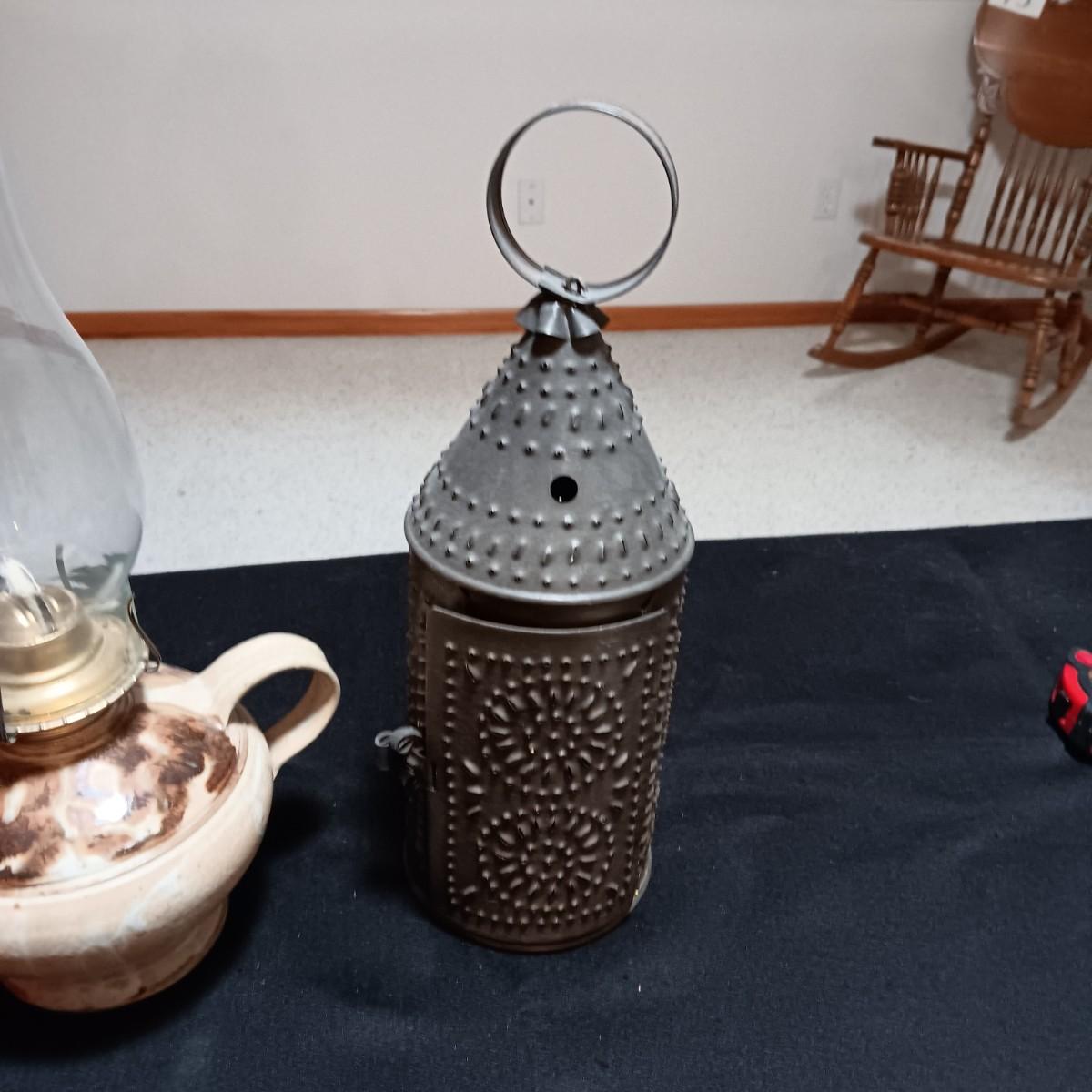 CLAY BASE LANTERN AND A TIN CANDLE LANTERN