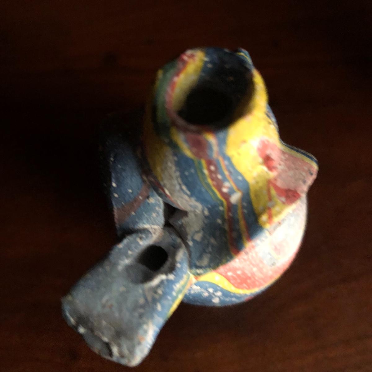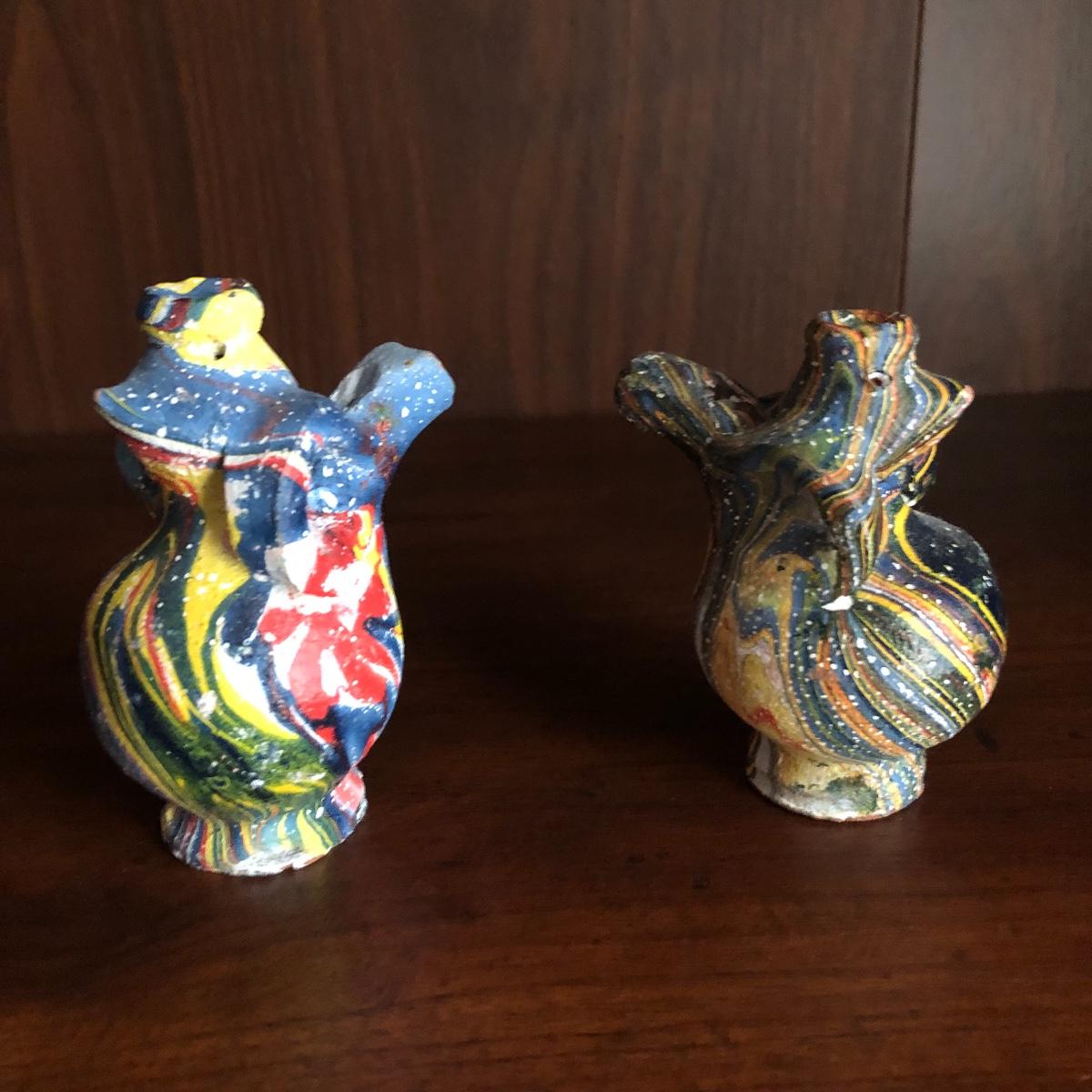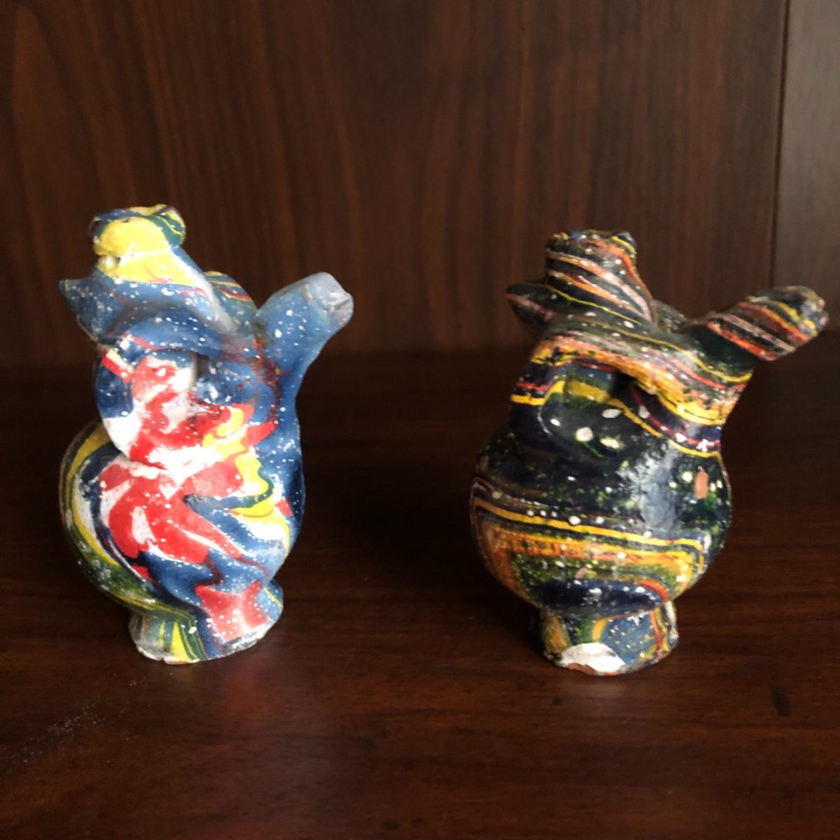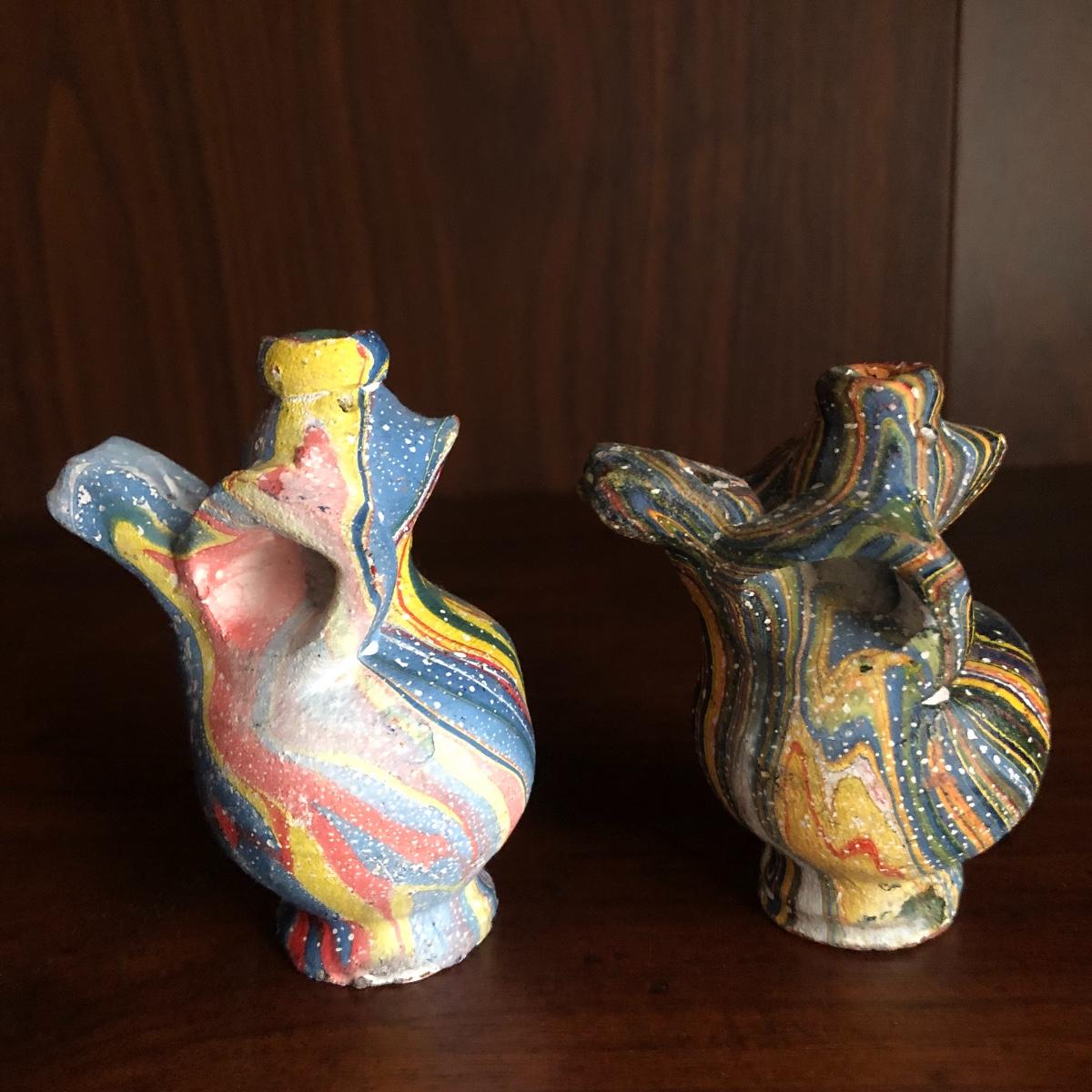 These two bird whistles/flutes are clay and look hand made. They stand over 3” tall. Note the chip on the base of the darker one. Shipping Available.