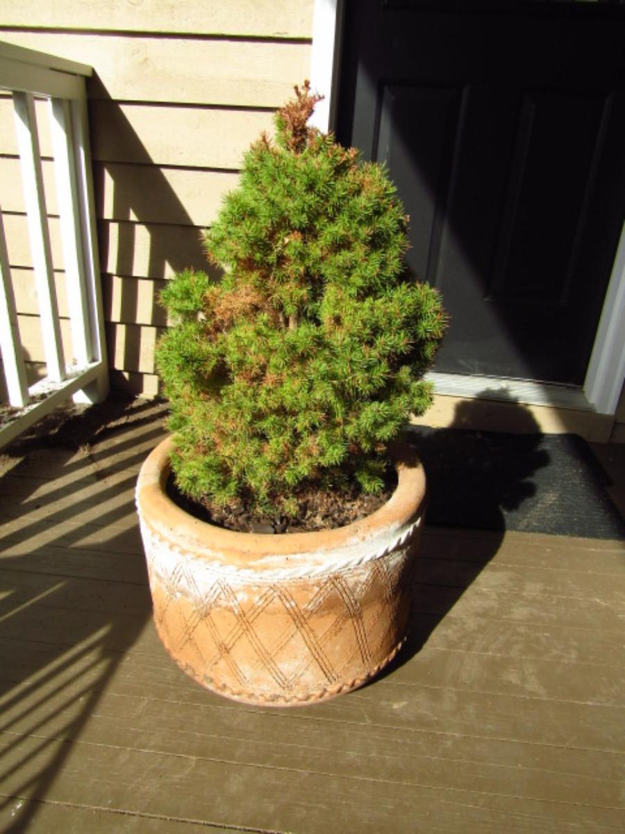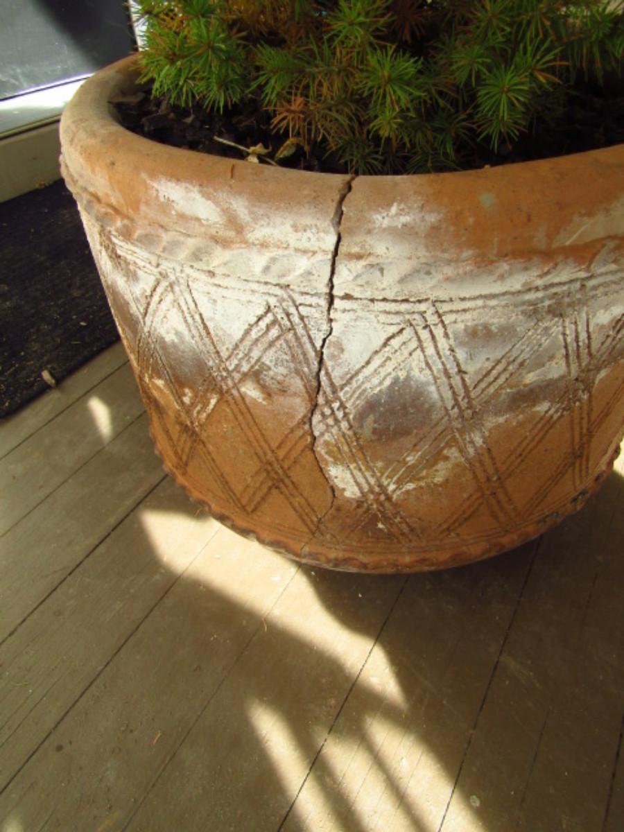 Clay Pot with Plant. Pot is cracked- plant measures approx 20" tall. Please see all pictures.