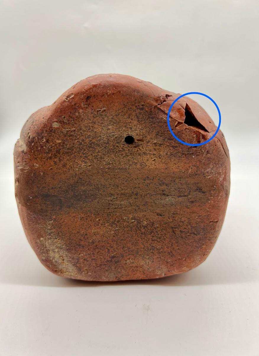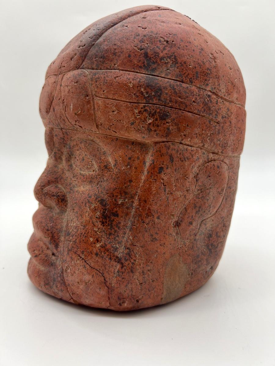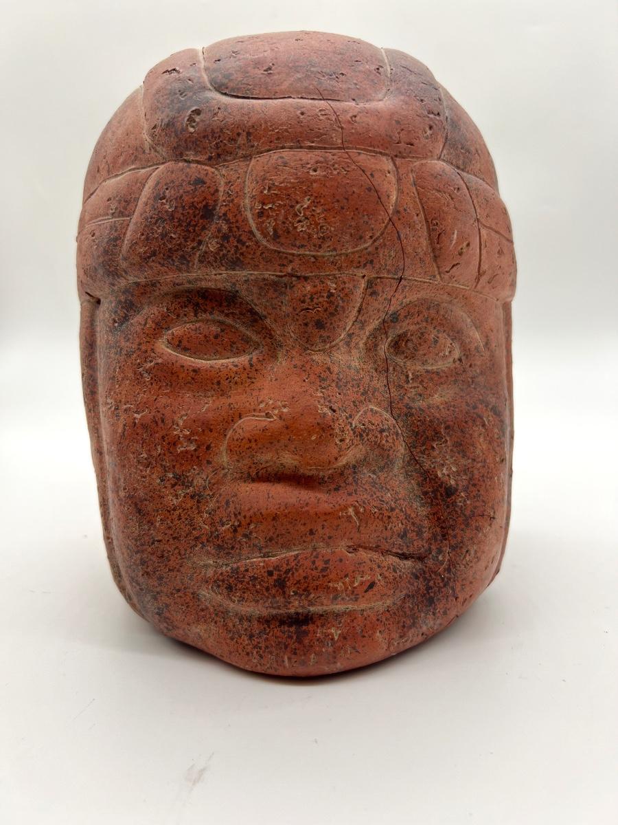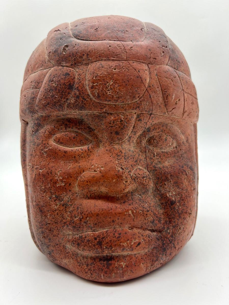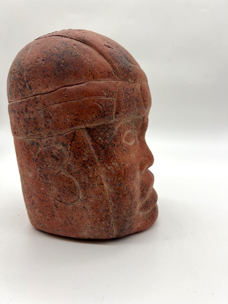Clay Pre Columbian Figure Face. Measures 9 inches tall and approximately 7 inches wide. Please note imperfections, has a thin crack down face and underneath has a chip. The chip is not noticeable while the statue is upright. See pictures