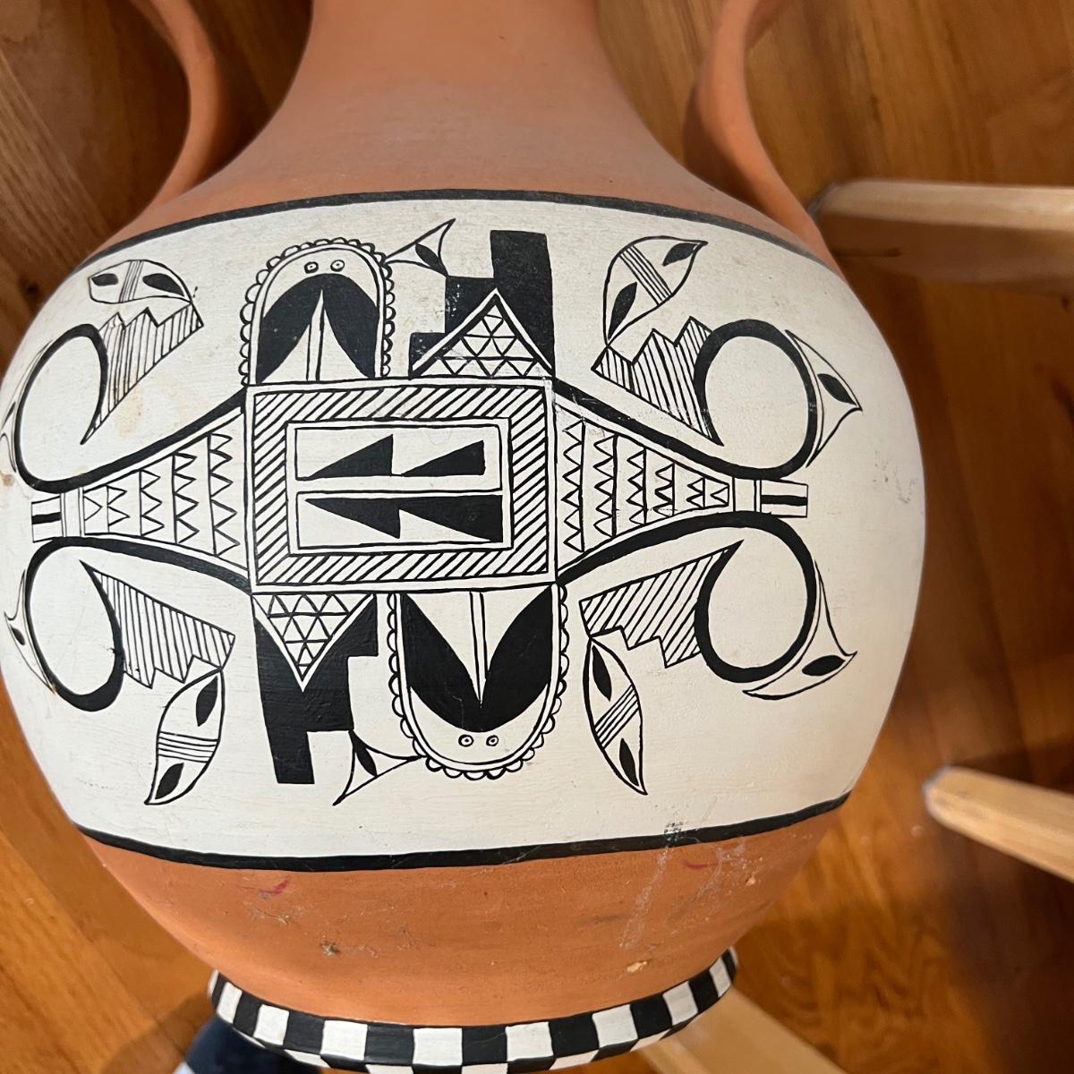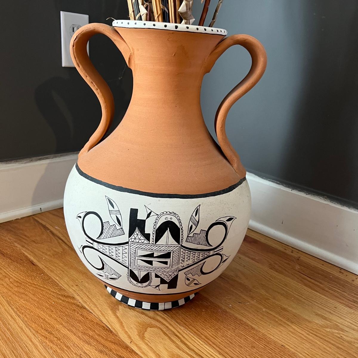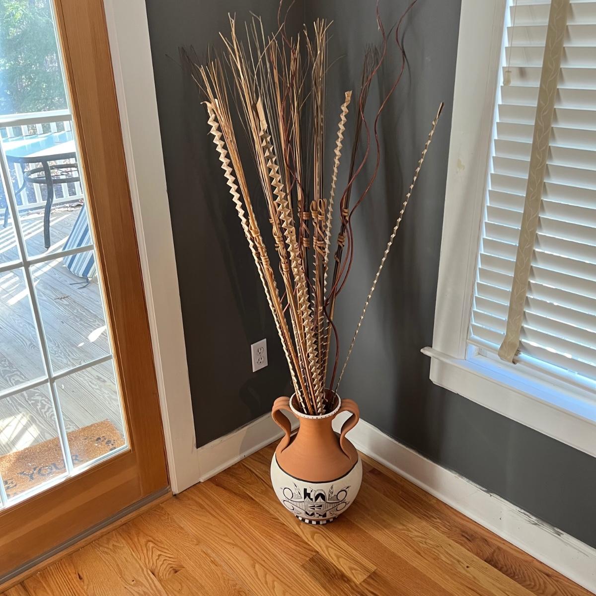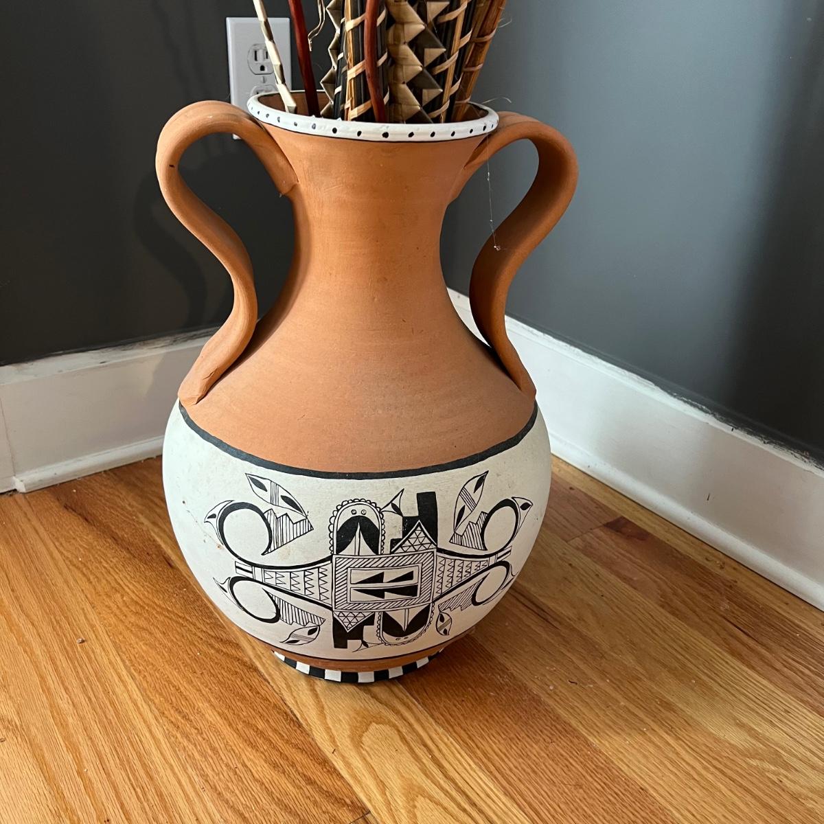 Painted pot 17”H and approximately 13”W at its widest point. Lovely Pueblo-like design and decorative sticks with interesting details as shown in photos. Pot is in good condition with no chips or cracks. The entire piece including sticks on the inside stands at roughly 60”H. Local pick up only.