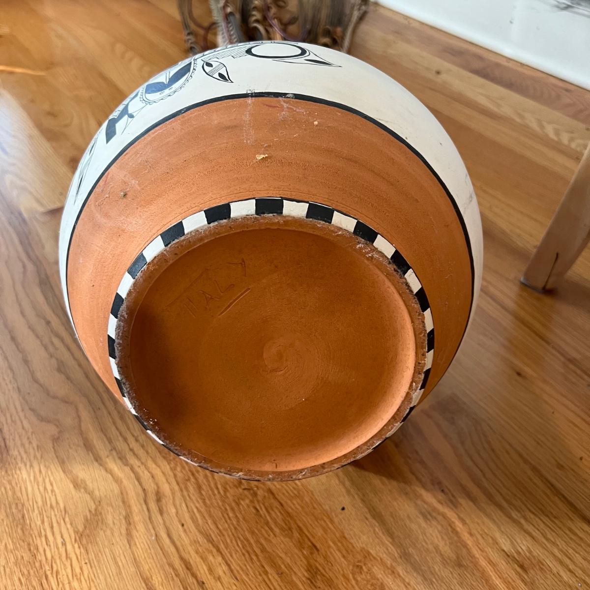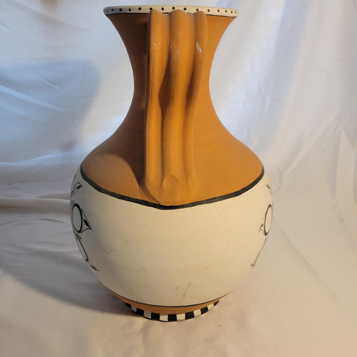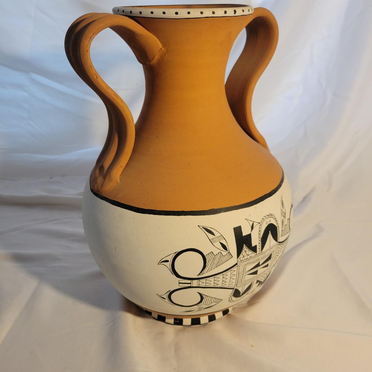 Painted pot 17”H and approximately 13”W at its widest point. Lovely Pueblo-like design and decorative sticks with interesting details as shown in photos. Pot is in good condition with no chips or cracks. The entire piece including sticks on the inside stands at roughly 60”H. Local pick up only.