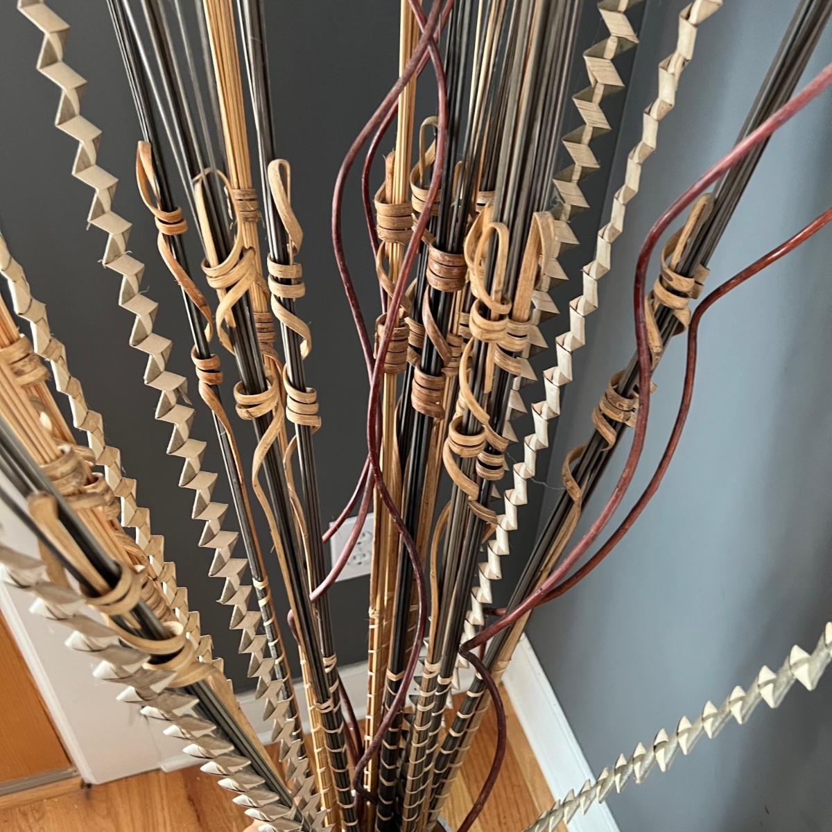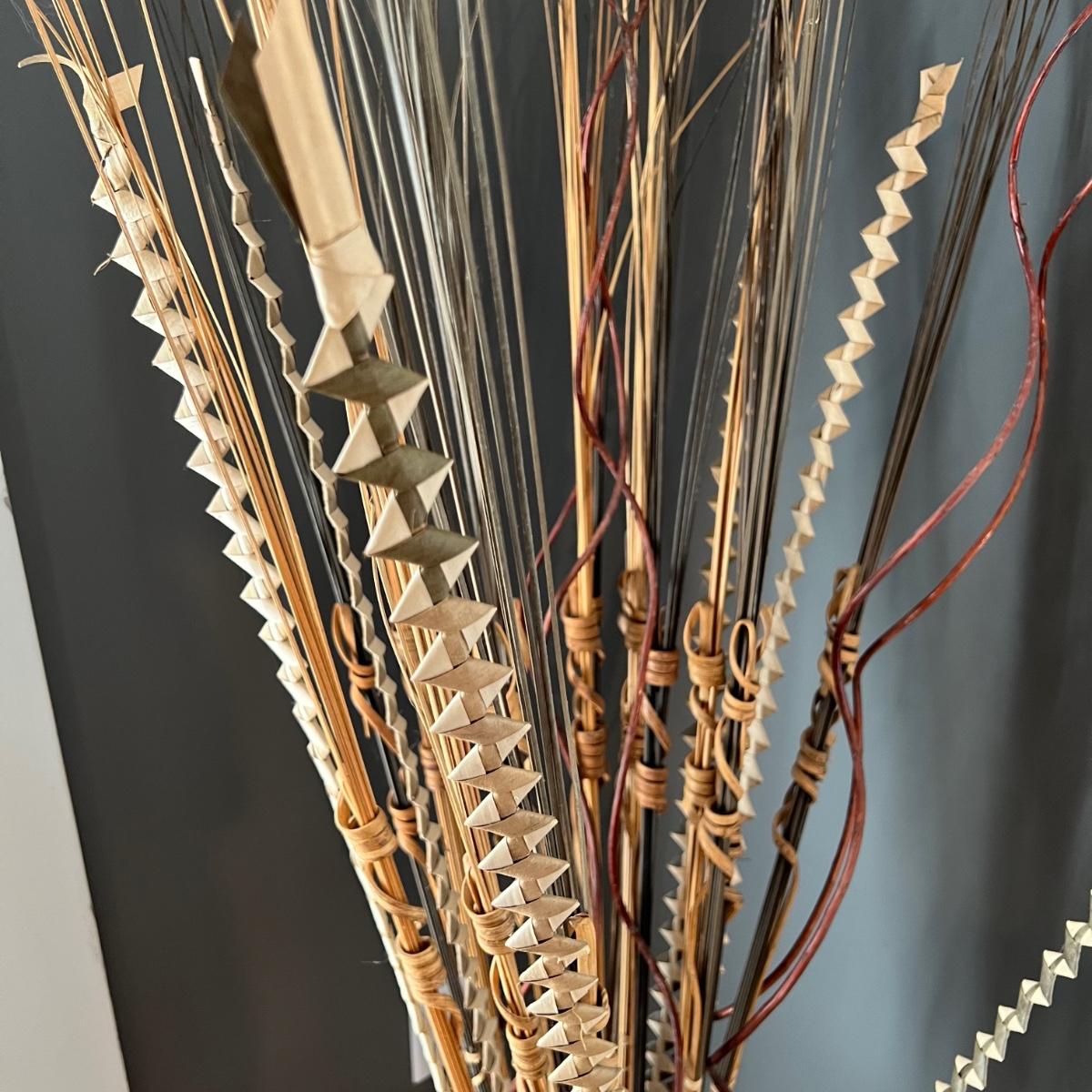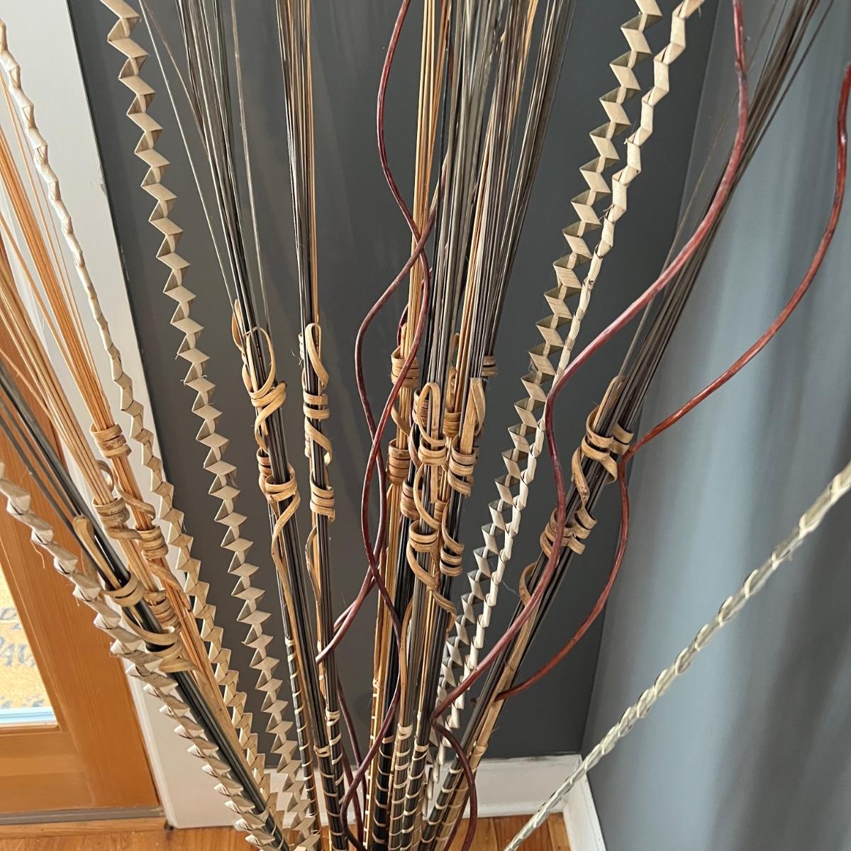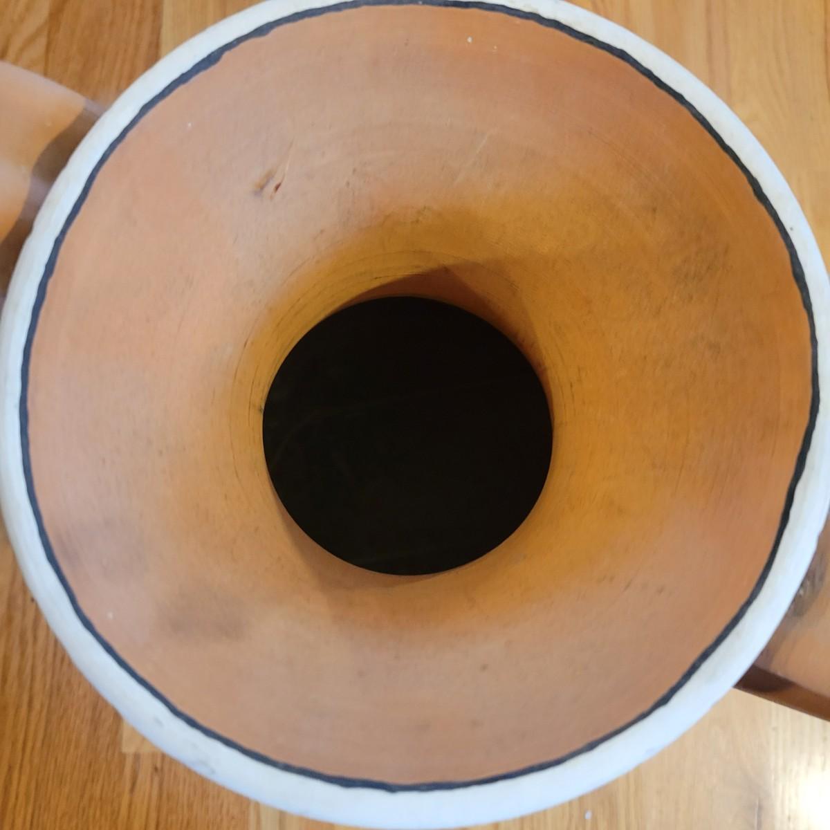 Painted pot 17”H and approximately 13”W at its widest point. Lovely Pueblo-like design and decorative sticks with interesting details as shown in photos. Pot is in good condition with no chips or cracks. The entire piece including sticks on the inside stands at roughly 60”H. Local pick up only.