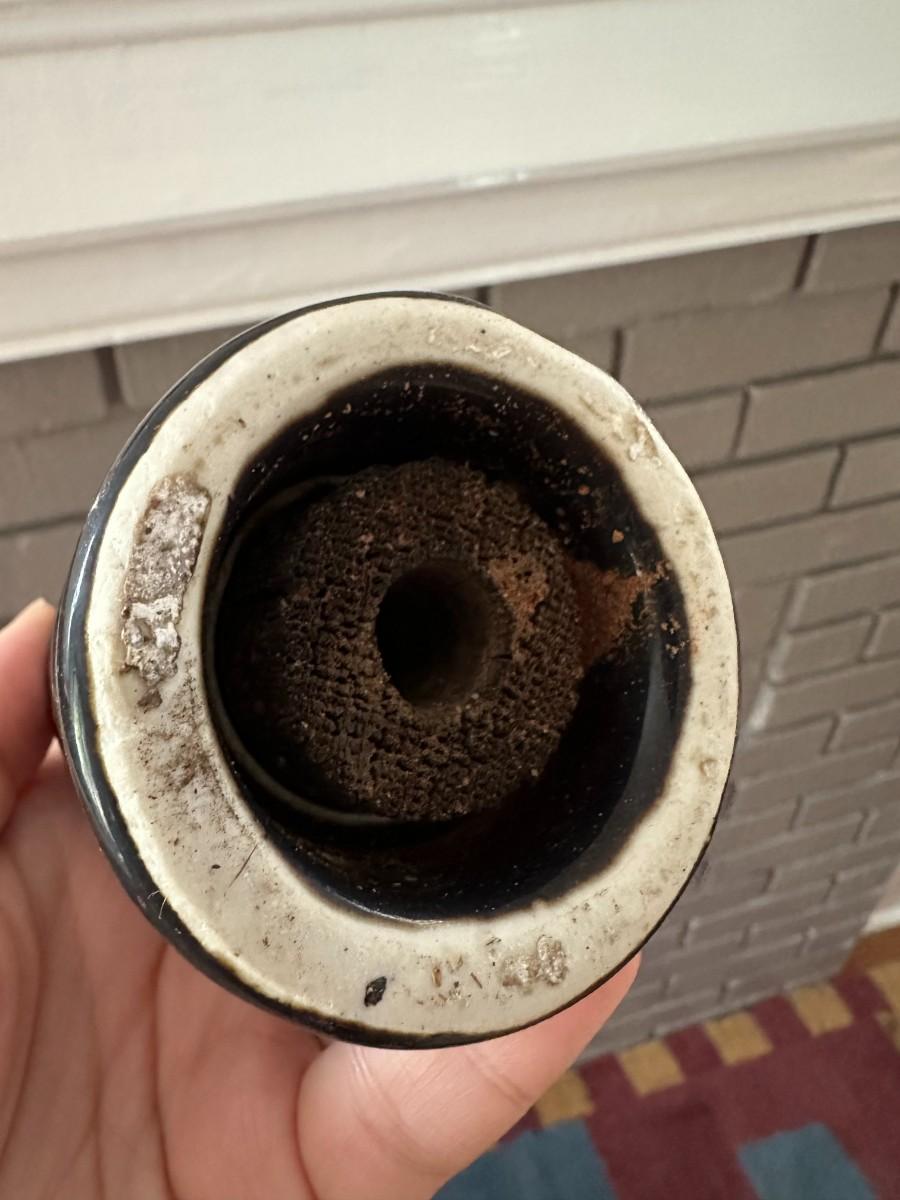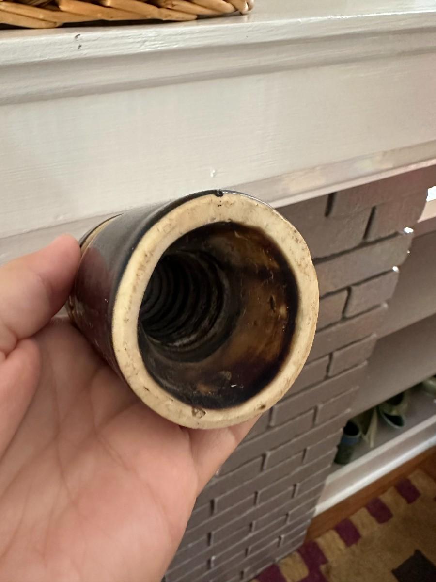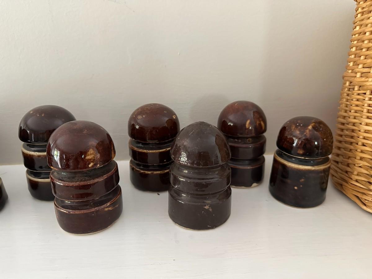10 Brown Clay Telephone Insulators and 1 8"h Tan Wicker Basket