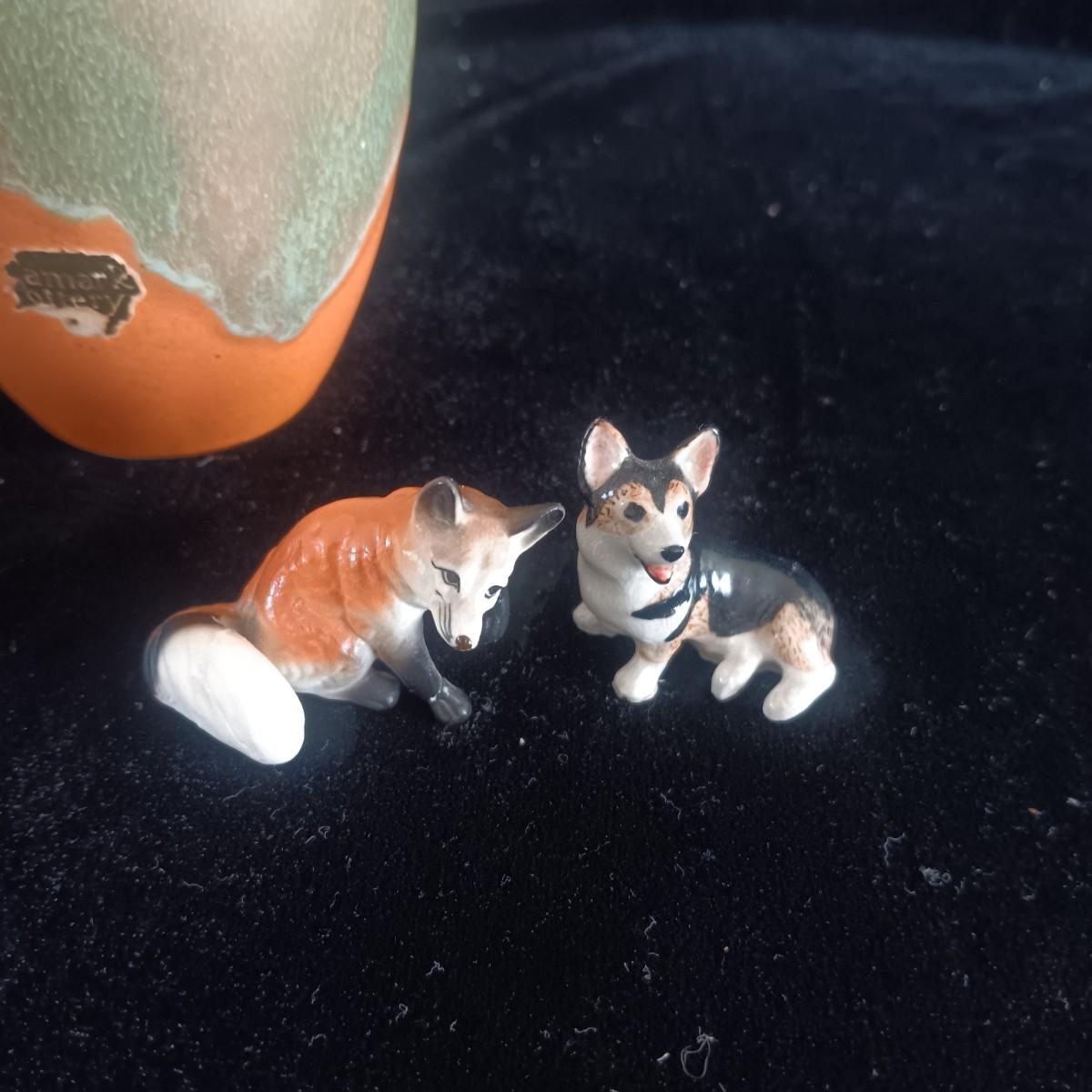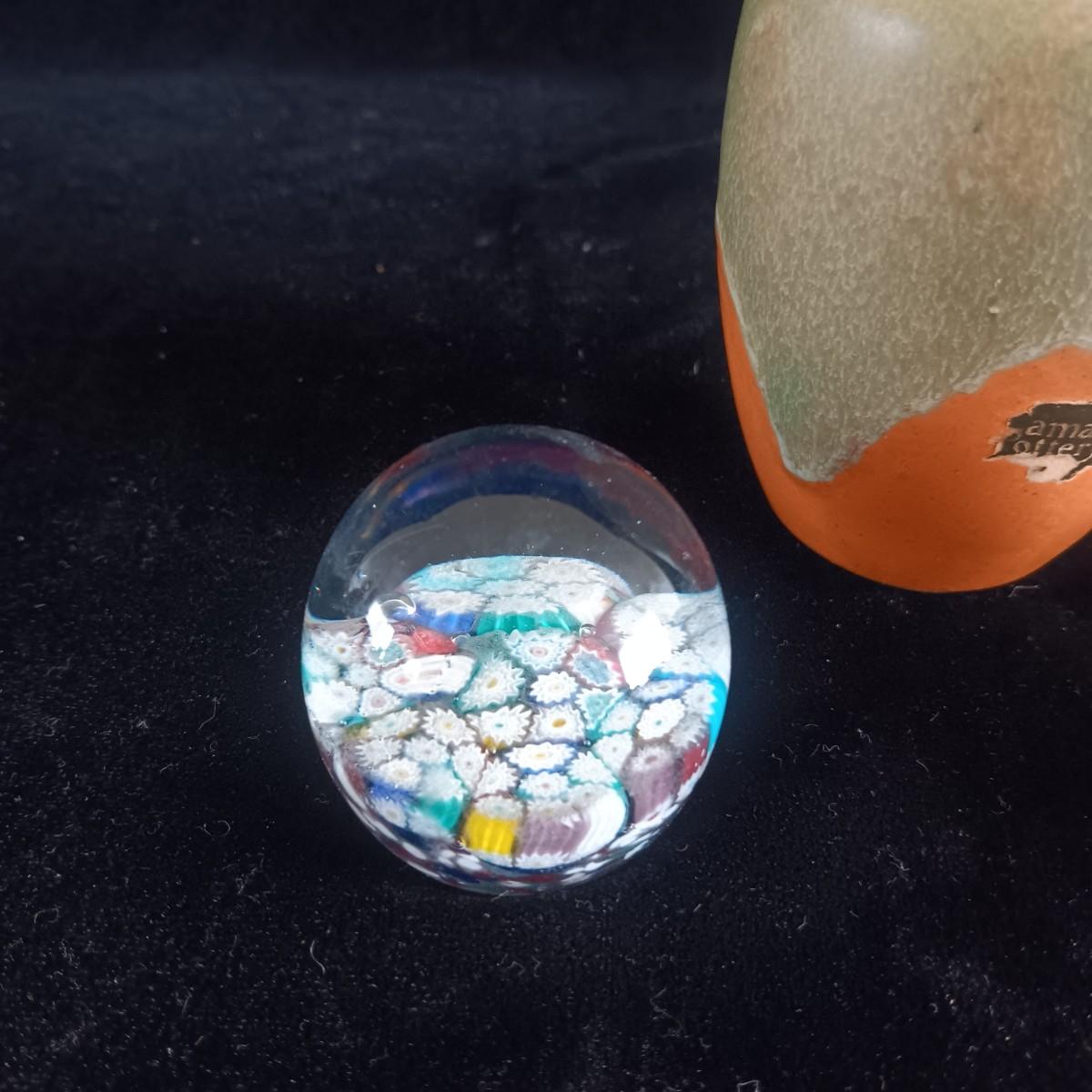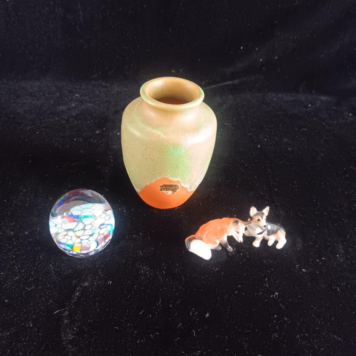CLAY VASE, SMALL GLASS PAPER WEIGHT AND MINIATURE DOG AND FOX