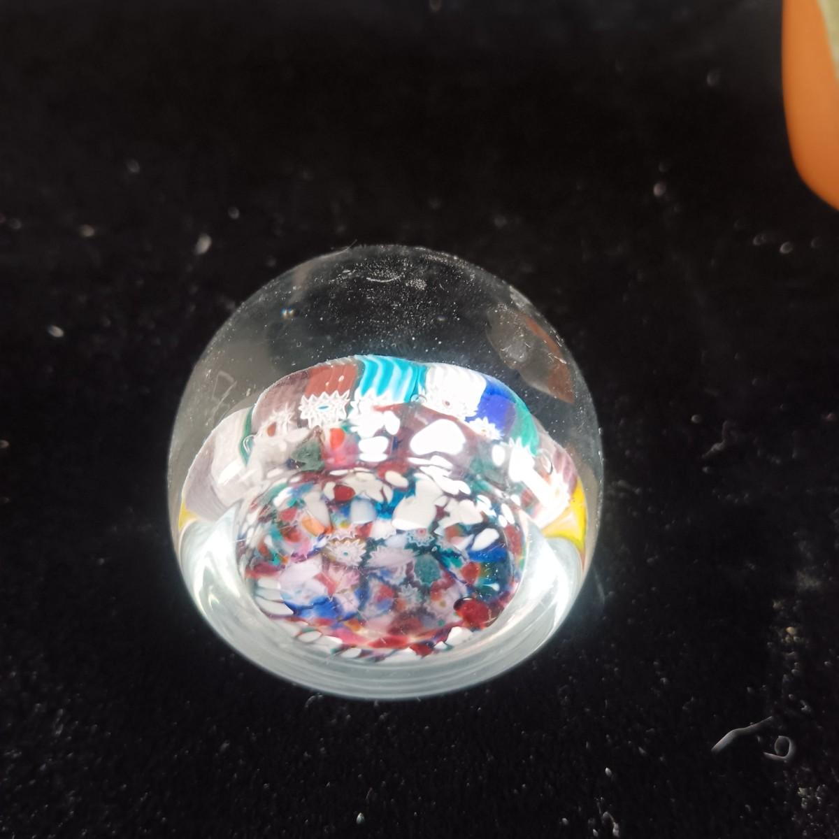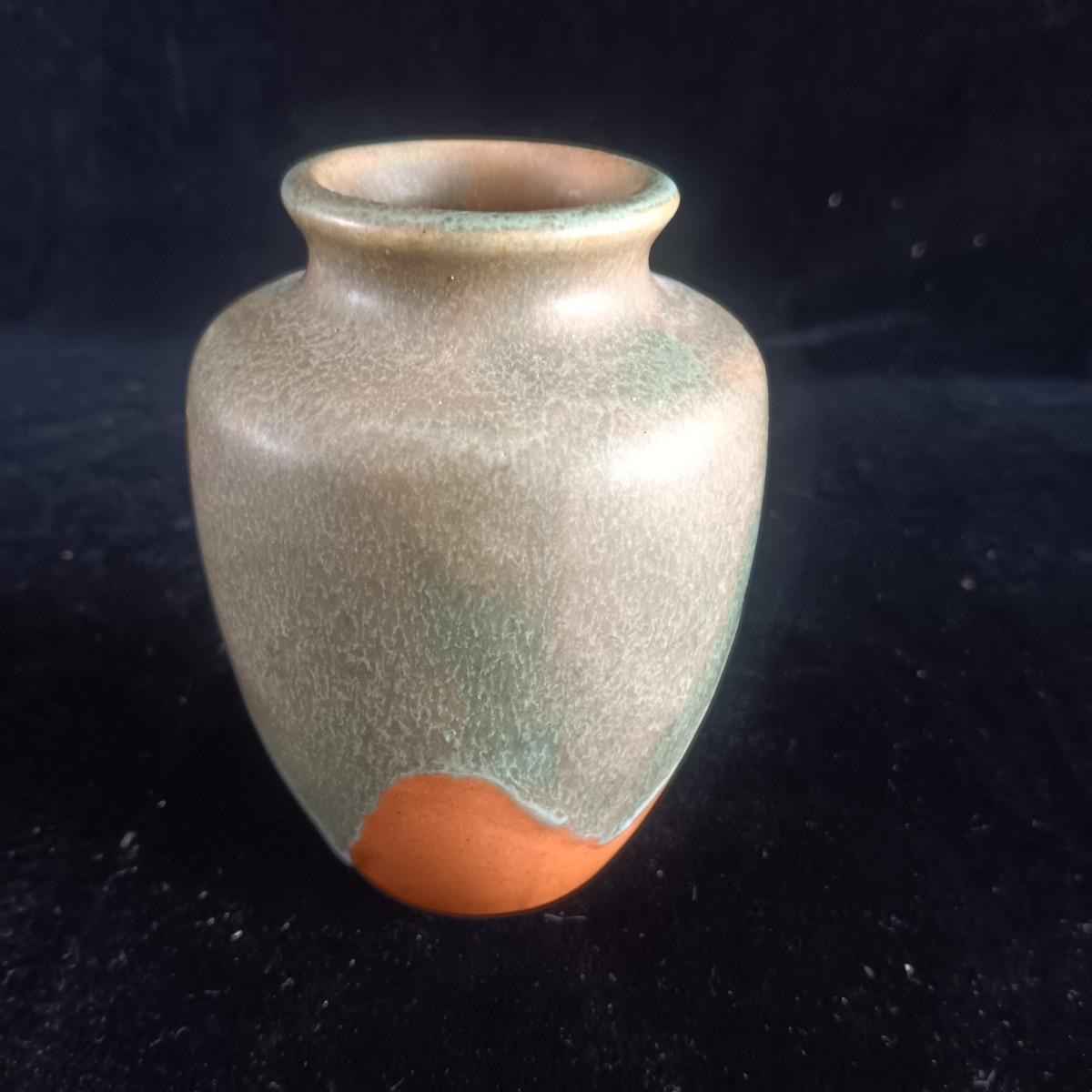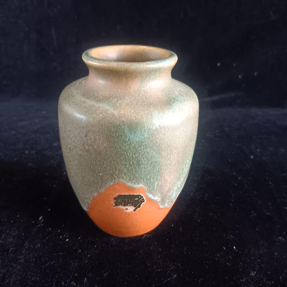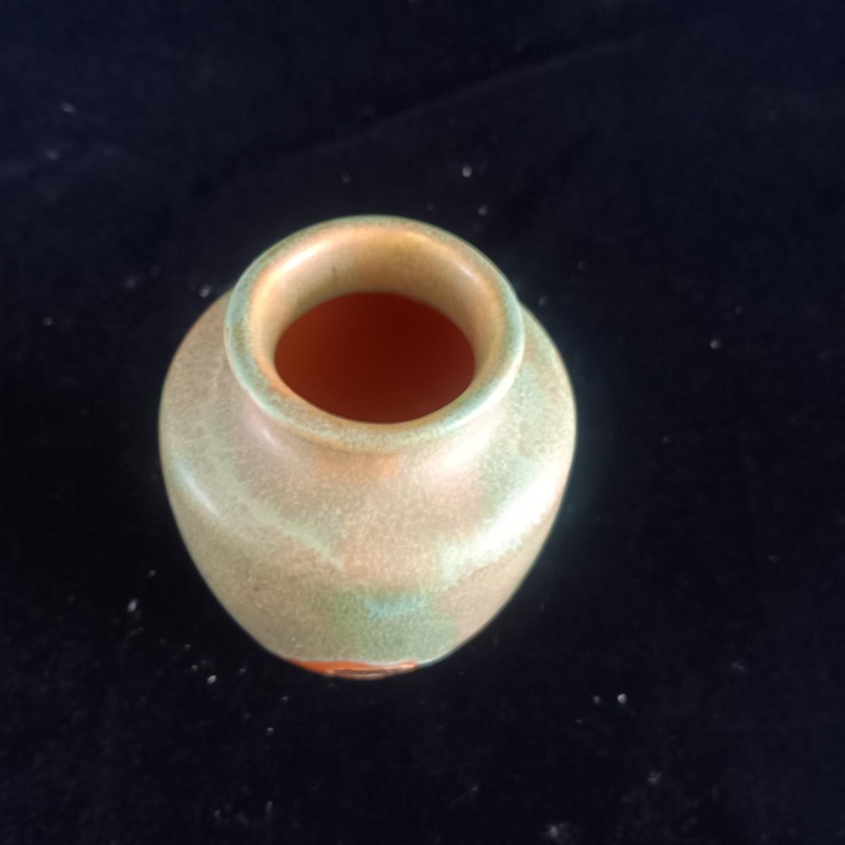 CLAY VASE, SMALL GLASS PAPER WEIGHT AND MINIATURE DOG AND FOX