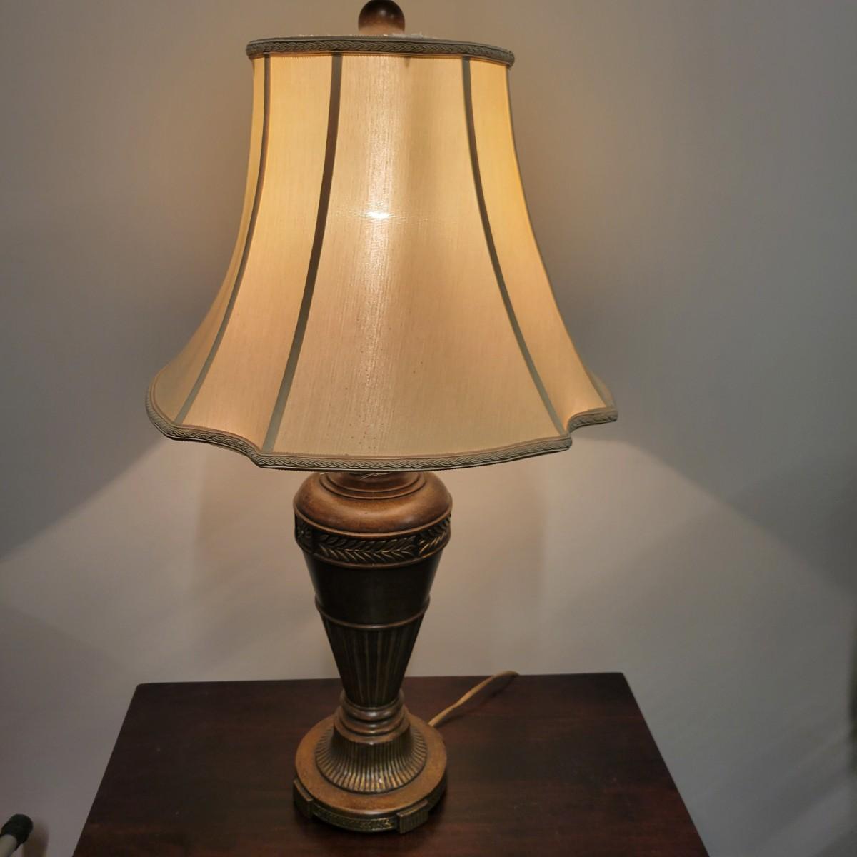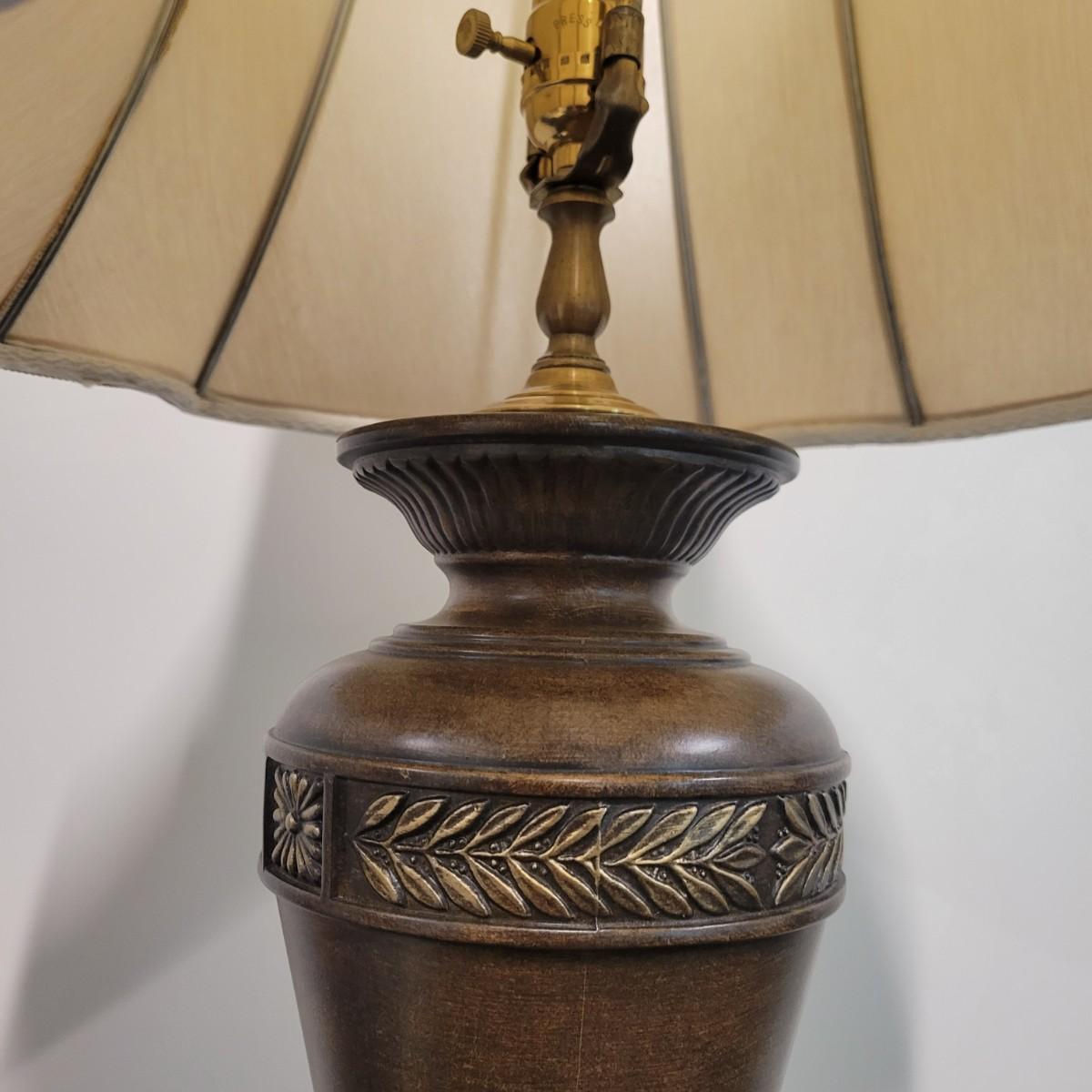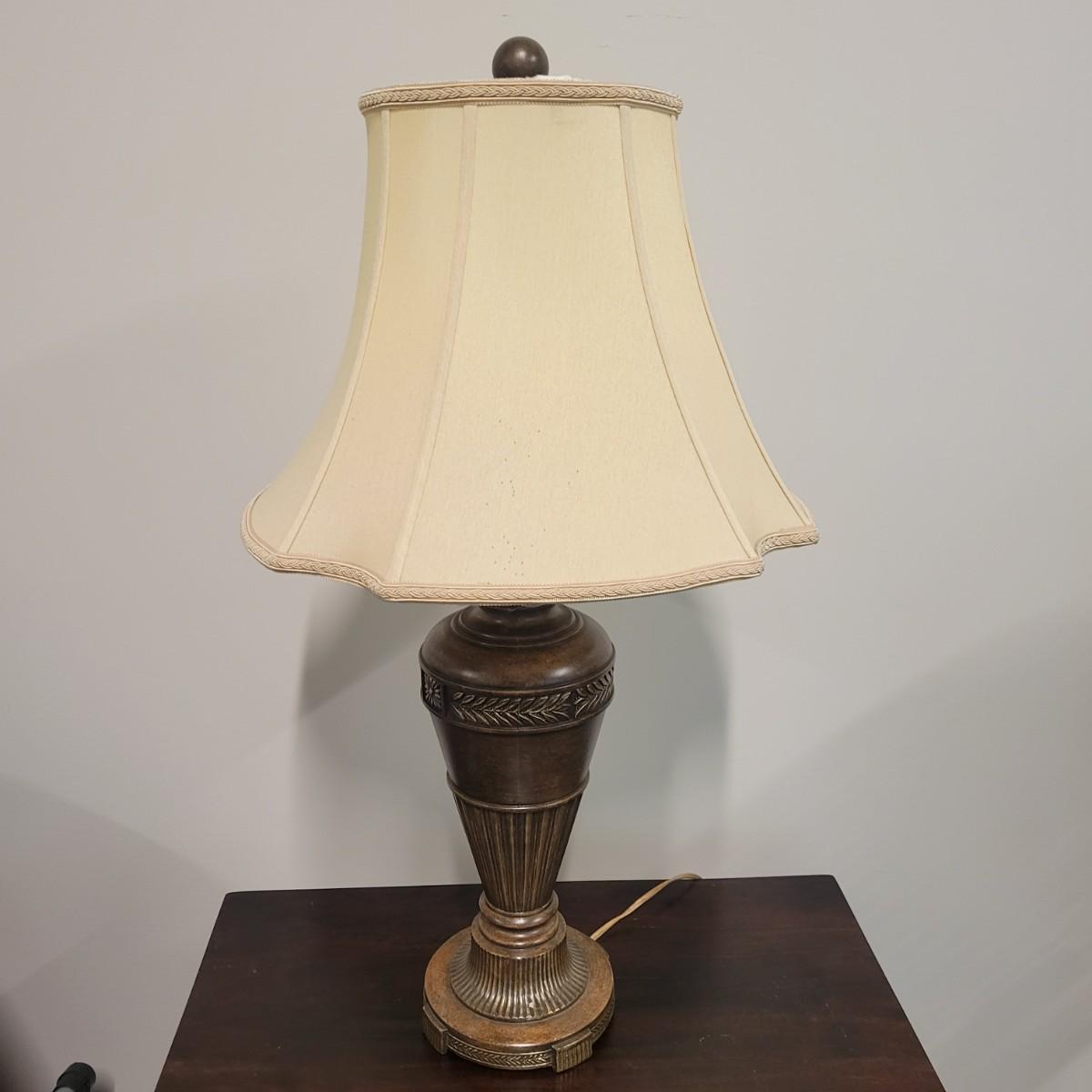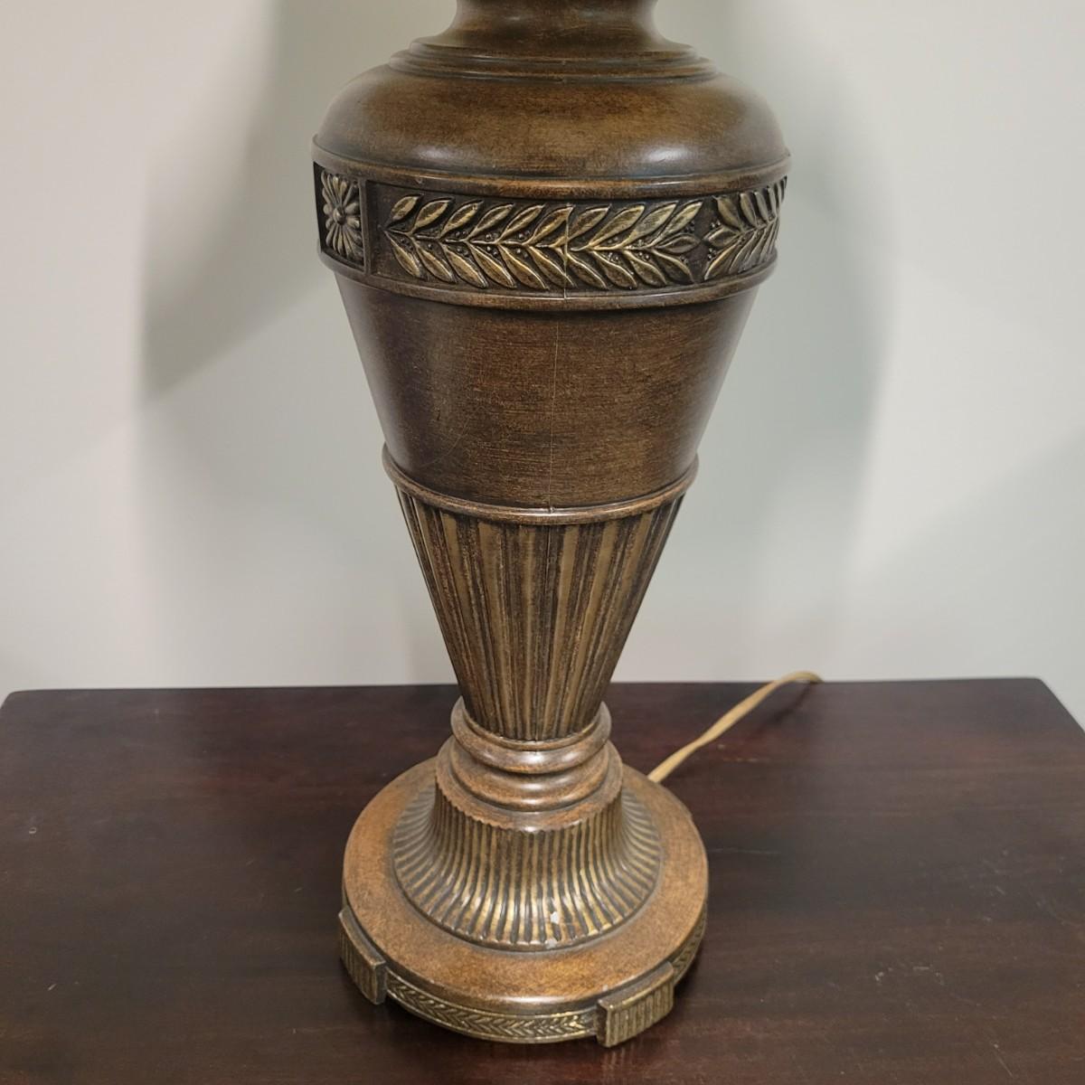 A fluted urn table lamp that powered on when plugged in. It is made of metal with a tobacco colored finish and a three way switch. It measures approximately 6"D x 31"H. There is some spotting on the shade. Local pickup only