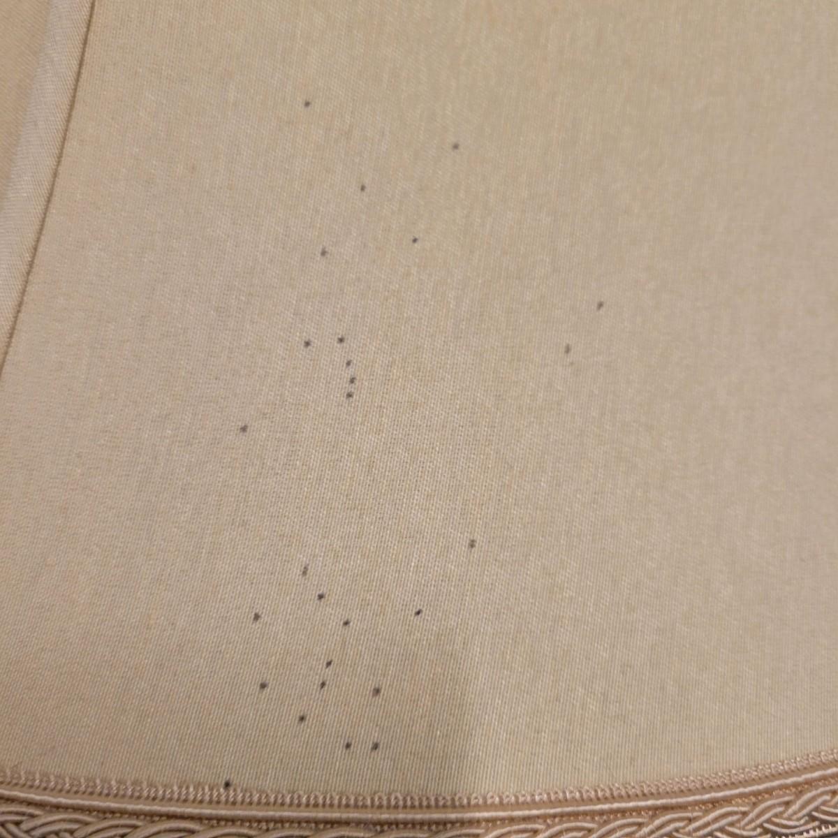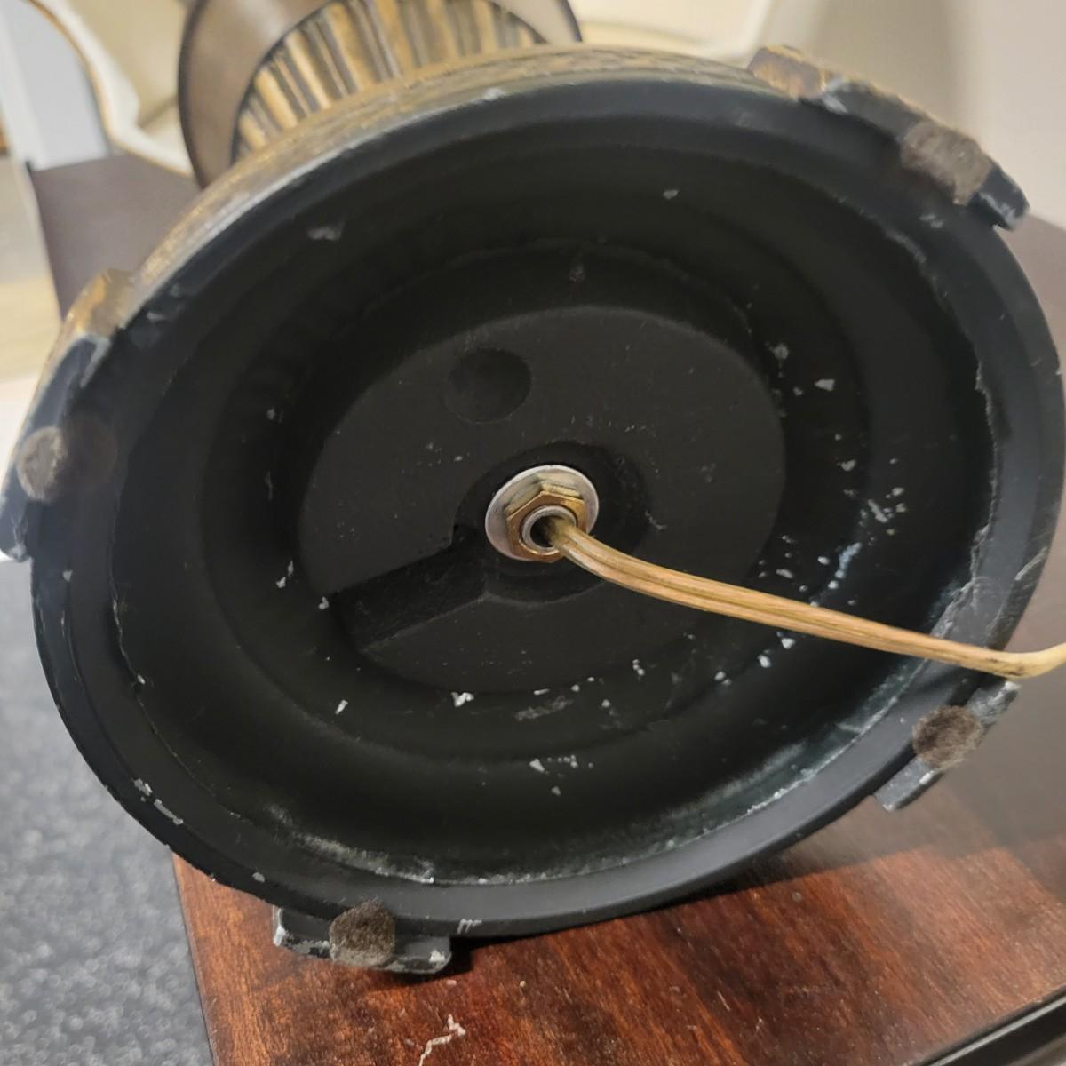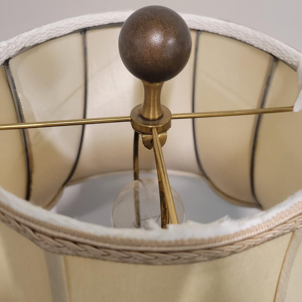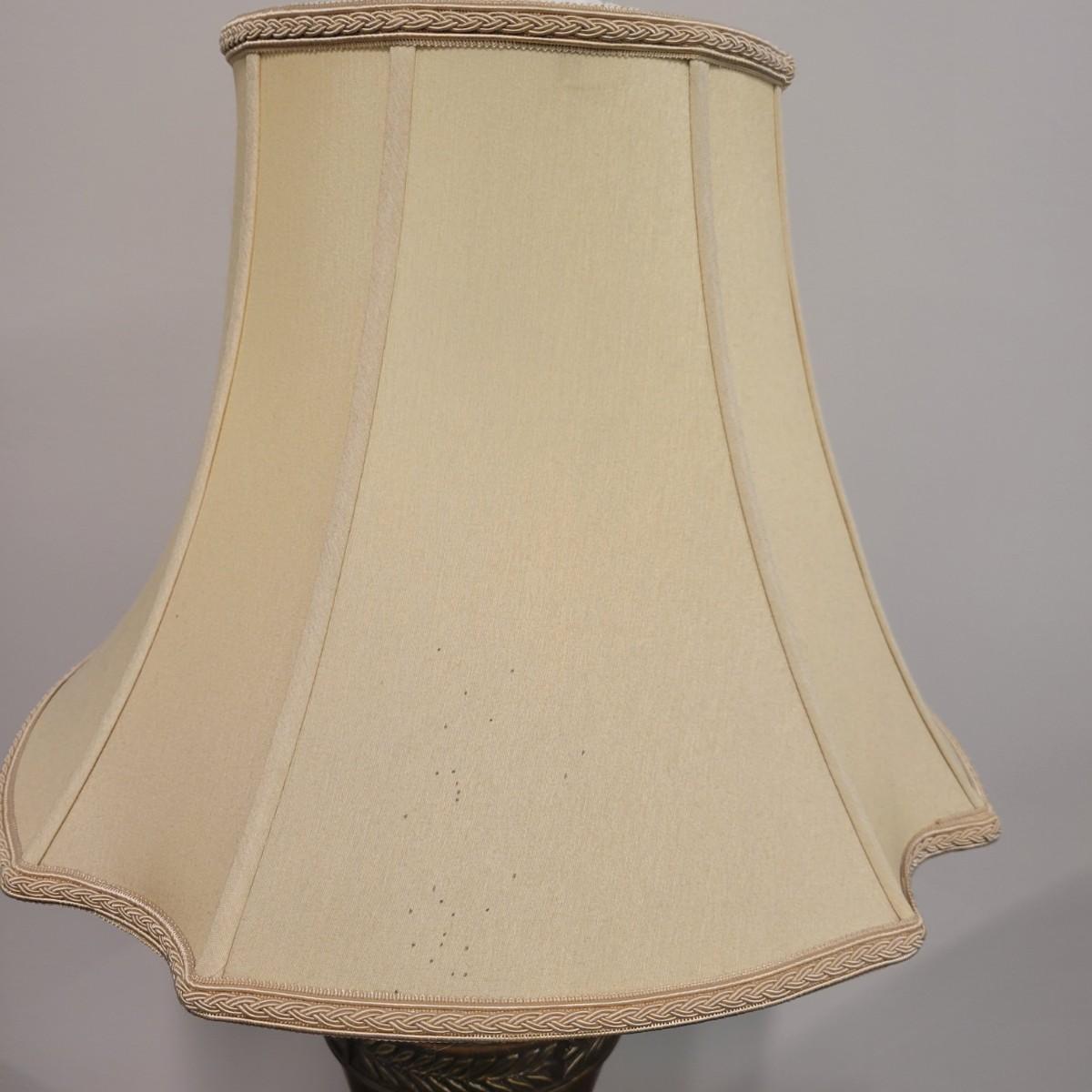 A fluted urn table lamp that powered on when plugged in. It is made of metal with a tobacco colored finish and a three way switch. It measures approximately 6"D x 31"H. There is some spotting on the shade. Local pickup only