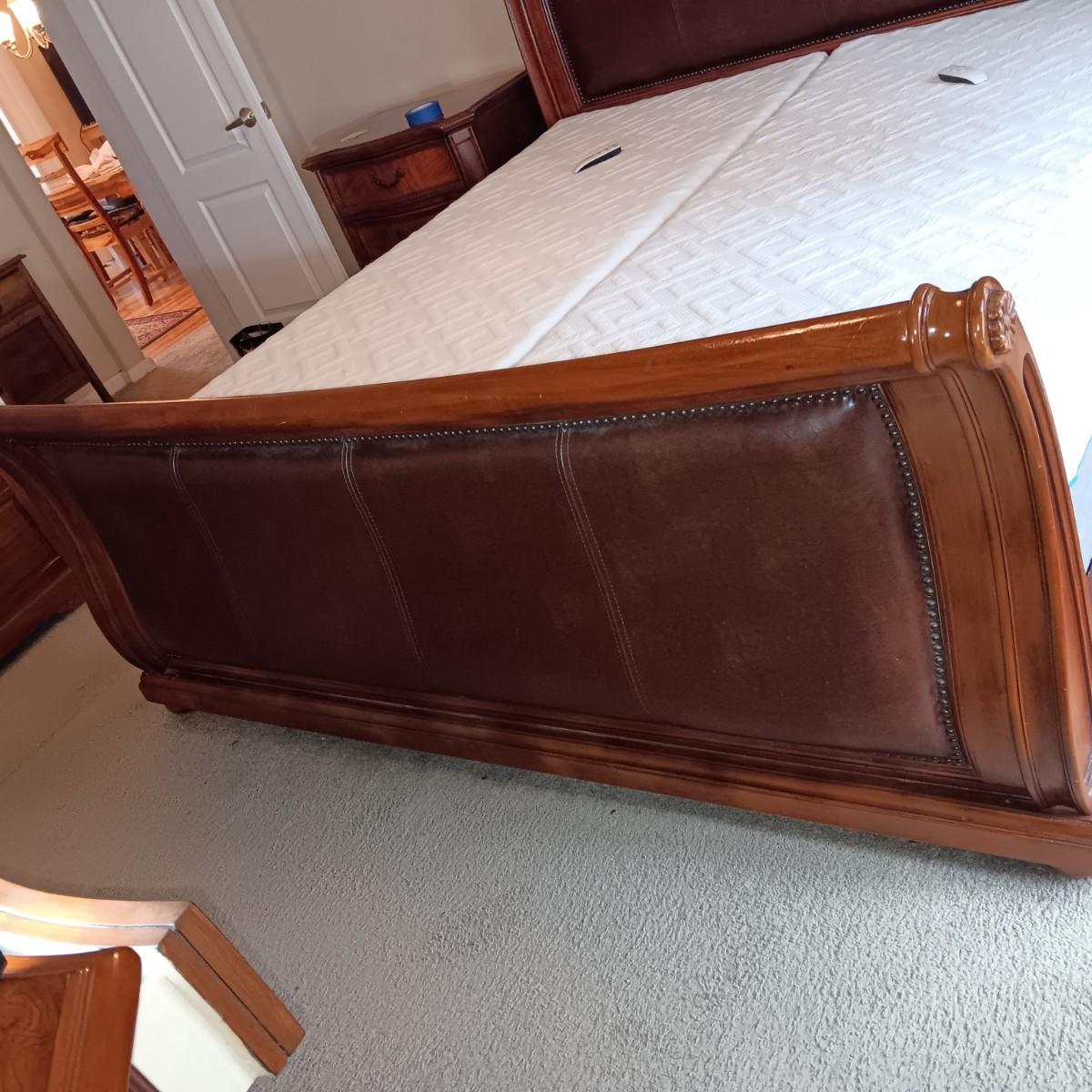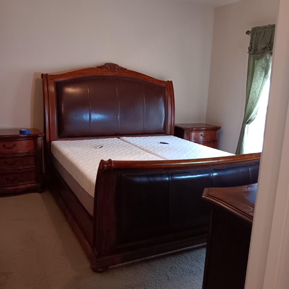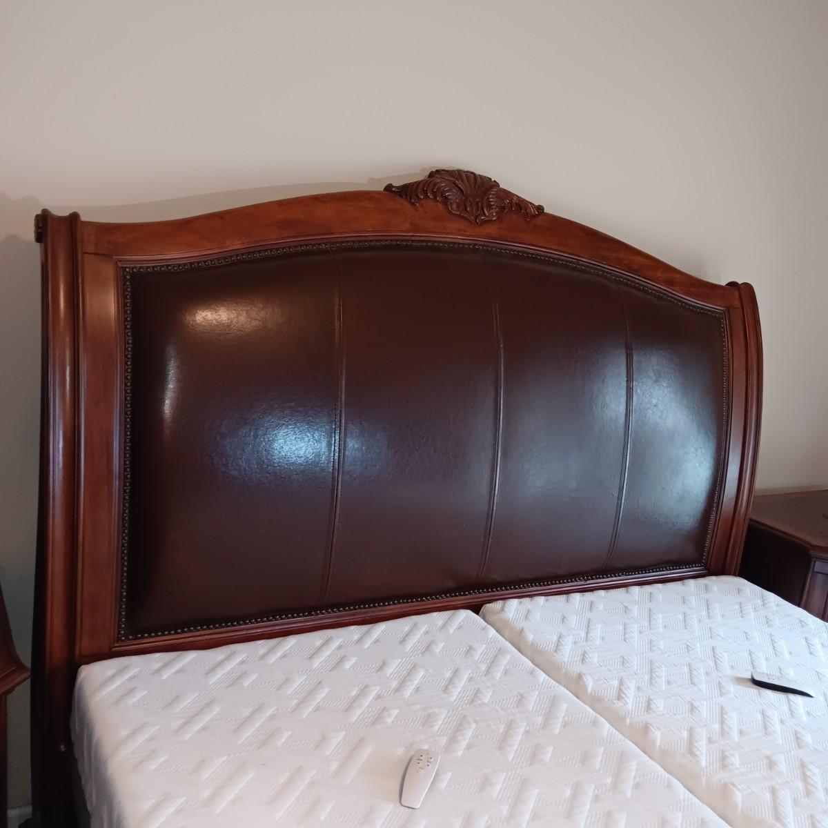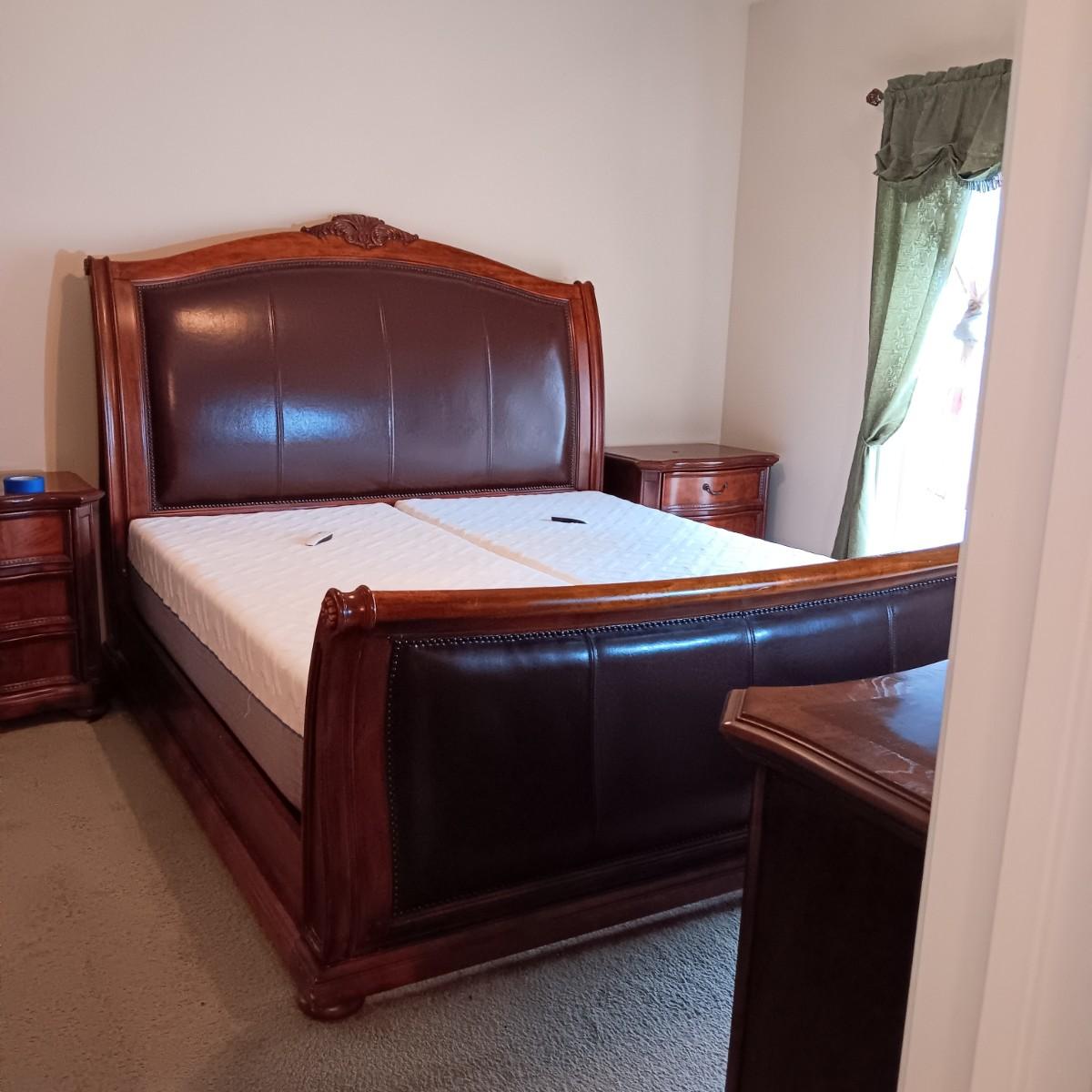 CLEAN BEAUTYREST SOUTH BAY INT. DUAL ELECTRIC ADJUSTABLE FOAM MATTRESSES W/A WOOD AND LEATHER SLEIGH BED FRAME