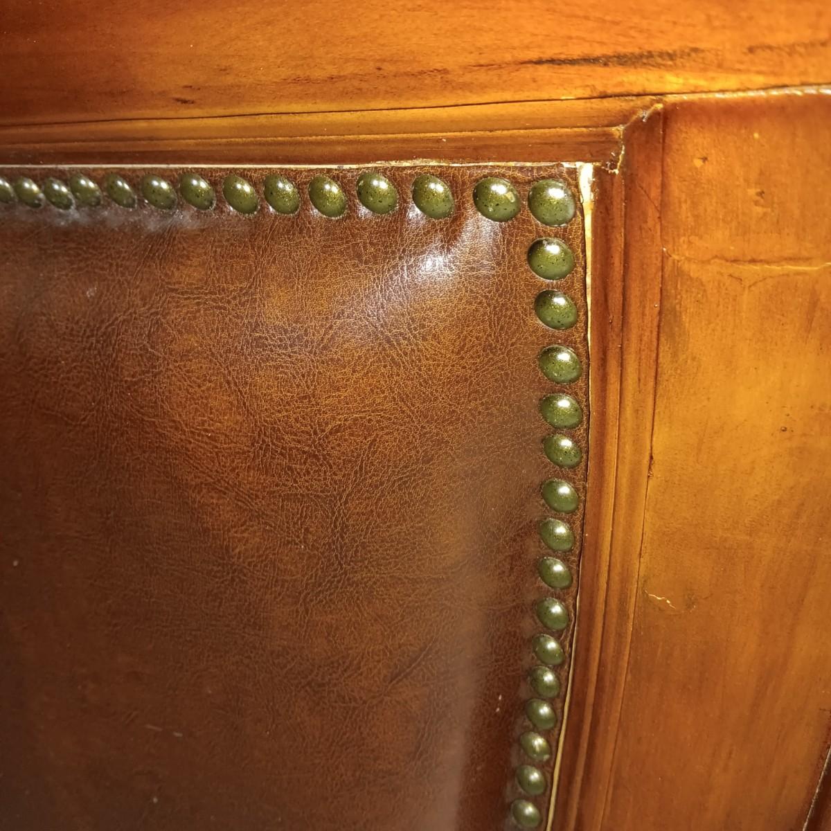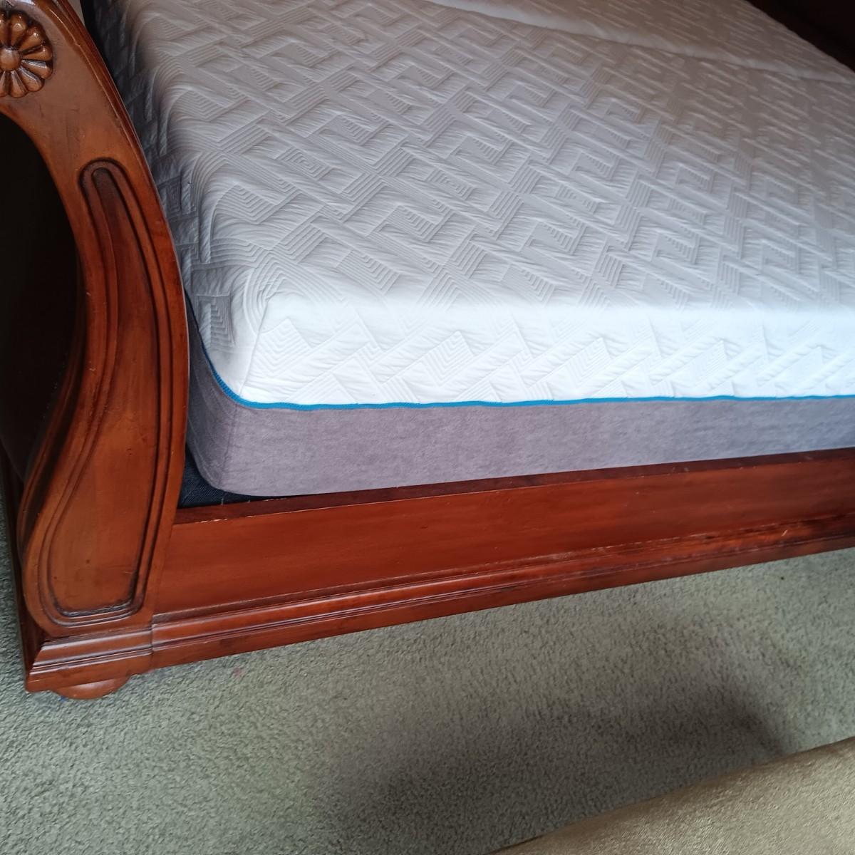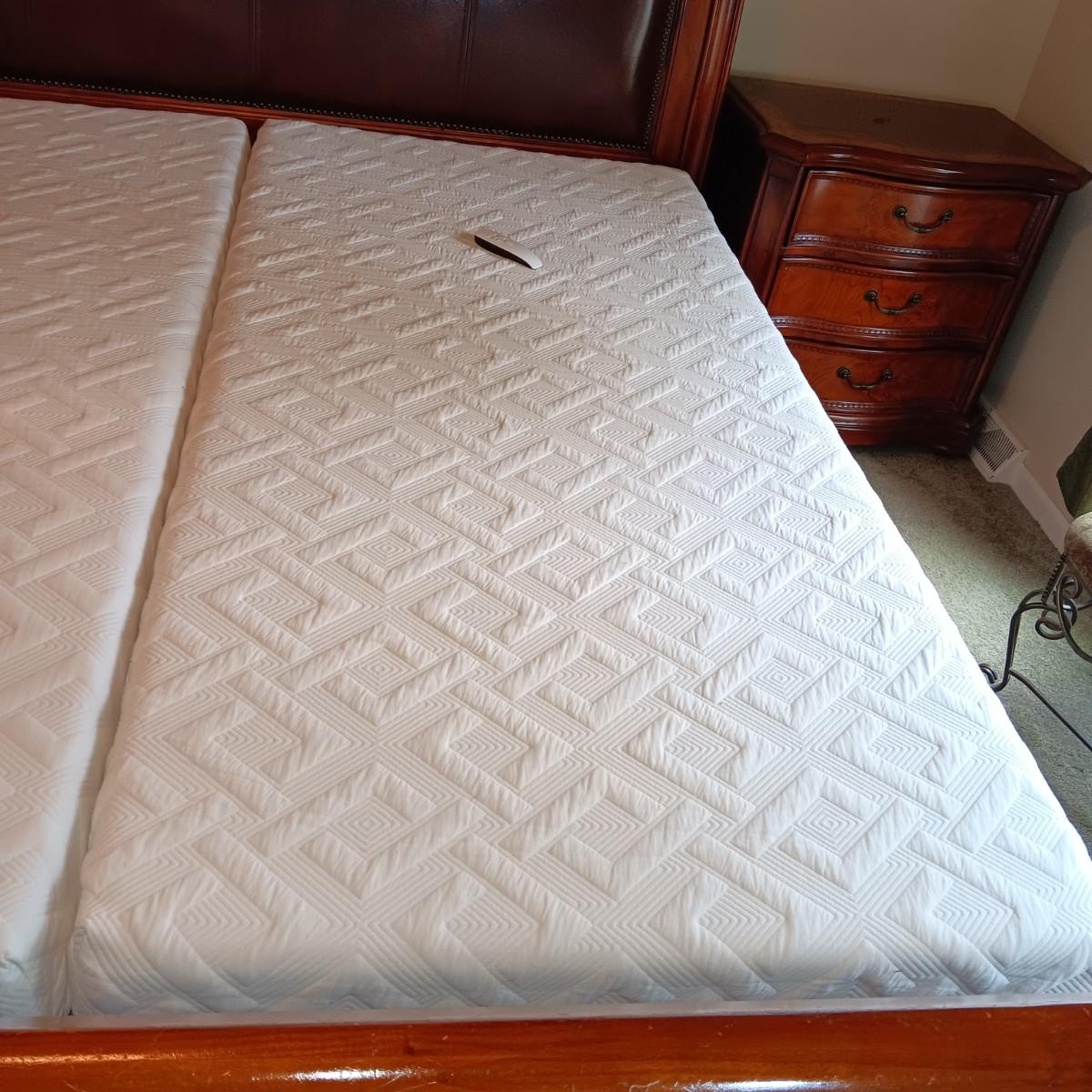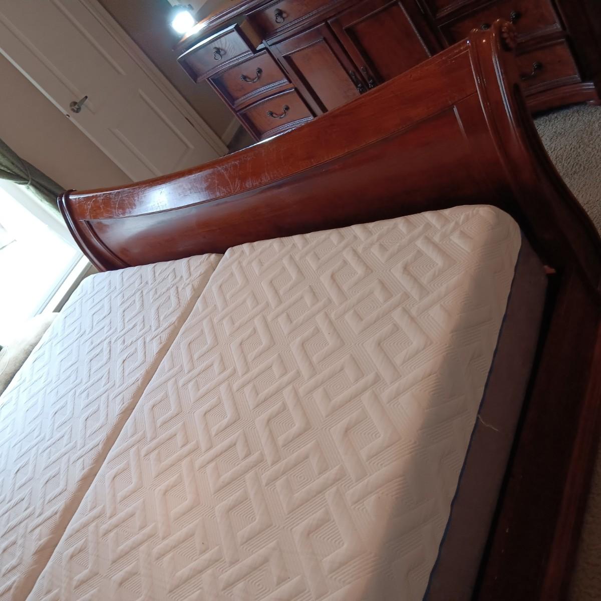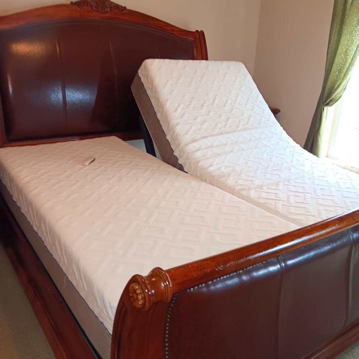 CLEAN BEAUTYREST SOUTH BAY INT. DUAL ELECTRIC ADJUSTABLE FOAM MATTRESSES W/A WOOD AND LEATHER SLEIGH BED FRAME