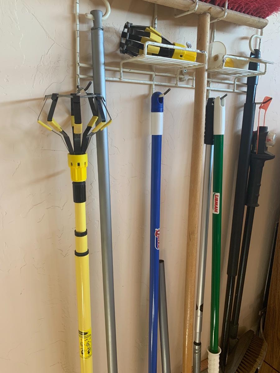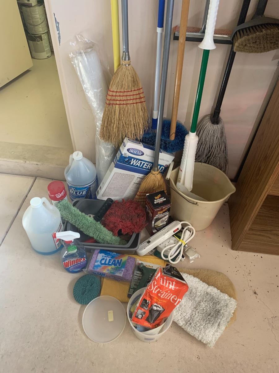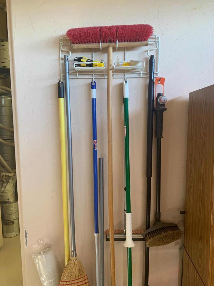 Lot of cleaning supplies, including light bulb extension rod, brooms etc.